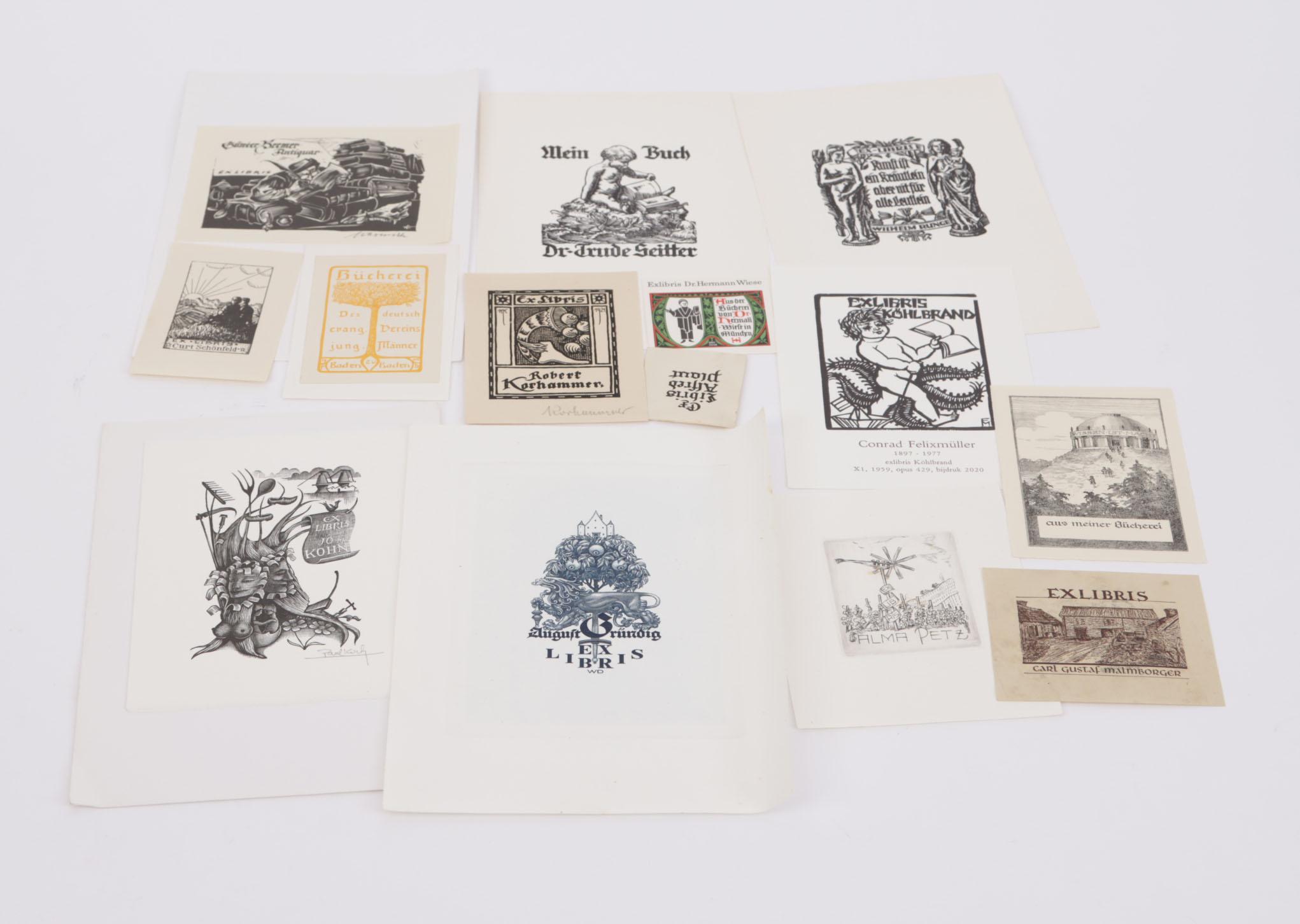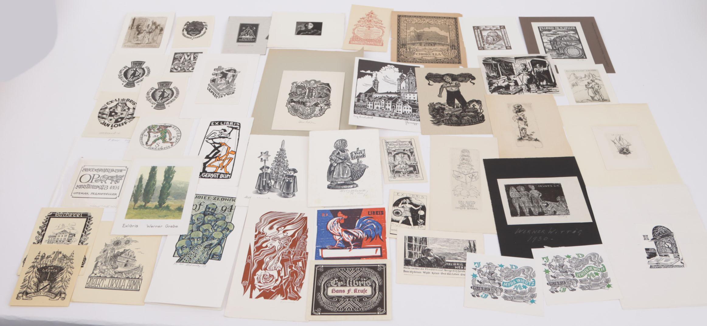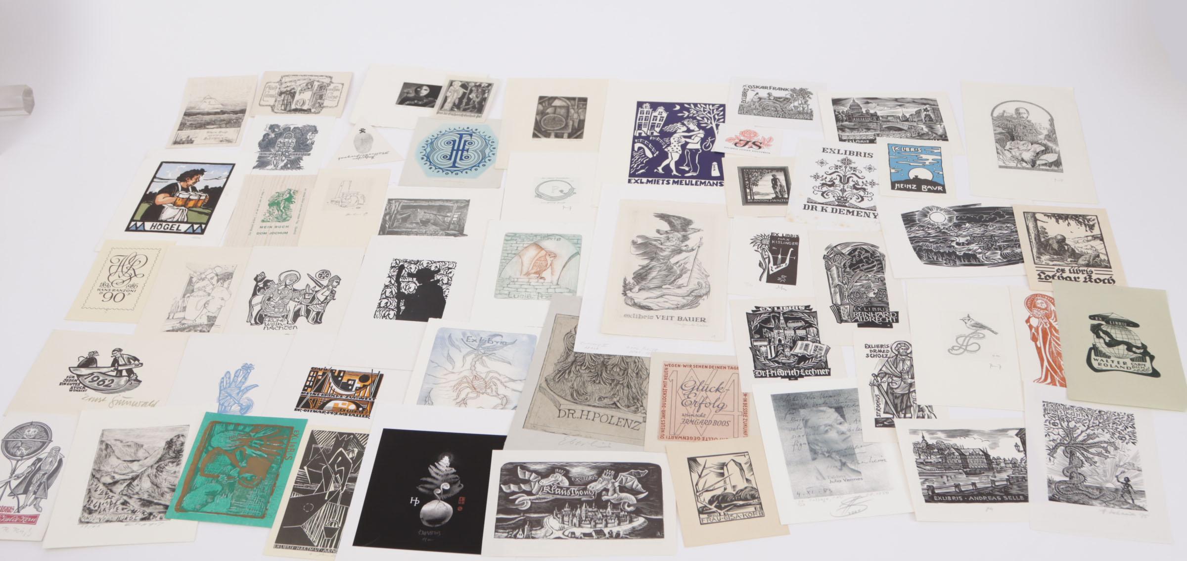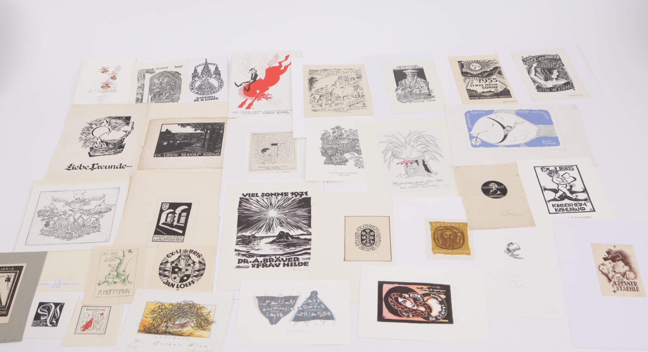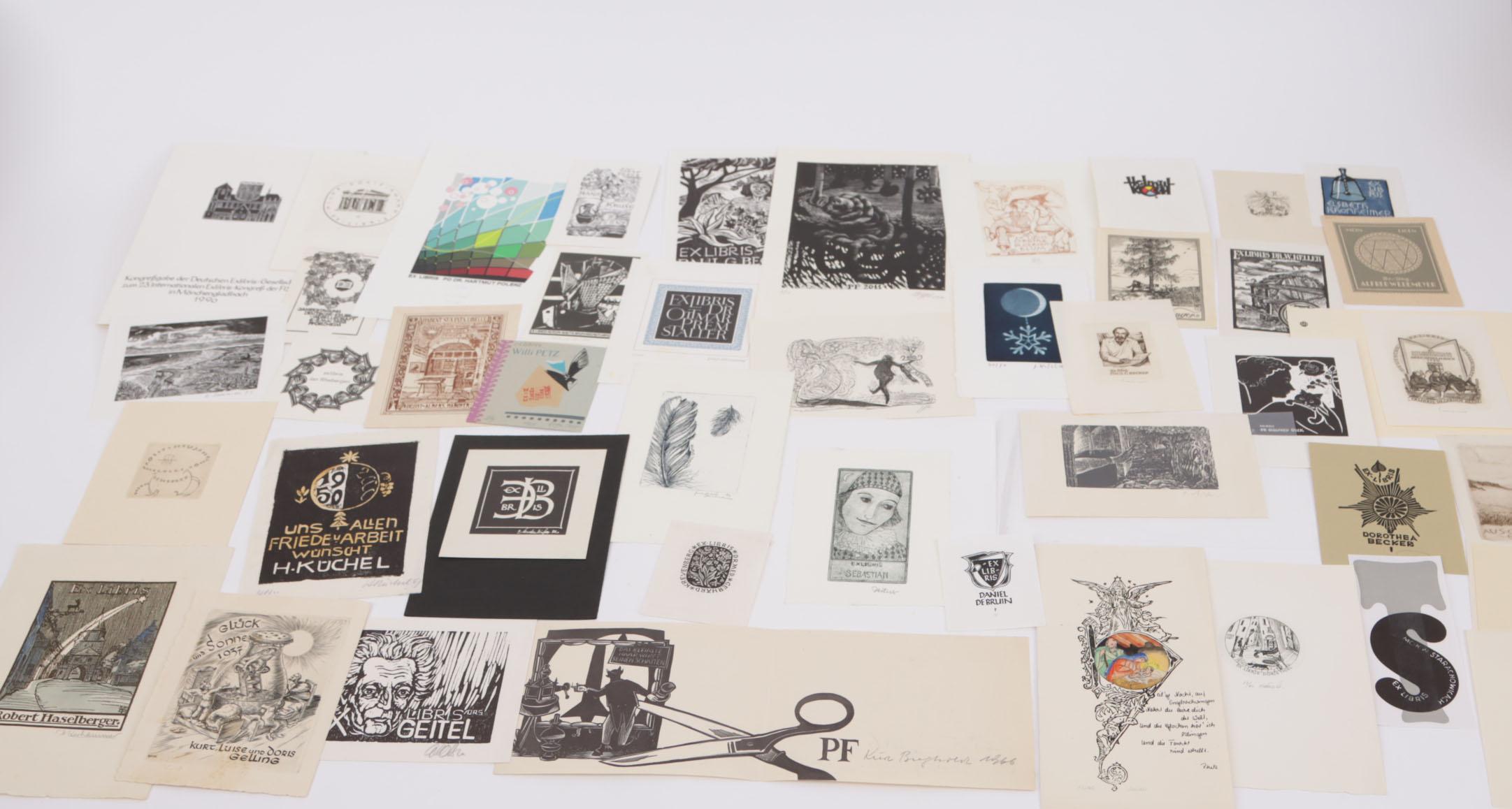 collectie Duitse en Zwitserse exlibris en kleingrafiek, diverse technieken, deels opgeplakt, deels gesigneerd (o.a. Naumann, Stauf, Tilgner, Dachauer, Warnecke, Preuss, Boetel, Wolbrandt, Koch, Pilz, Riess, Volkamer, Franke, Beier, Hirsch, Schmidt, Rusch)