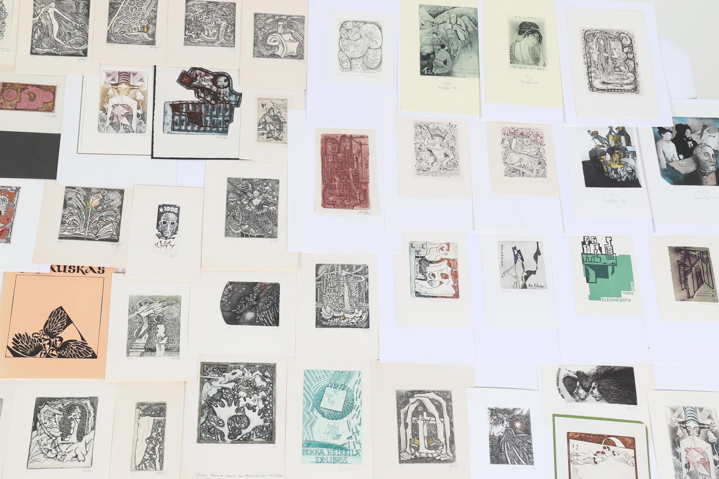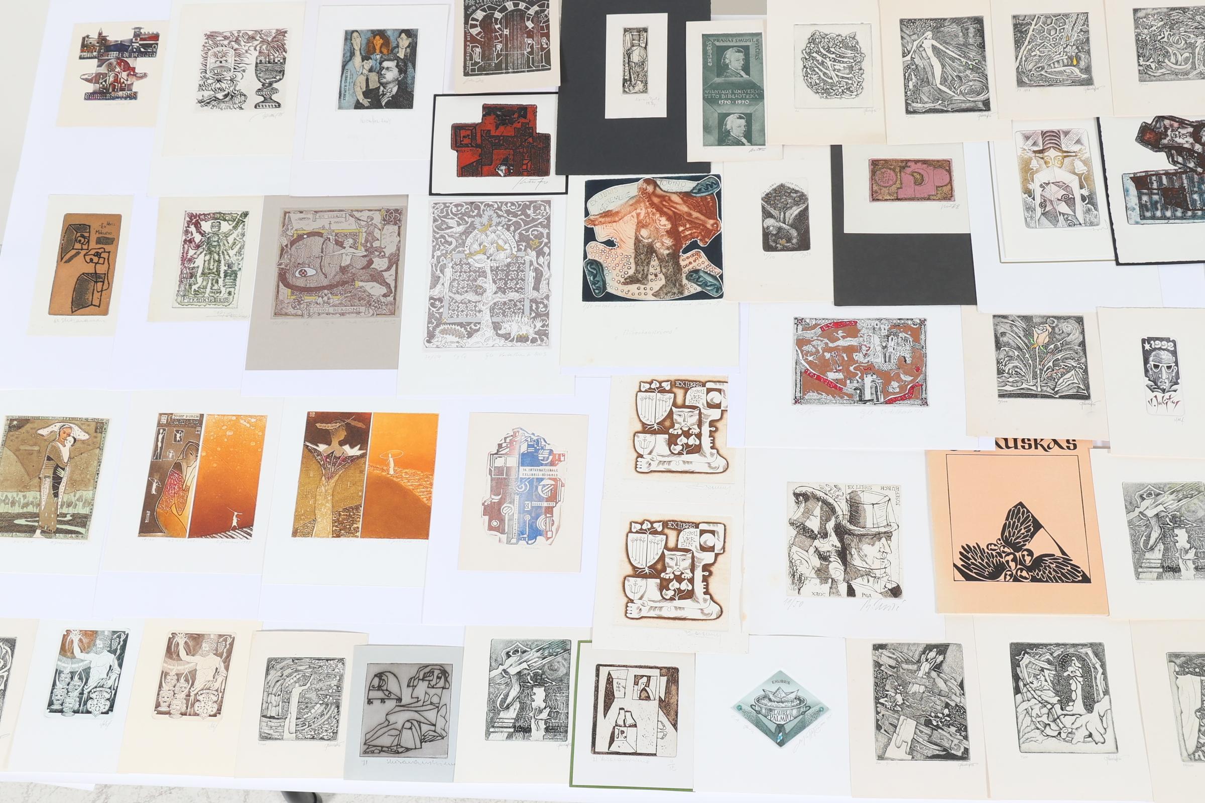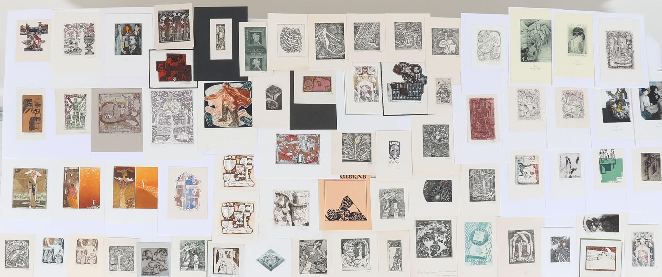 collectie van plm. 75 exlibris, gemaakt door kunstenaars uit Estland, Letland. Litauen. Diepdrukken, deels gesigneerd, deels opgeplakt. O.a. Kisauraskas, Saltenyte, Cepauskas, Didelyte, Jakstas, Vaher, Valjal, Vertelkeite, Kmieliauskate, Chernetsova, Danute.