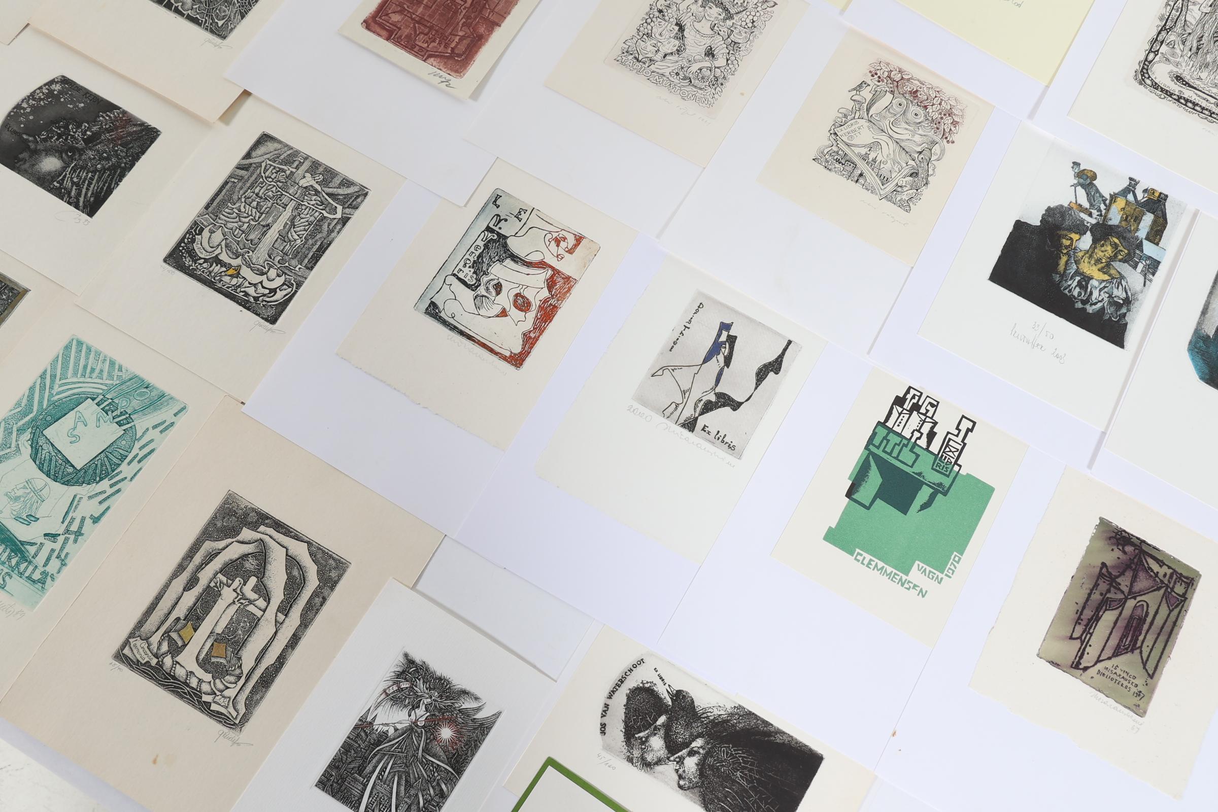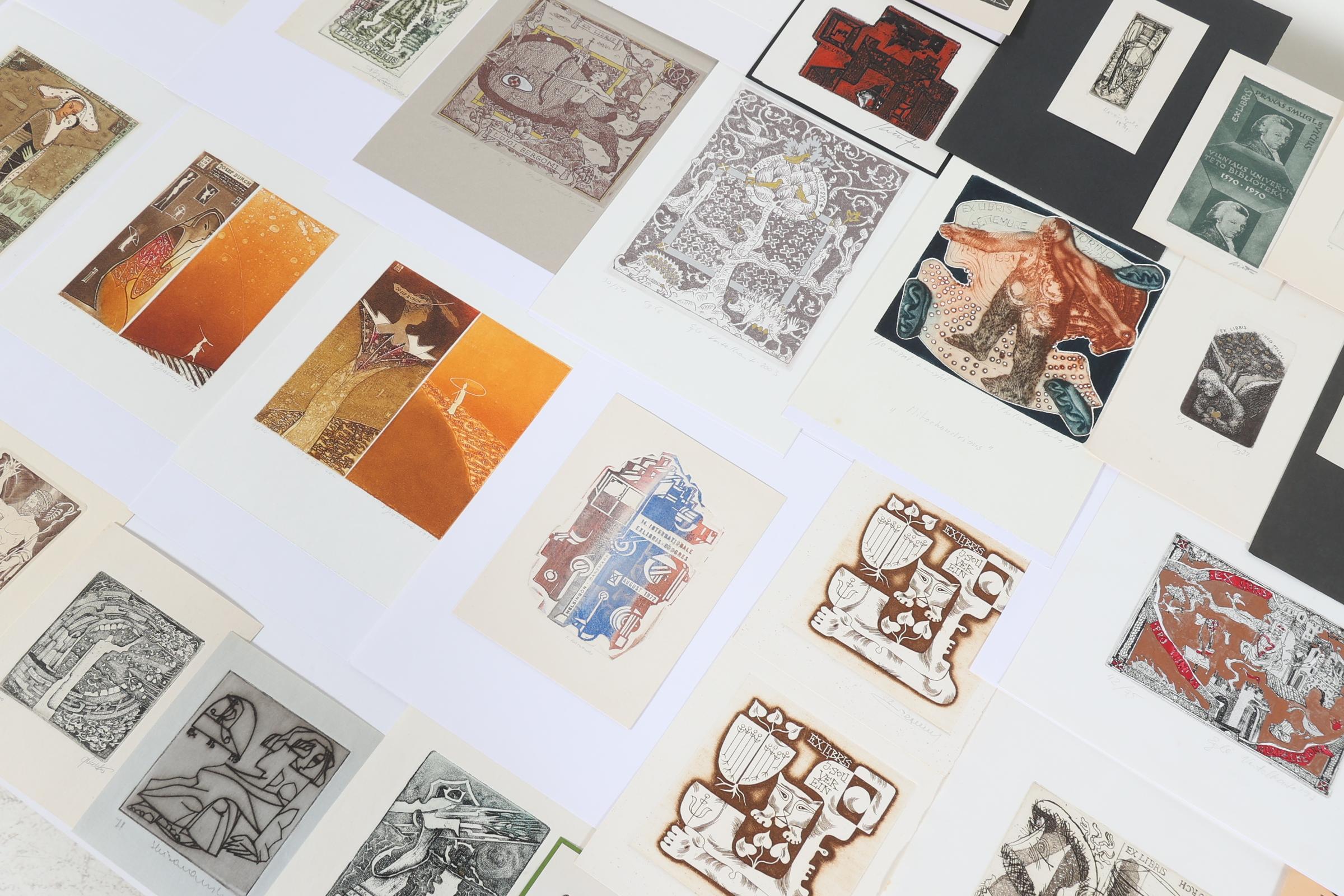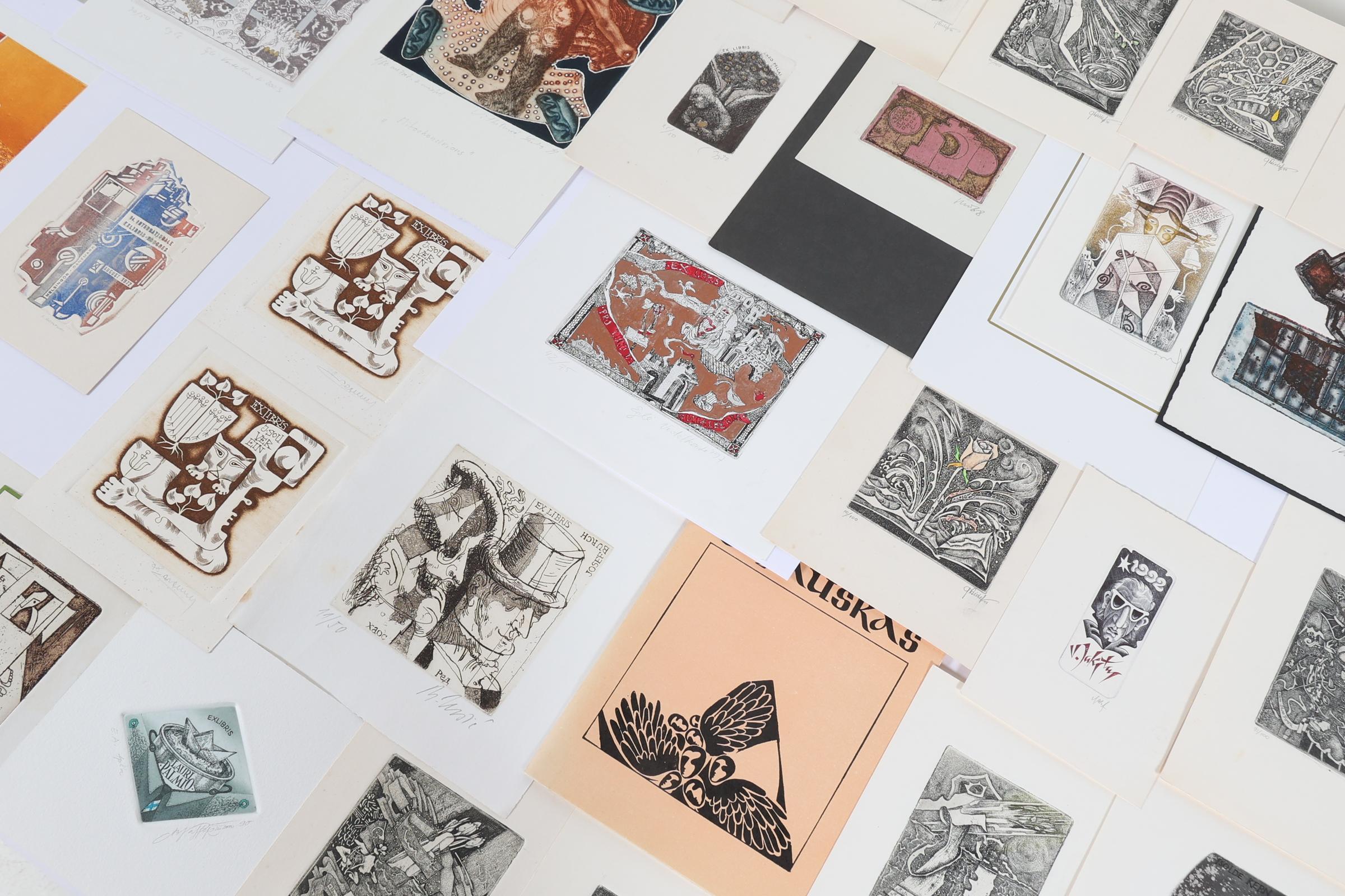 collectie van plm. 75 exlibris, gemaakt door kunstenaars uit Estland, Letland. Litauen. Diepdrukken, deels gesigneerd, deels opgeplakt. O.a. Kisauraskas, Saltenyte, Cepauskas, Didelyte, Jakstas, Vaher, Valjal, Vertelkeite, Kmieliauskate, Chernetsova, Danute.