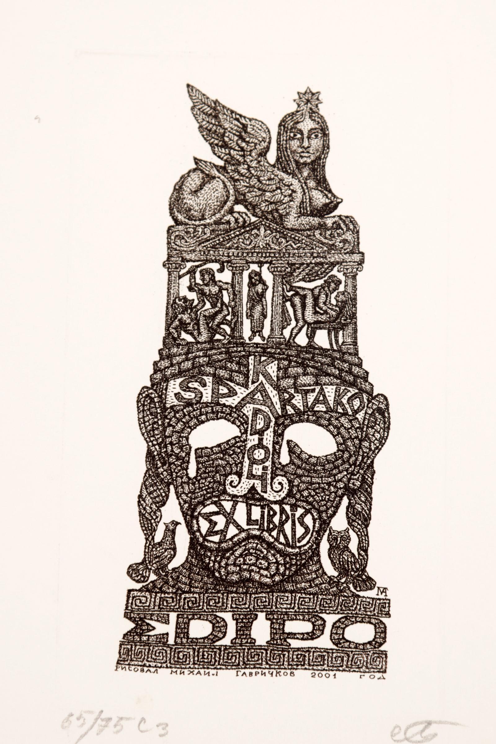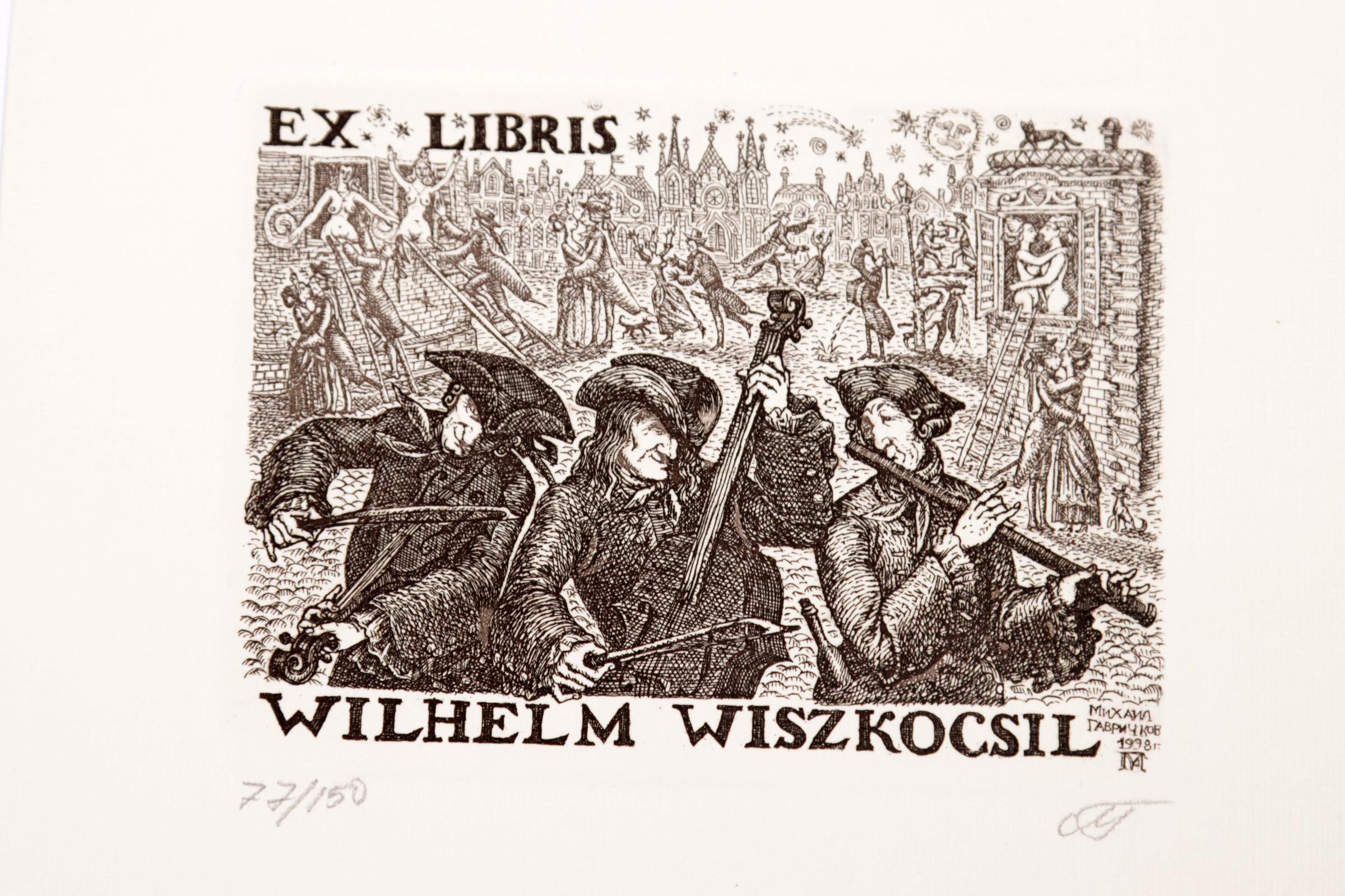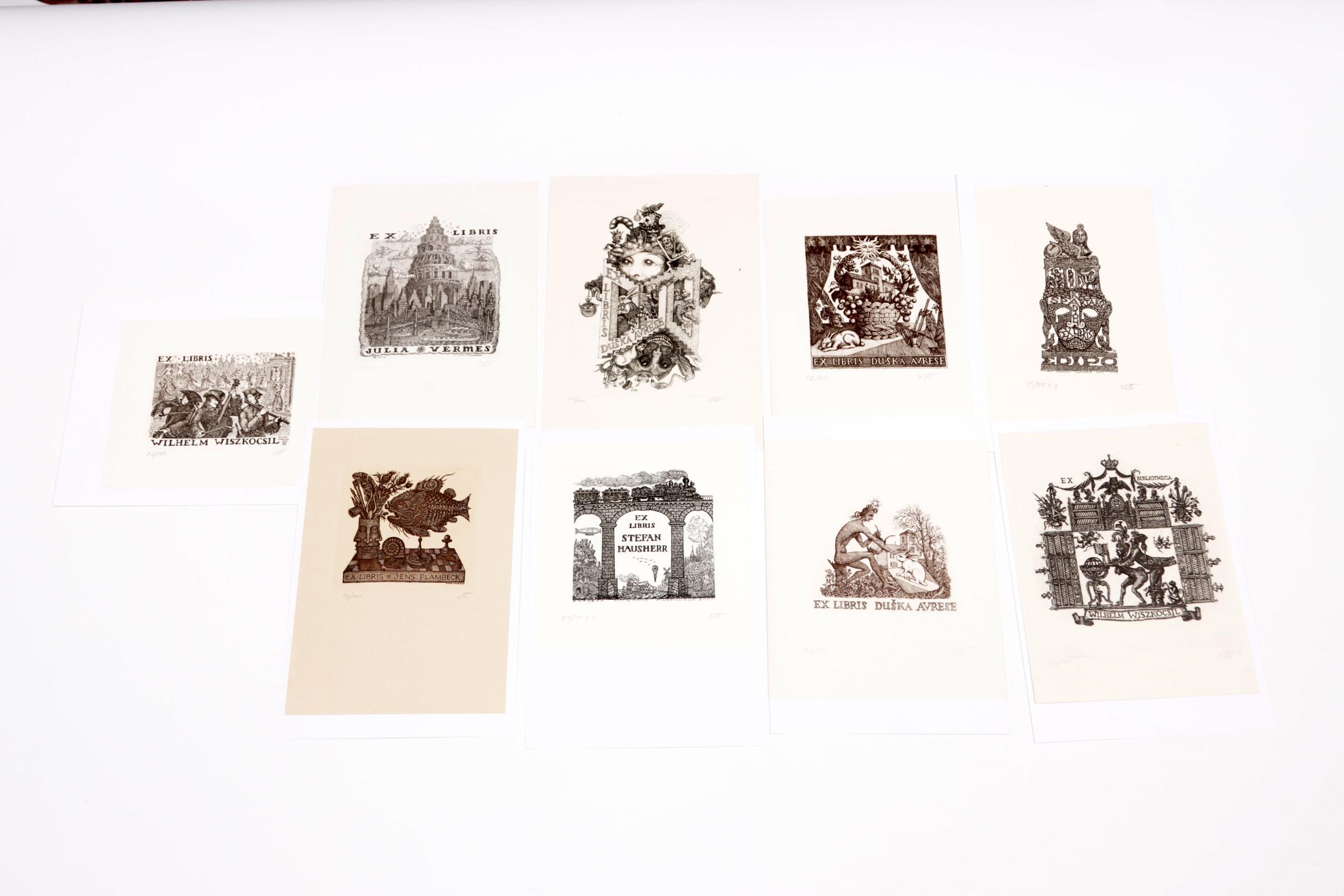 Gravichkov, M, 9 exlibris, C3, genummerd en gesigneerd, opgeplakt (o.a. voor Wiszkocsil, Vermes, Plambeck, Edipo, Avrese)