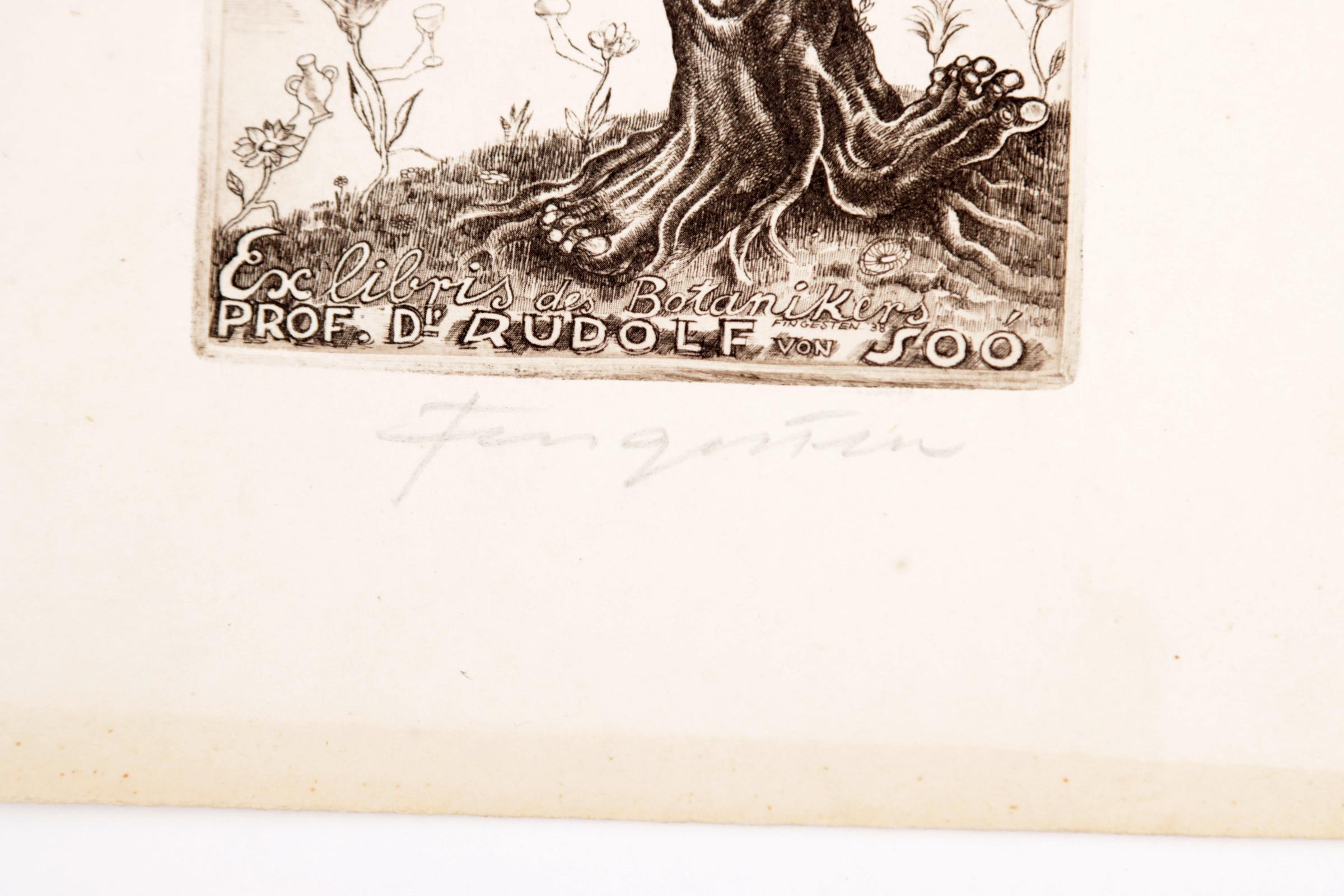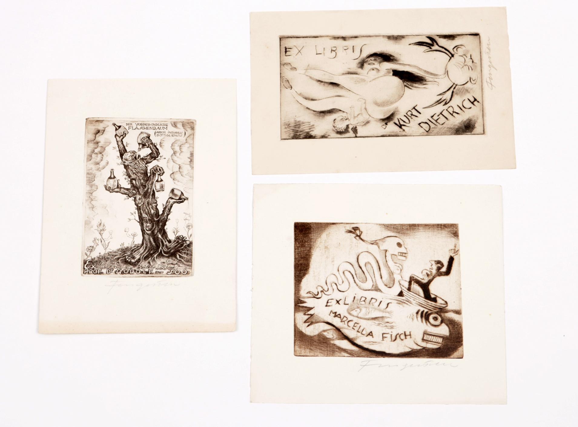 Fingesten, M, 3 exlibris (Kurt Diettrich (erotisch), Marcella Fisch, prof Rudolf von Soo), C3, gesigneerd, opgeplakt (geweest)