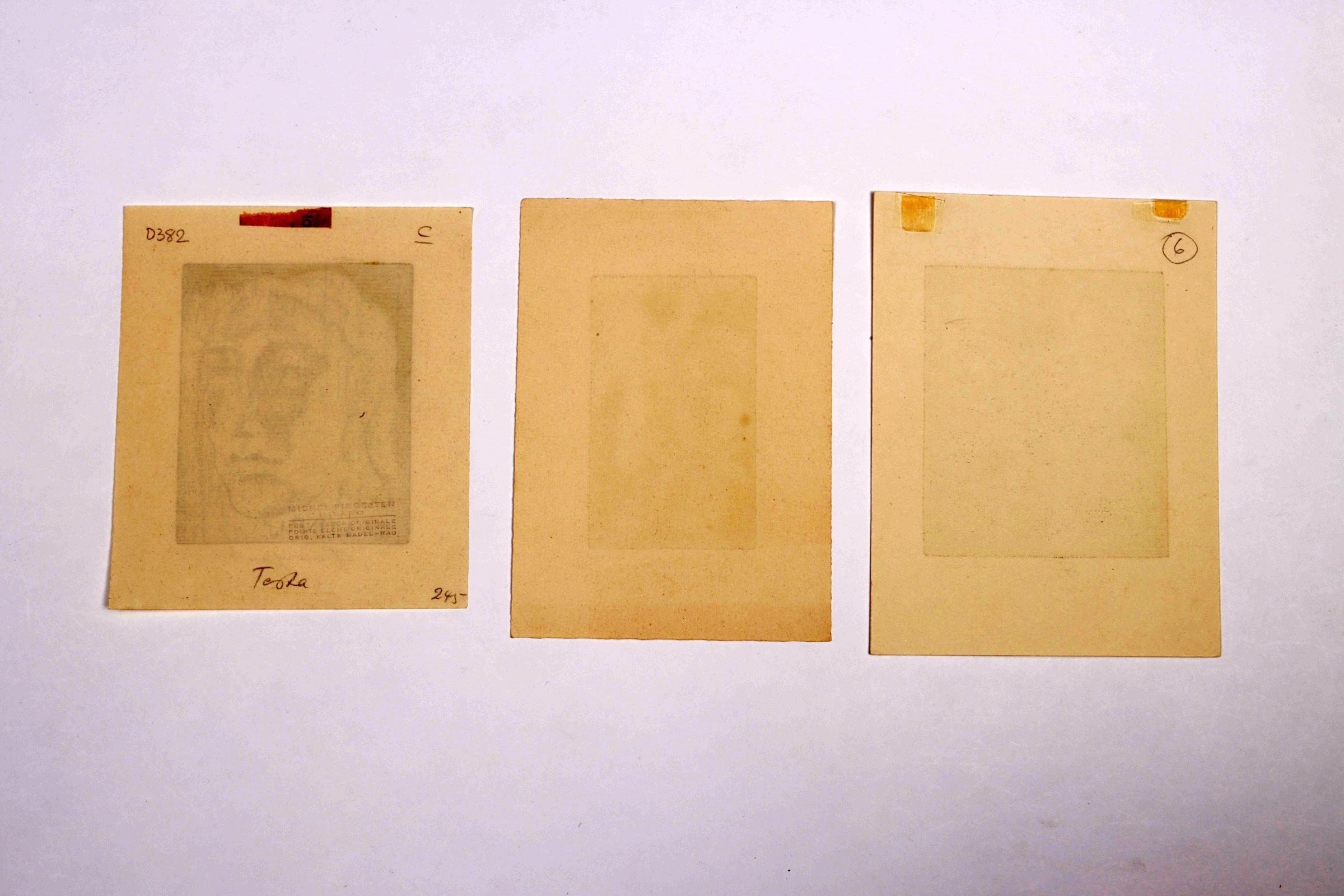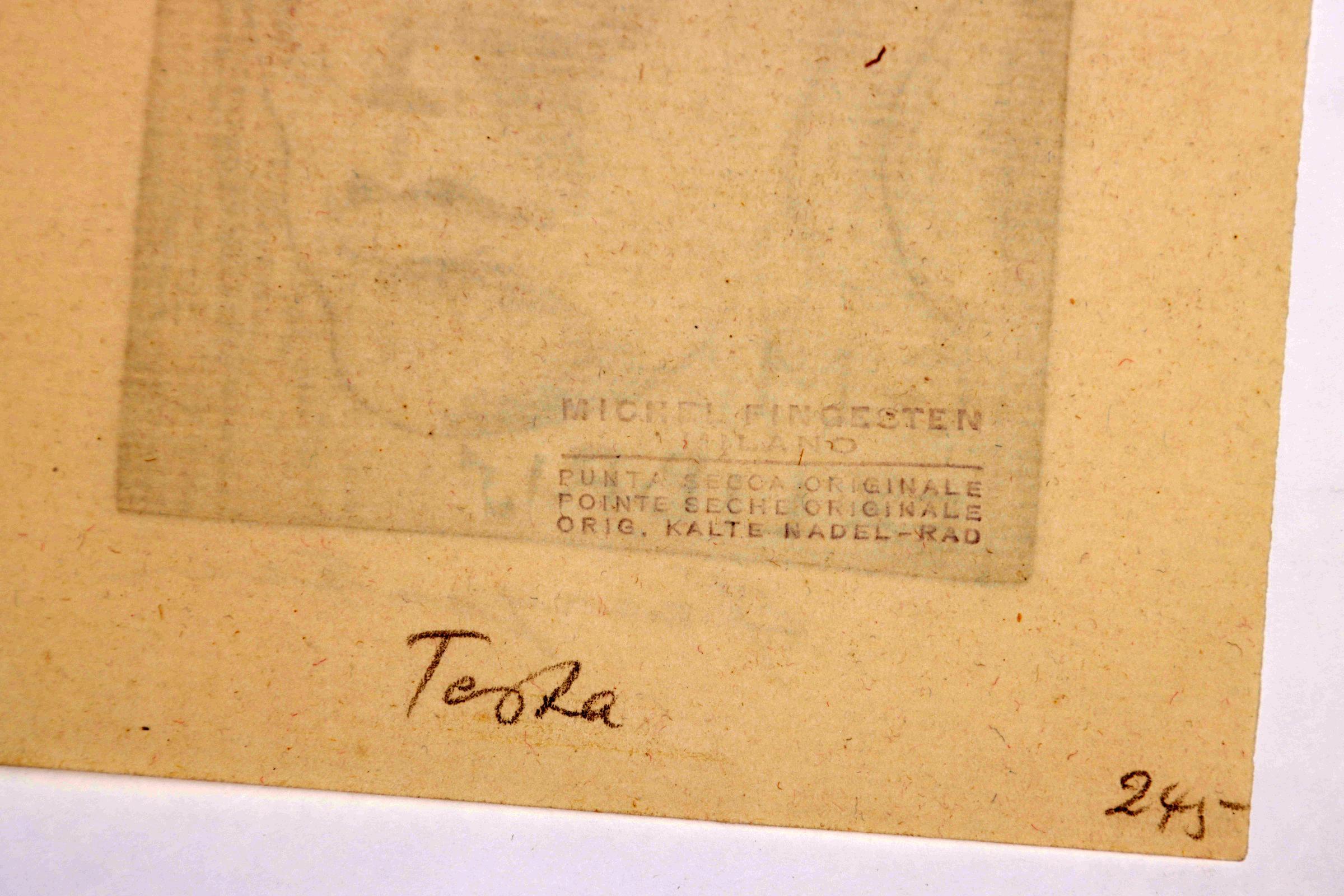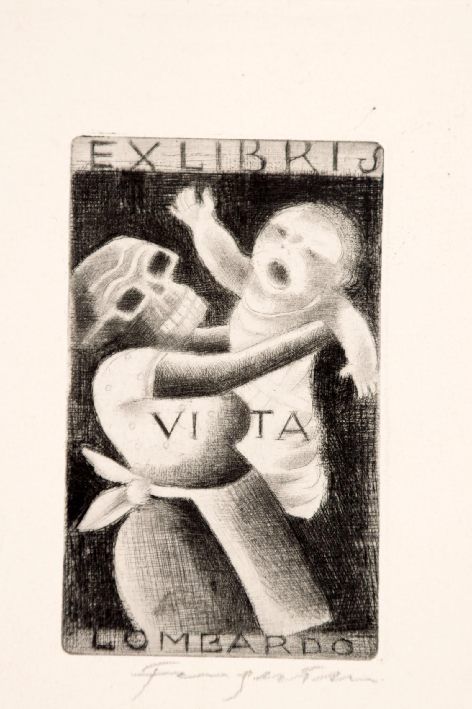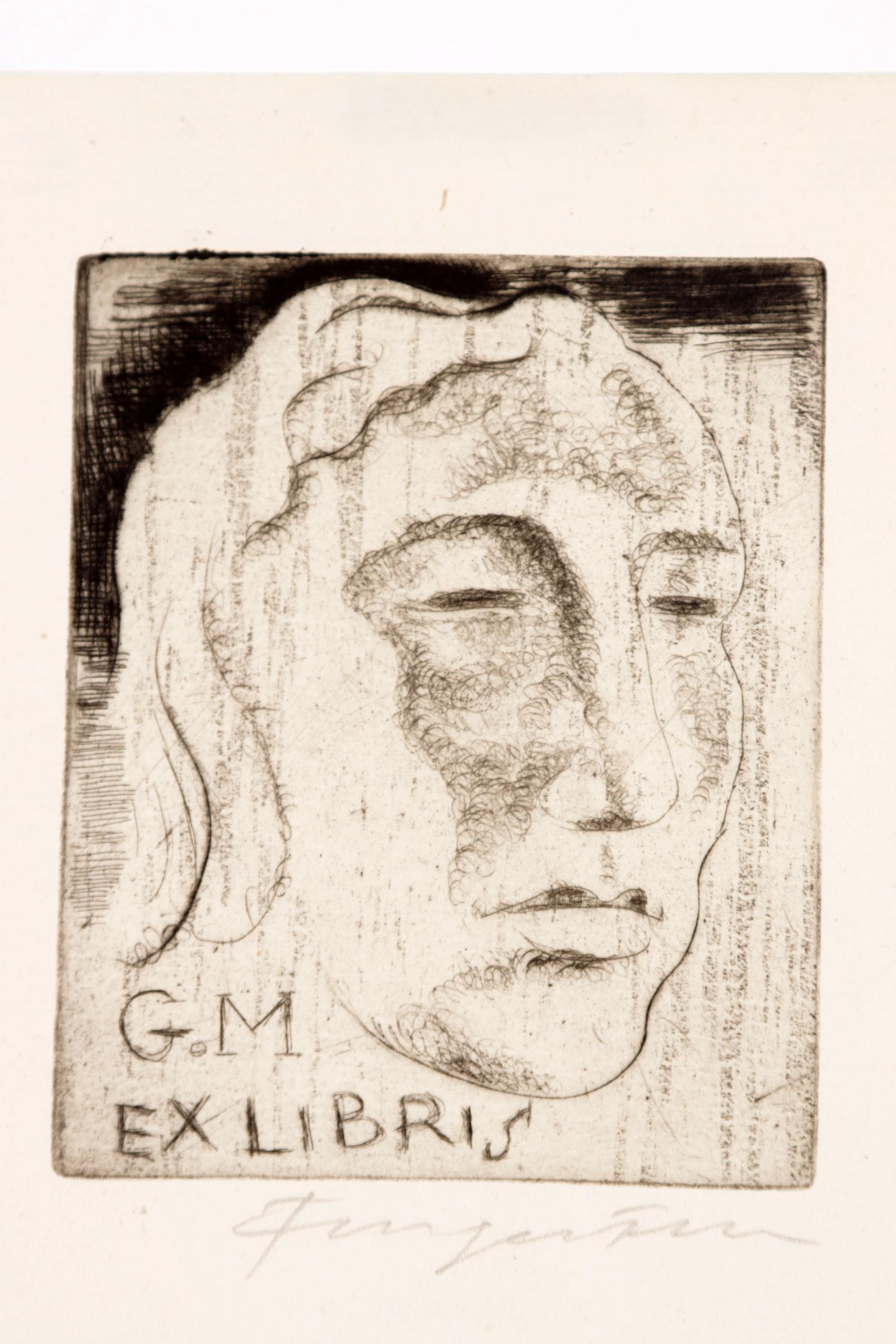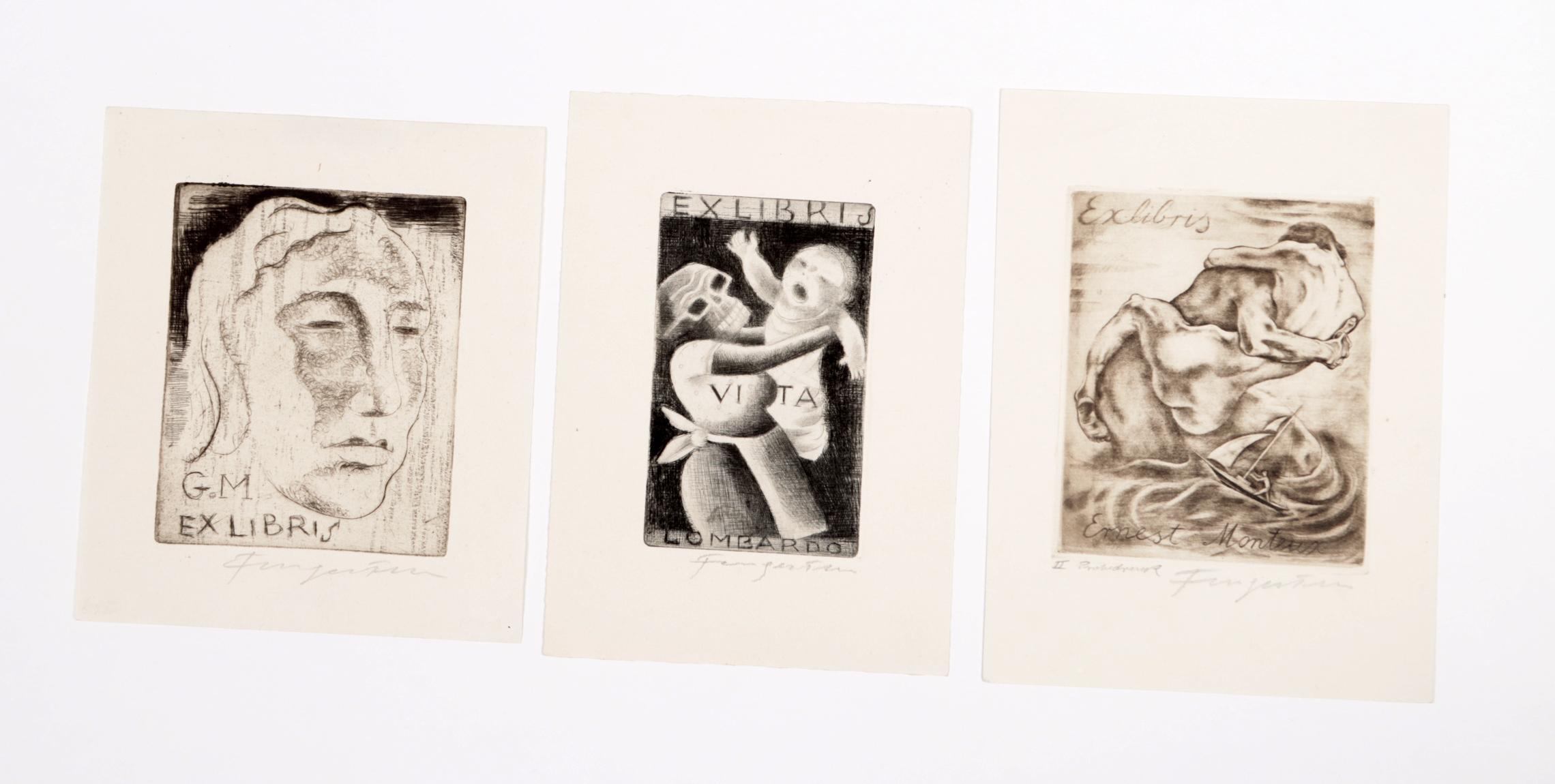 Fingesten, M, 3 exlibris (Lombardo, G.M., Ernest Monteux), C3, gesigneerd, opgeplakt (geweest)