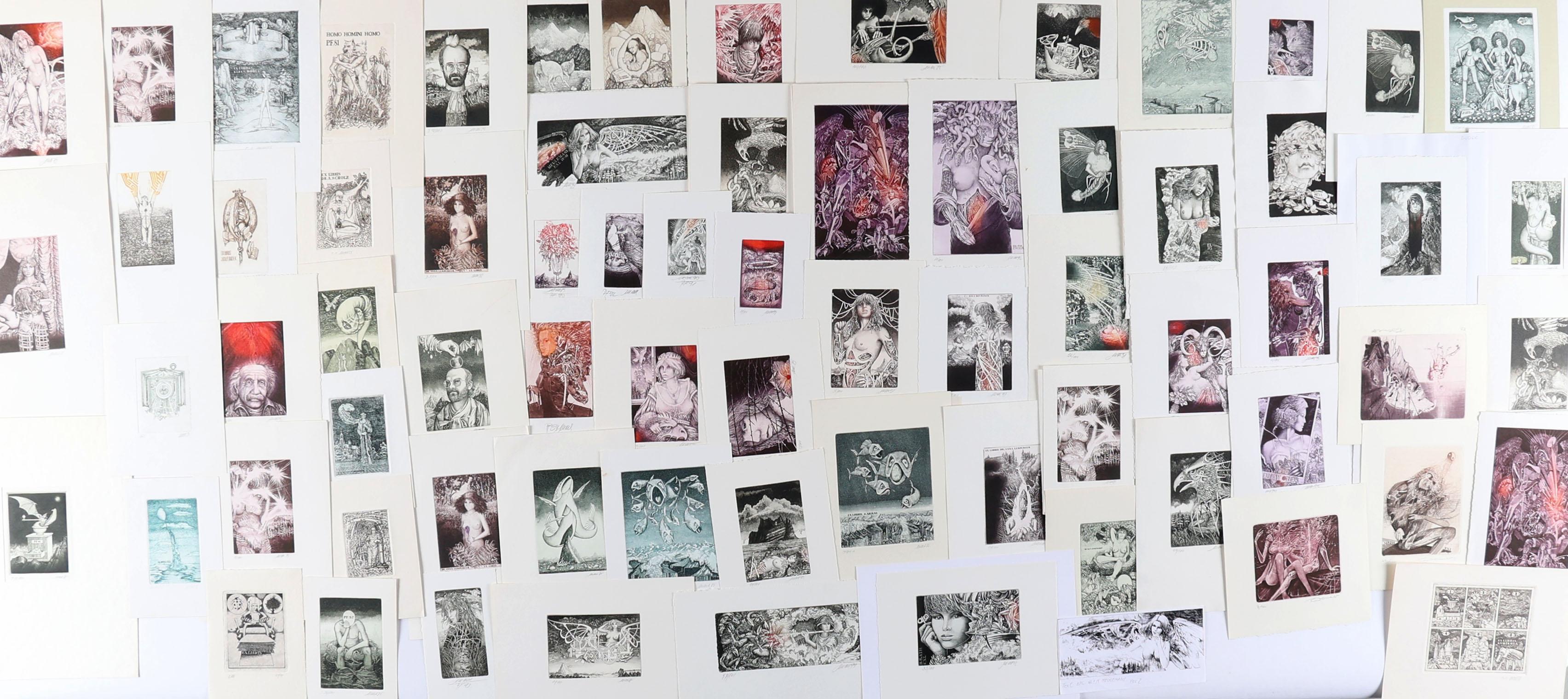 Dudek, J., plm. 65 exlibris / kleingrafiek plus plm. 10 exlibris op naam van Meulemans - 2 verschillende (restoplage), C3C5, genummerd en gesigneerd