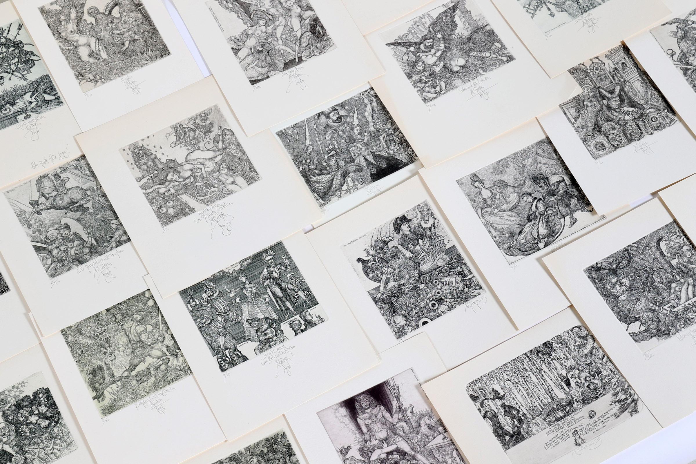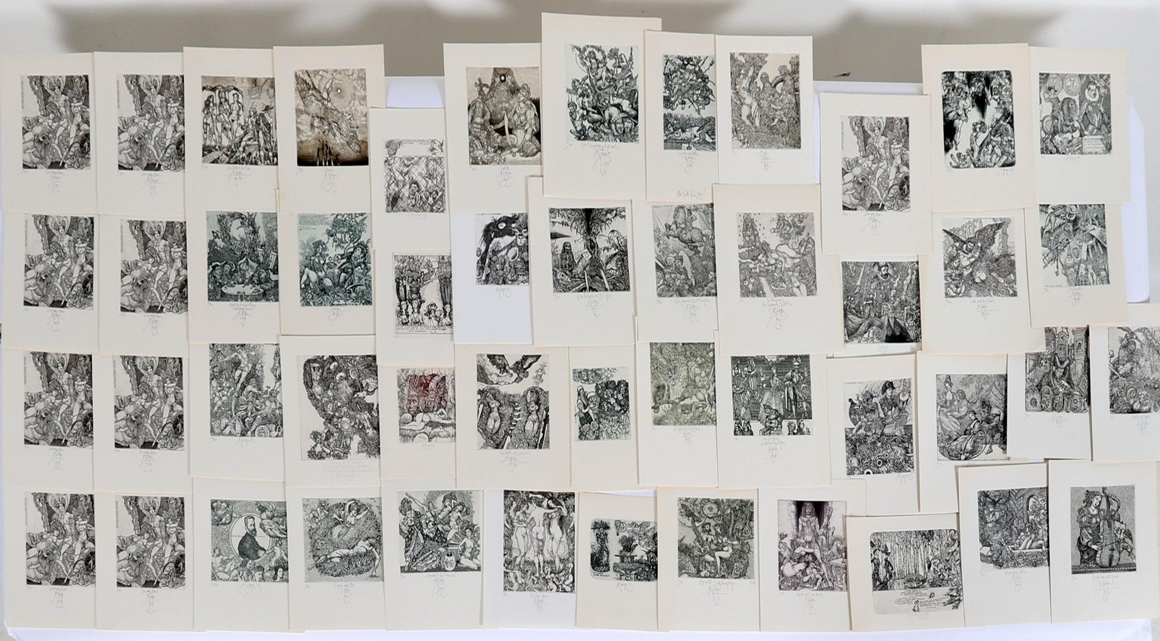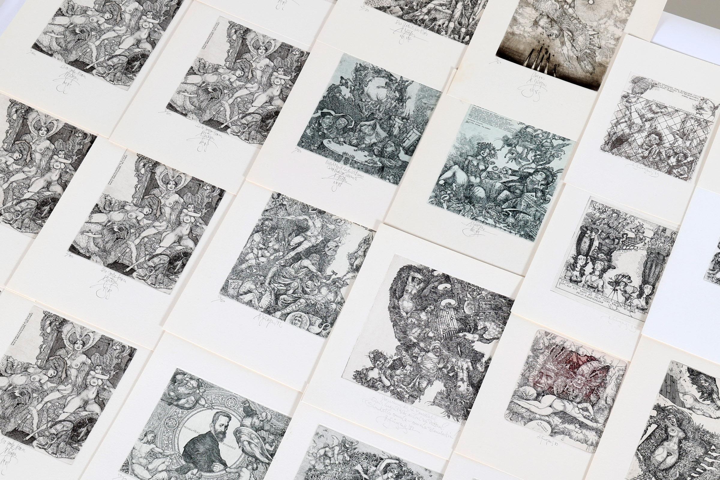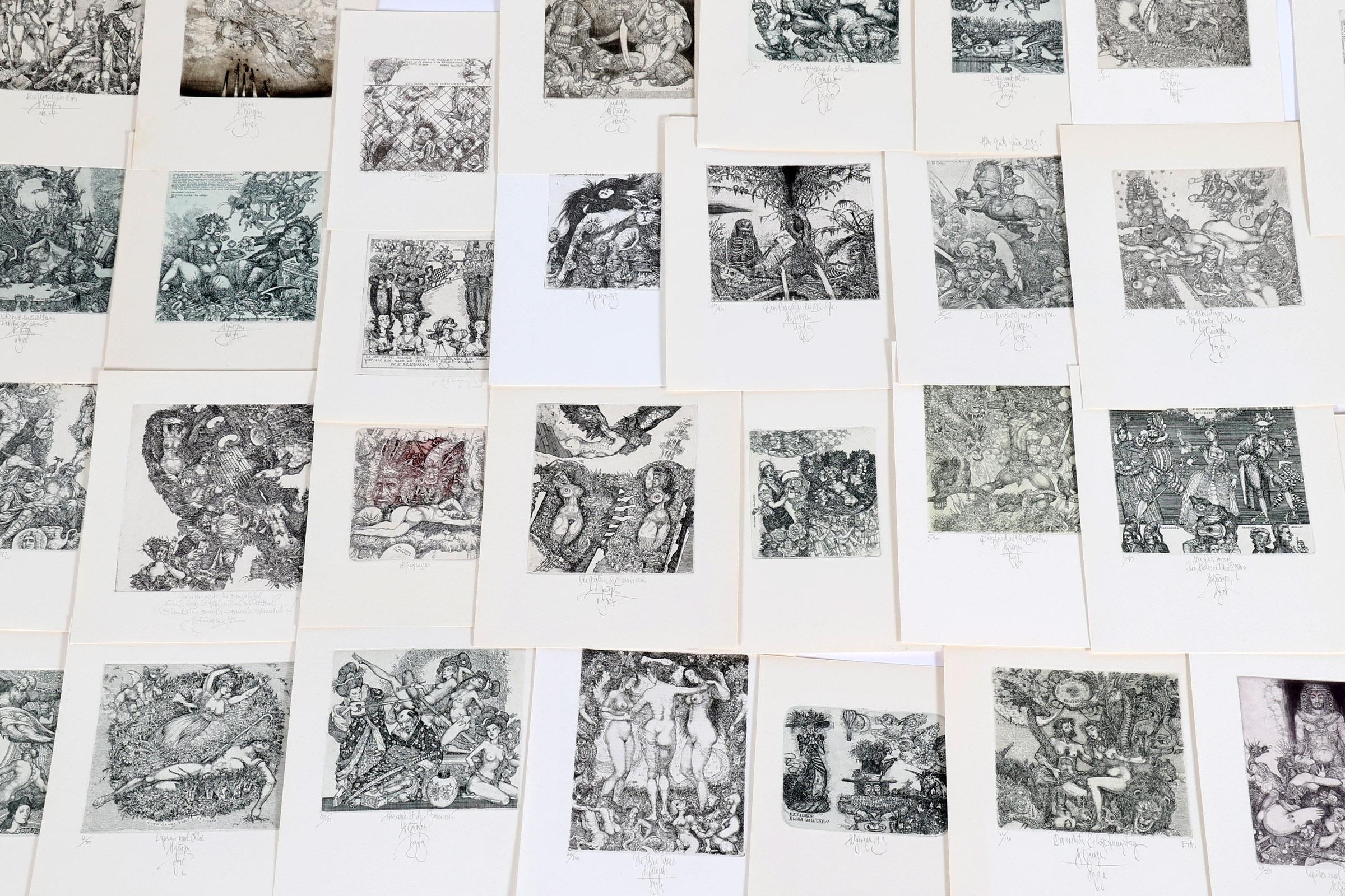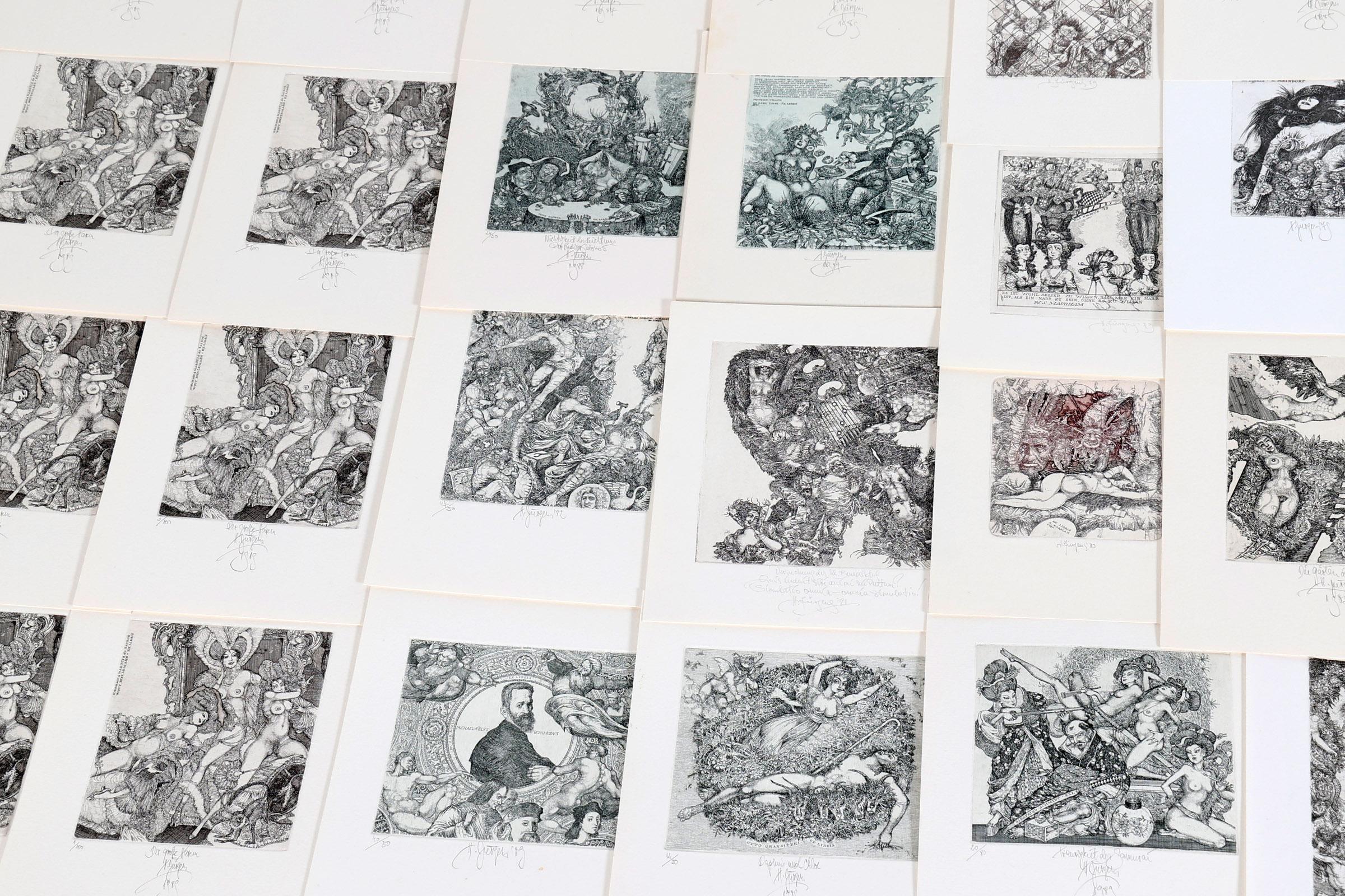 Juergens, H., 50 exlibris, C3, genummerd en gesigneerd, + 8 afdrukken van een exlibris van Juergens voor Meulemans (oplage), C3, (Hommage a Marquis de Bayros)