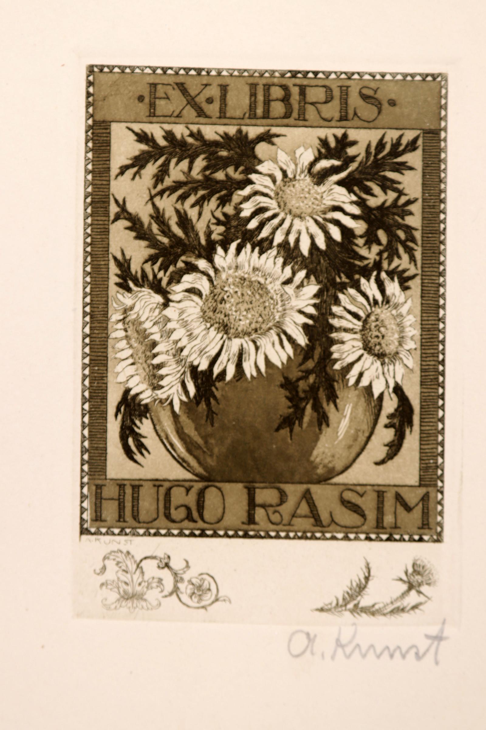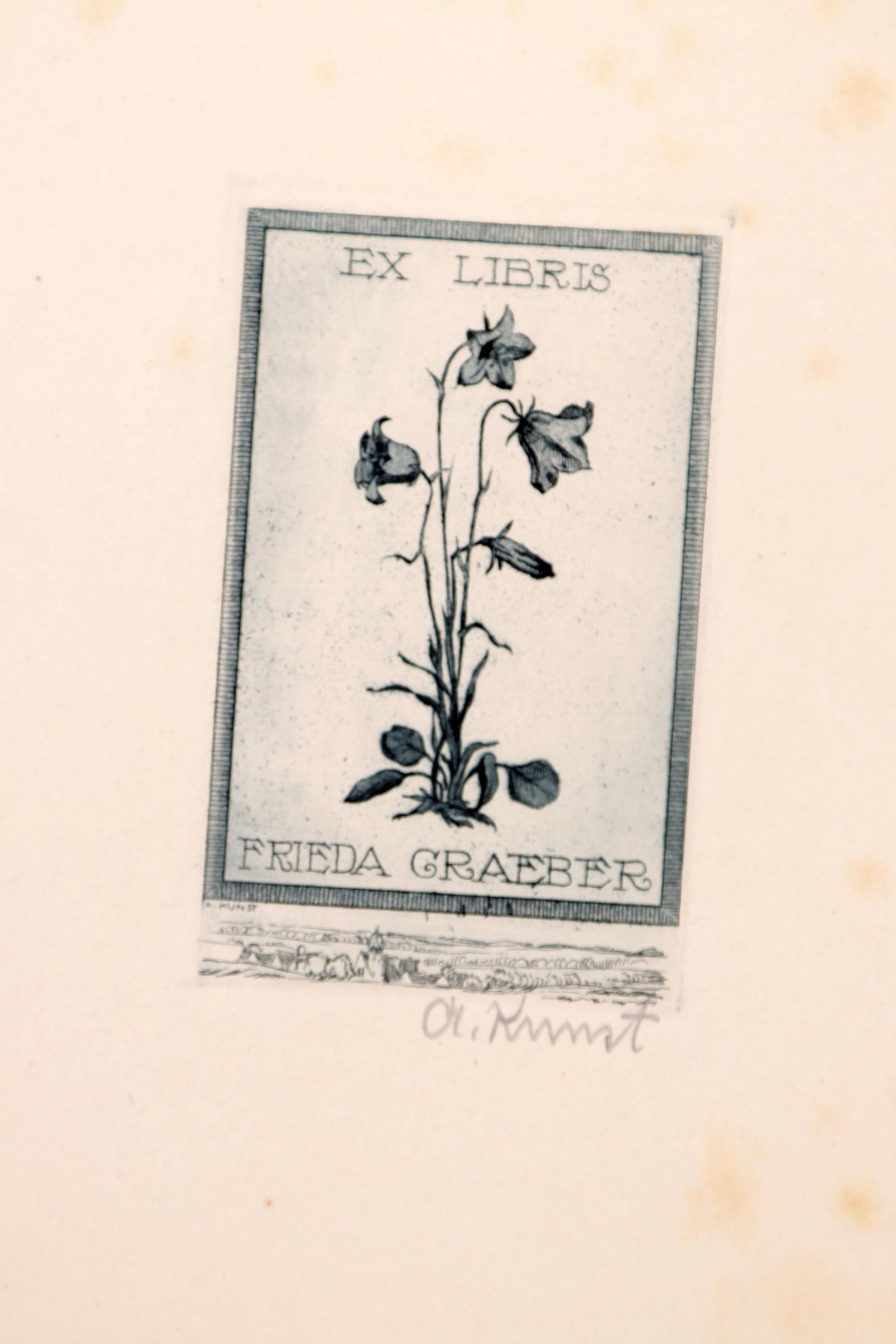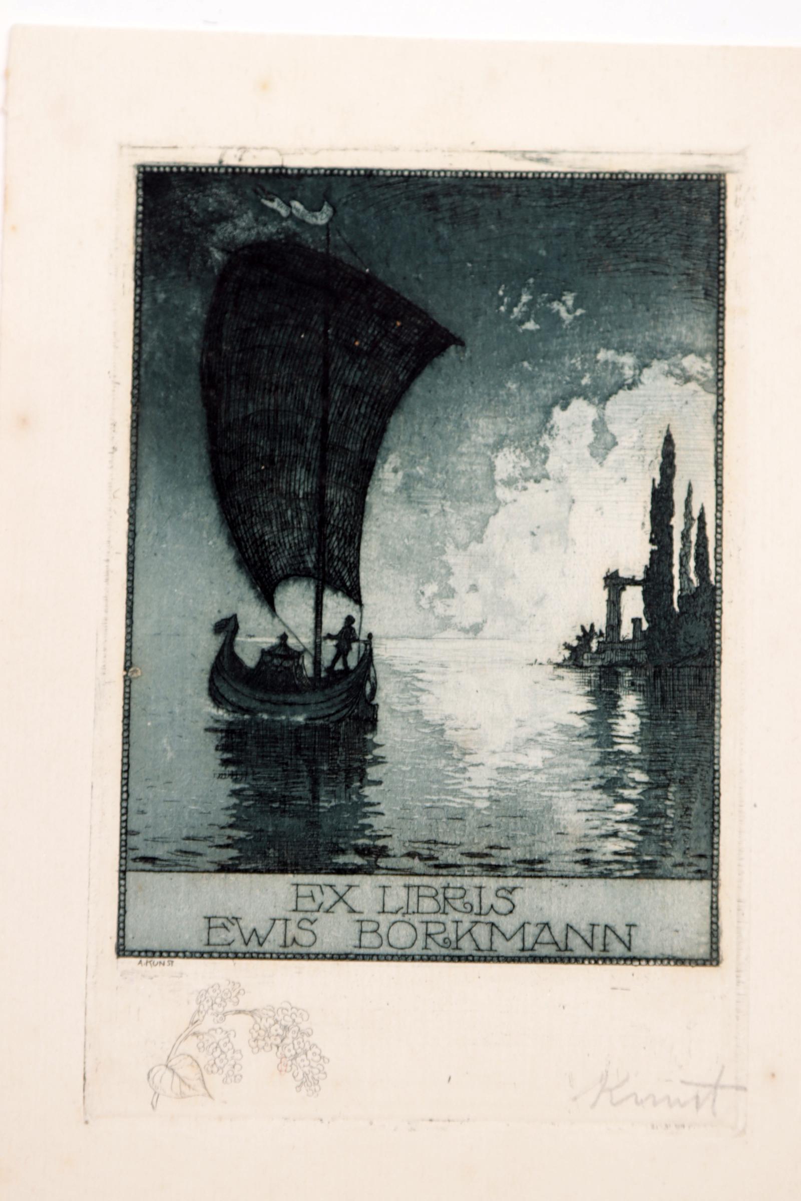 Kunst, A., 10 exlibris, diverse technieken, met remarque, deels opgeplakt (geweest), 9 x gesigneerd. O.a. voor: Balinth, Koesters, Rasim, Wimmer, Vogel, Graf, Graeber, Borkmann, Hoefling