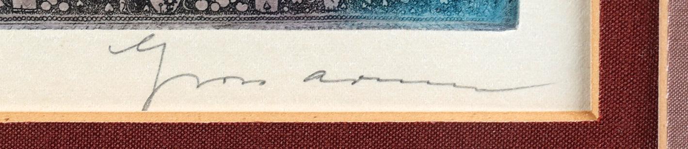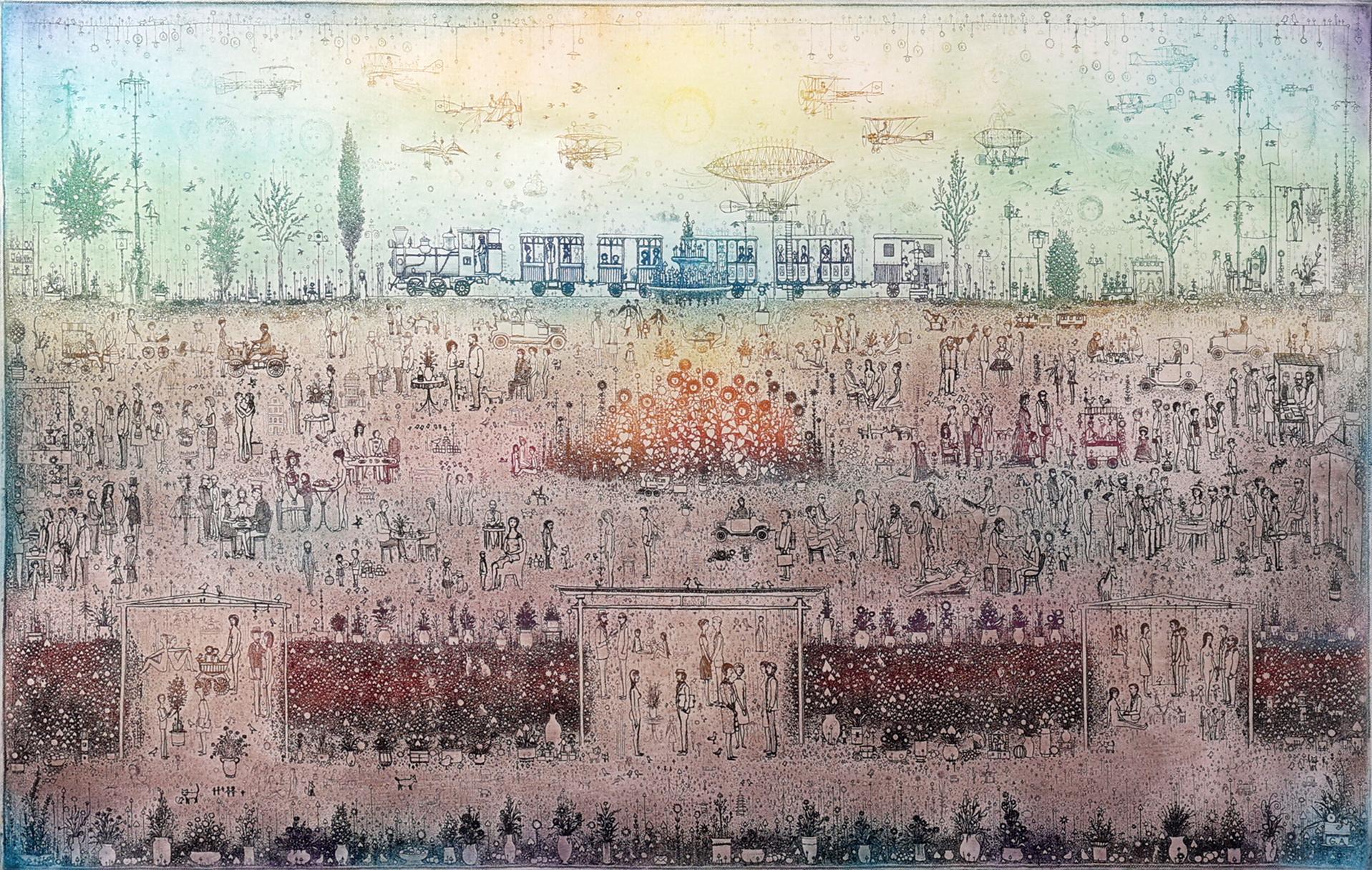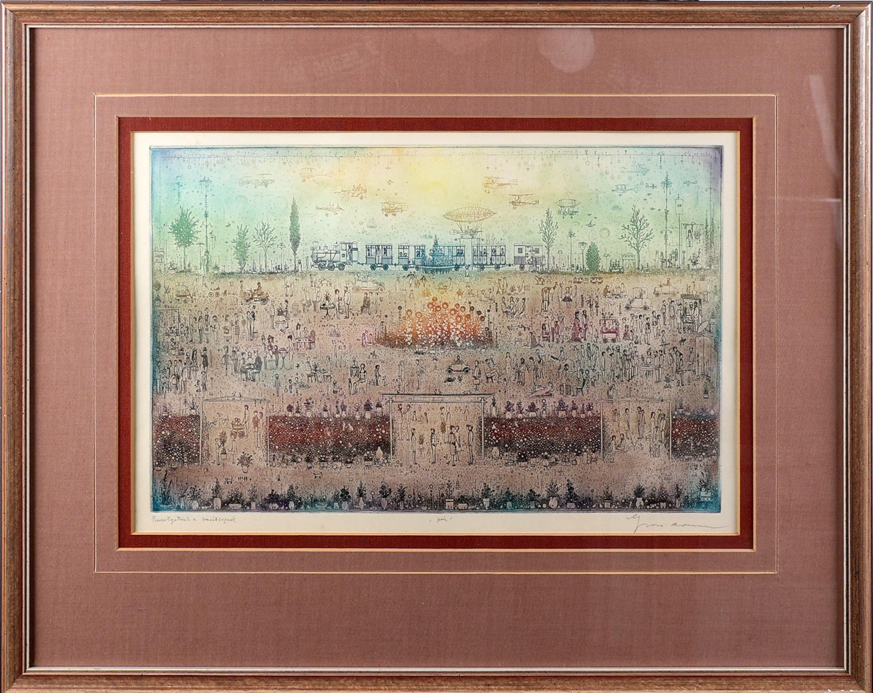Ond.gesign., Trein en personen, handgesigneerde kleurenets, 42 x 30 cm.