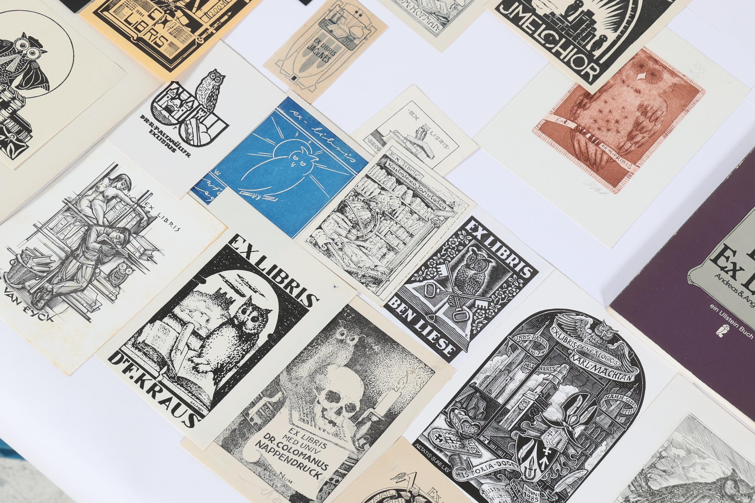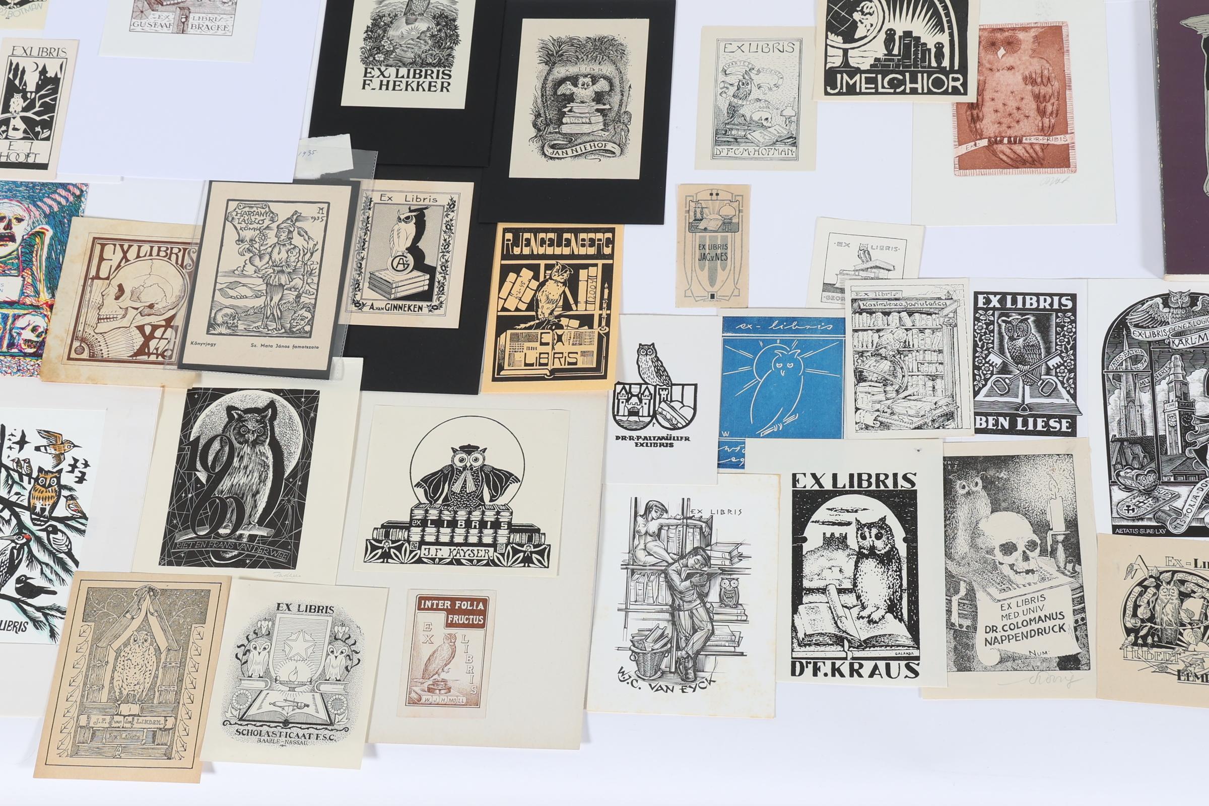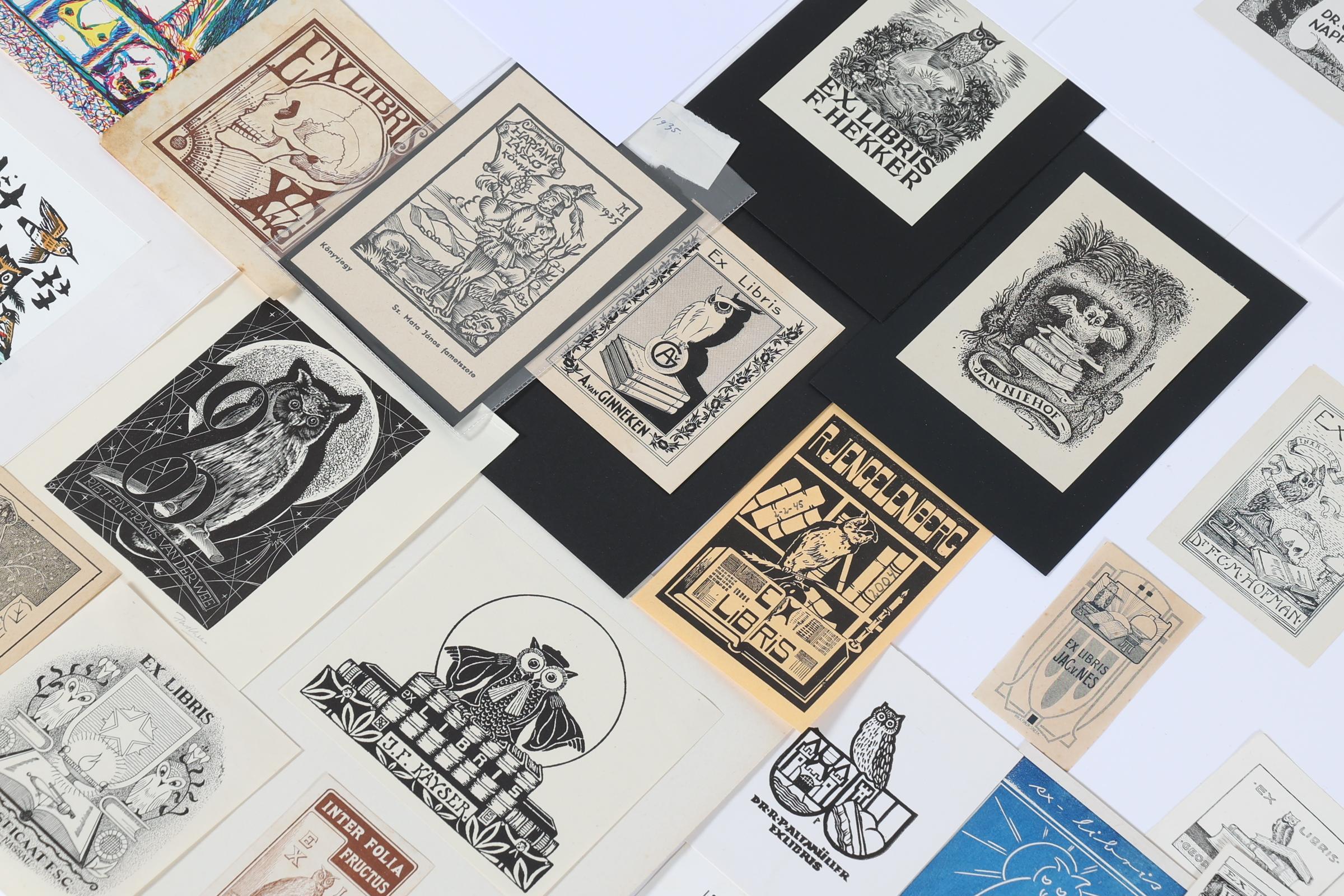 collectie van plm. 100 exlibris / kleingrafiek, thema: 'uilen', vooral hoogdruk, deels opgeplakt / gesigneerd. O.a. door Arndt, Agirba, Mauve, Gaudaen, Bulder, Drahos, Benes, Preusse, Jacobs, Vutovra, Koutny. Plus: 'Eulen-Exlibris', A. + A. Hopf, pocket, tekst in Duits, 128 pag., veel afbeeldingen, ook in kleur.