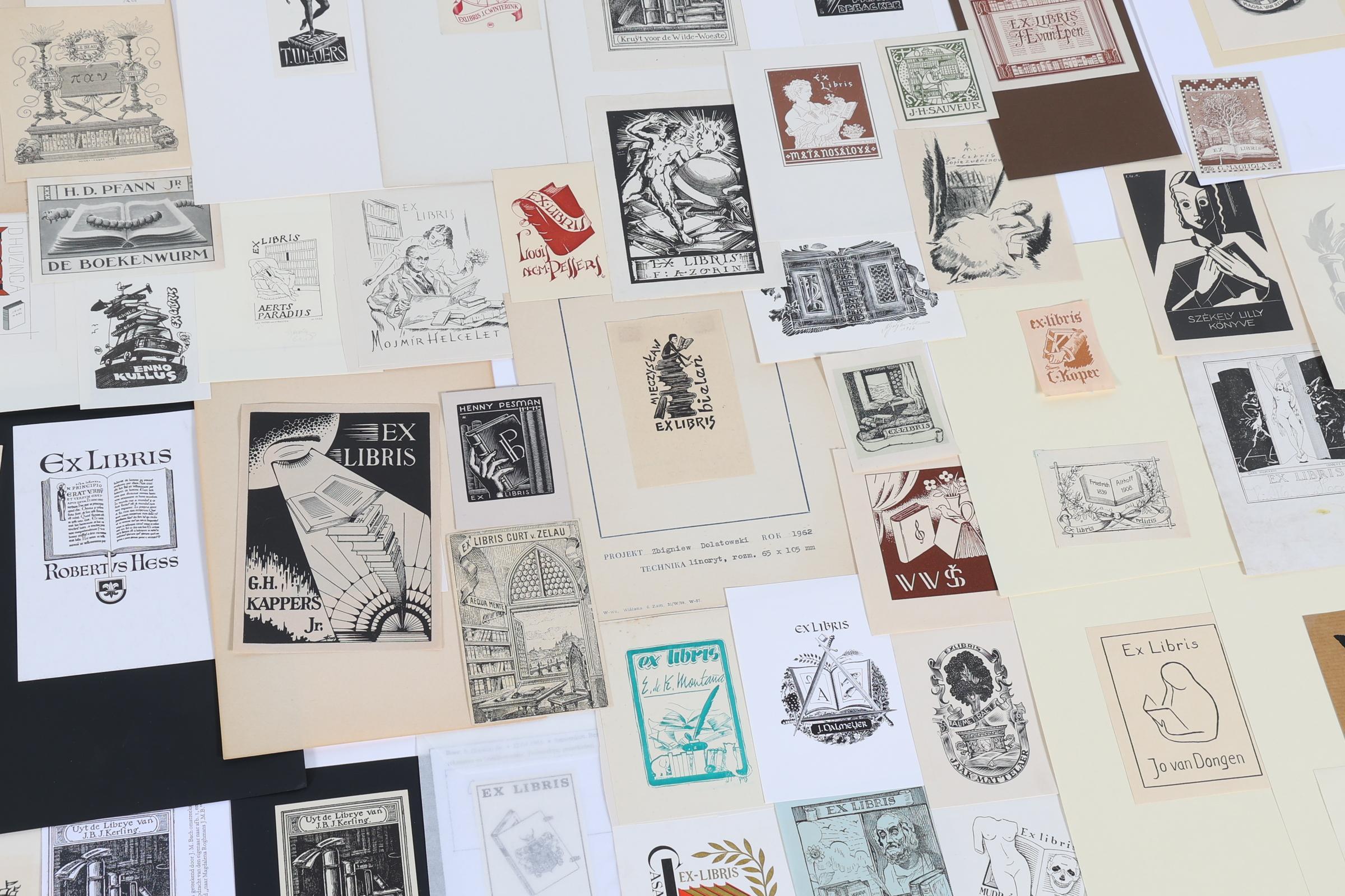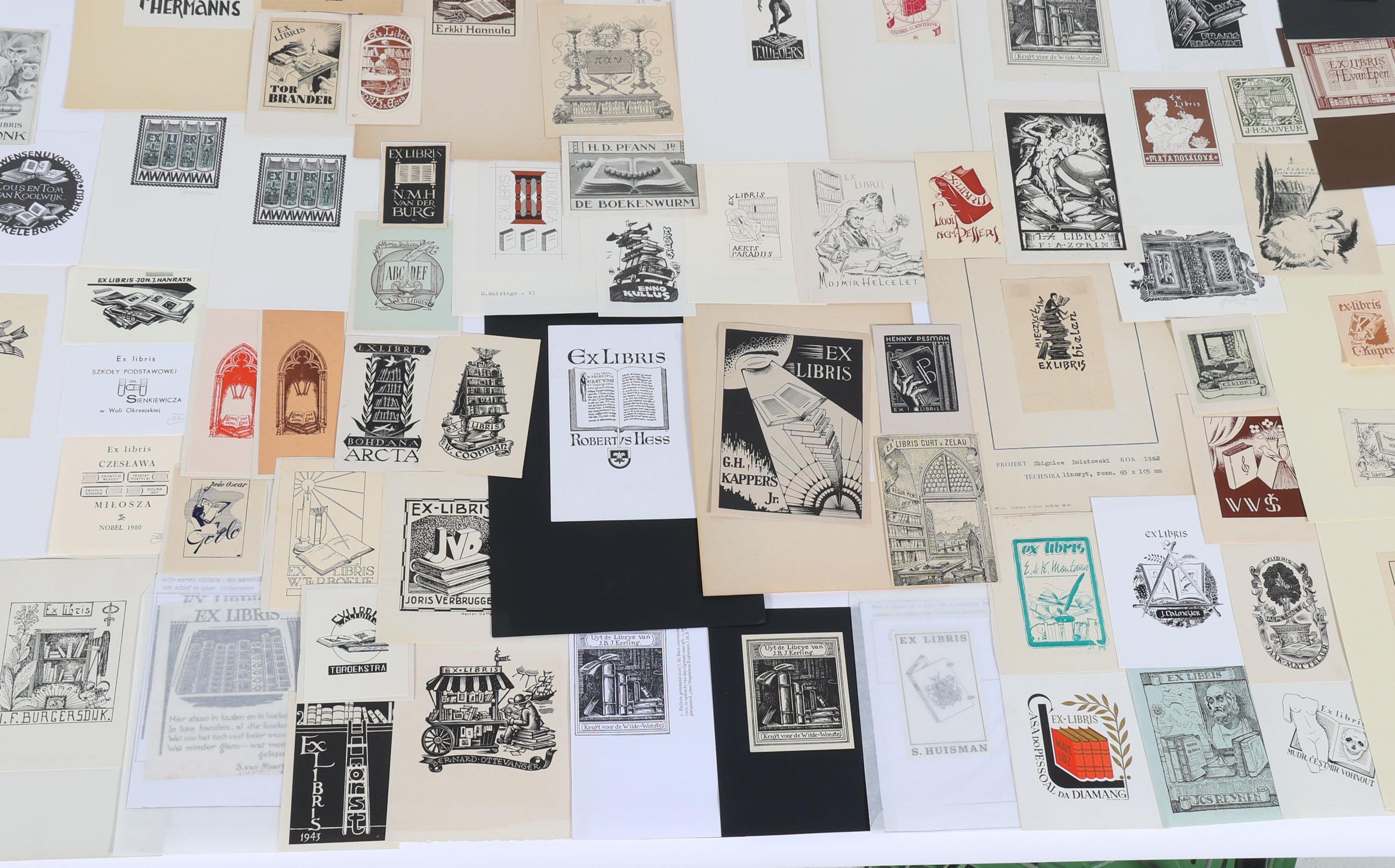 collectie van plm. 150 exlibris / kleingrafiek, thema: "boeken / bibliotheken', hoogdruk / vlakdruk, deels gesigneerd, deels opgeplakt. O.a. O. Karel, Bulder, Melan, Vlaanderen, Antal, Vodraszka, Benca, Eversdijk, Dolatowski, Rueter,