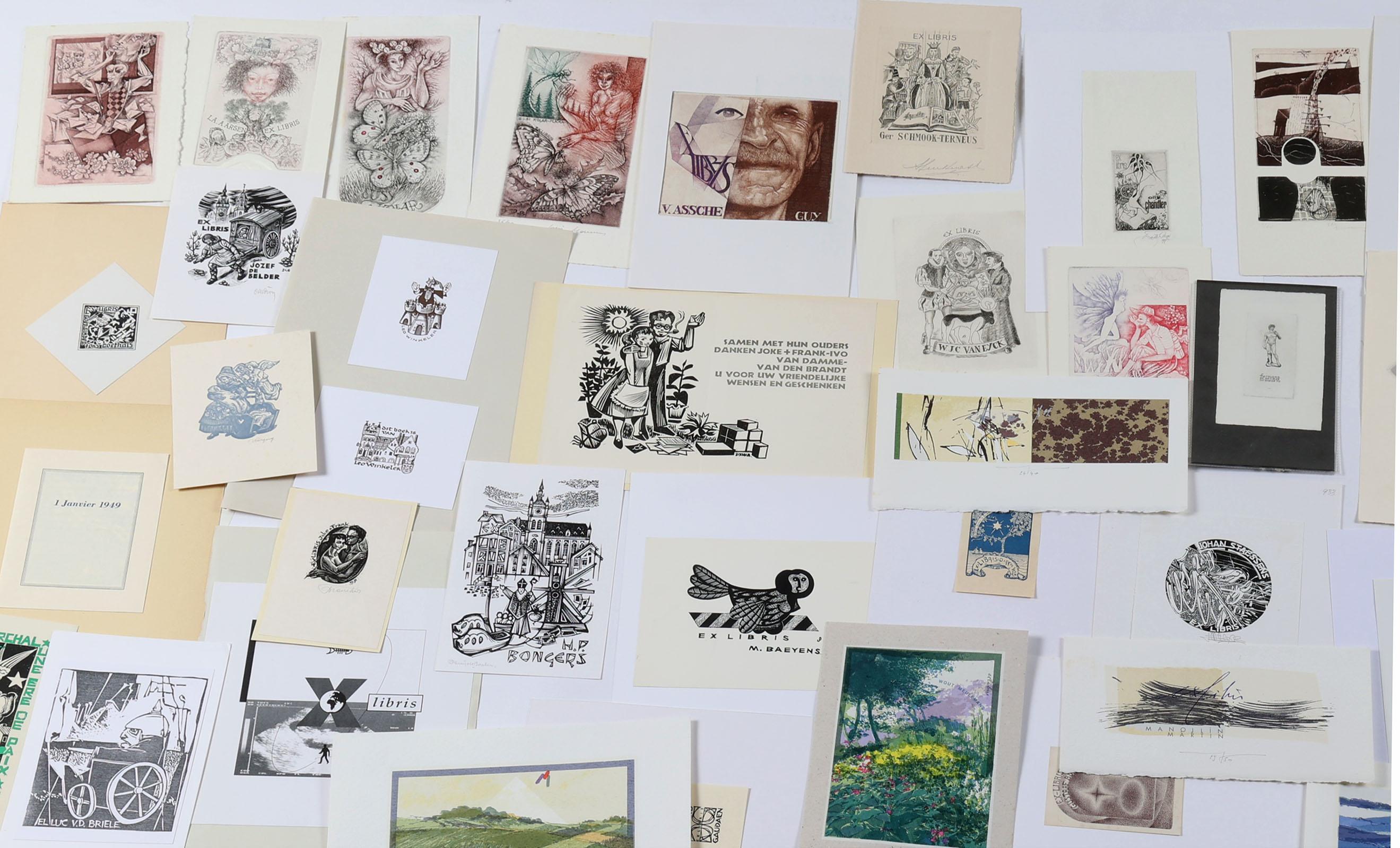 collectie van 80 Belgische exlibris / kleingrafiek. (22 x M. Baeyens, 37 x hoogdrukken / vlakdrukken, 21 diepdrukken). Deels gesigneerd, deels opgeplakt. O.a. Baeyens, diepdrukken van Mommen, Van Assche, Herckenrath, Brems, Scheir, Gastmans, Mariman, Slabbinck.