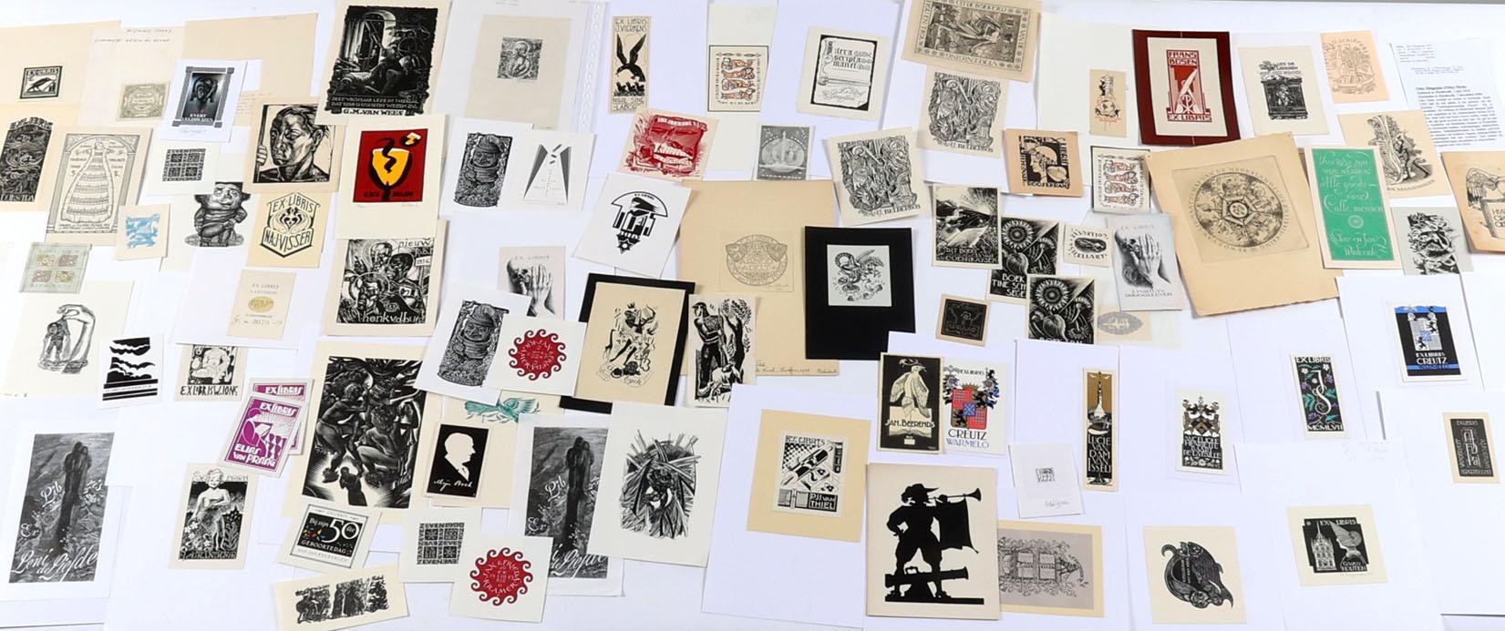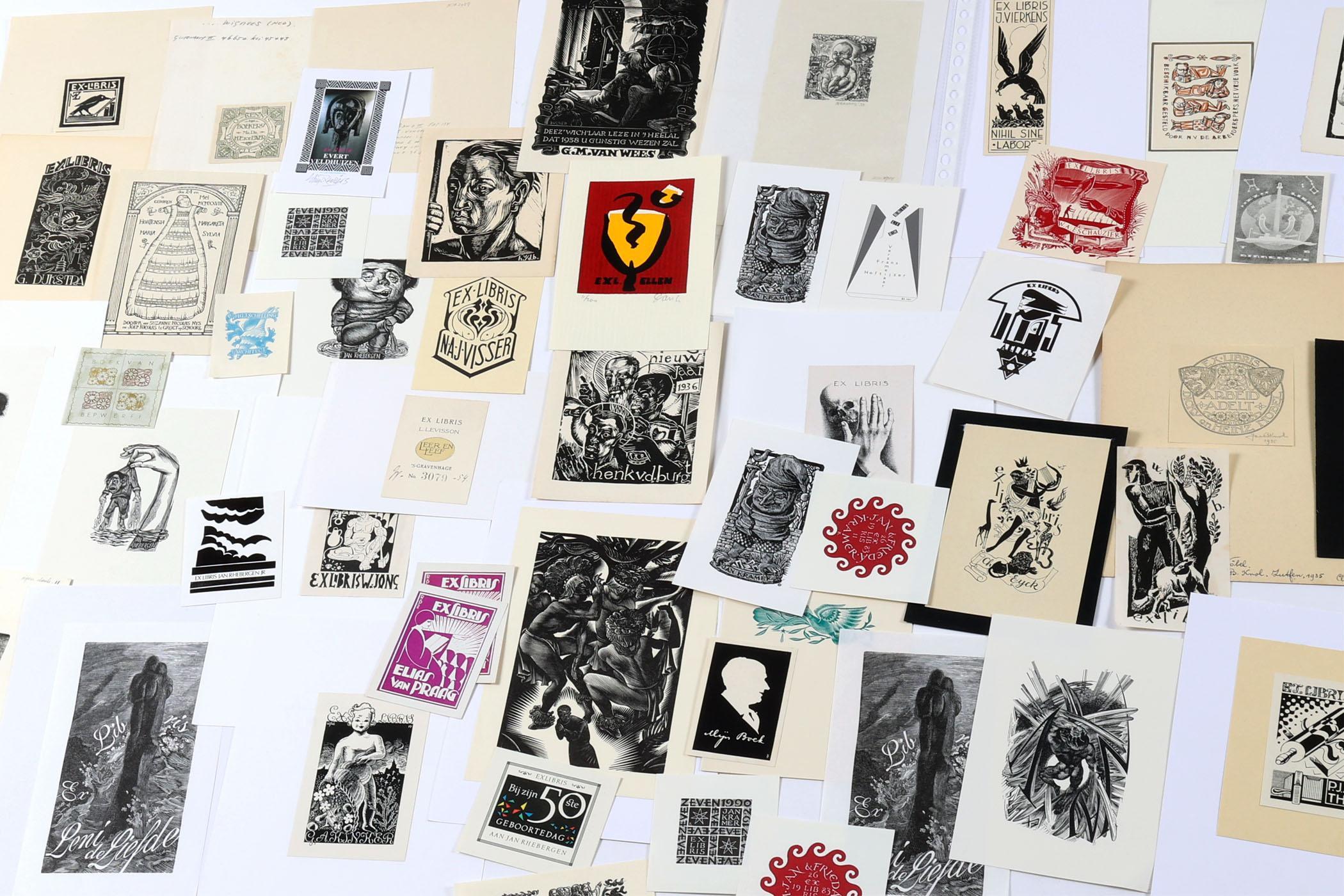 collectie van 150 Nederlandse exlibris / kleingrafiek, voornamelijk hoogdrukken, deels gesigneerd, deels opgeplakt. Gemaakt door o.a. Bieruma Oosting, M. de Zaayer, Strik, Van Gelder, Sleper, Zwiers, Bulder, Mees, Doeve, O. Dicke, Wetselaar.