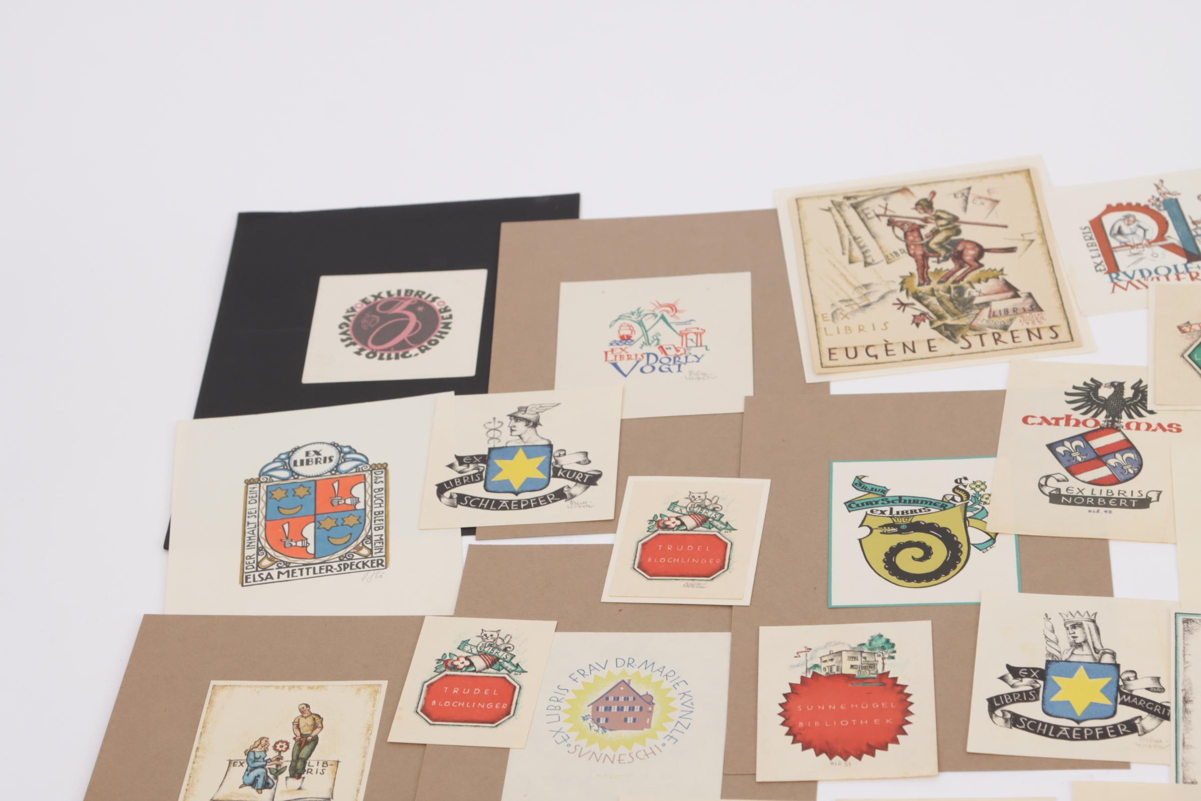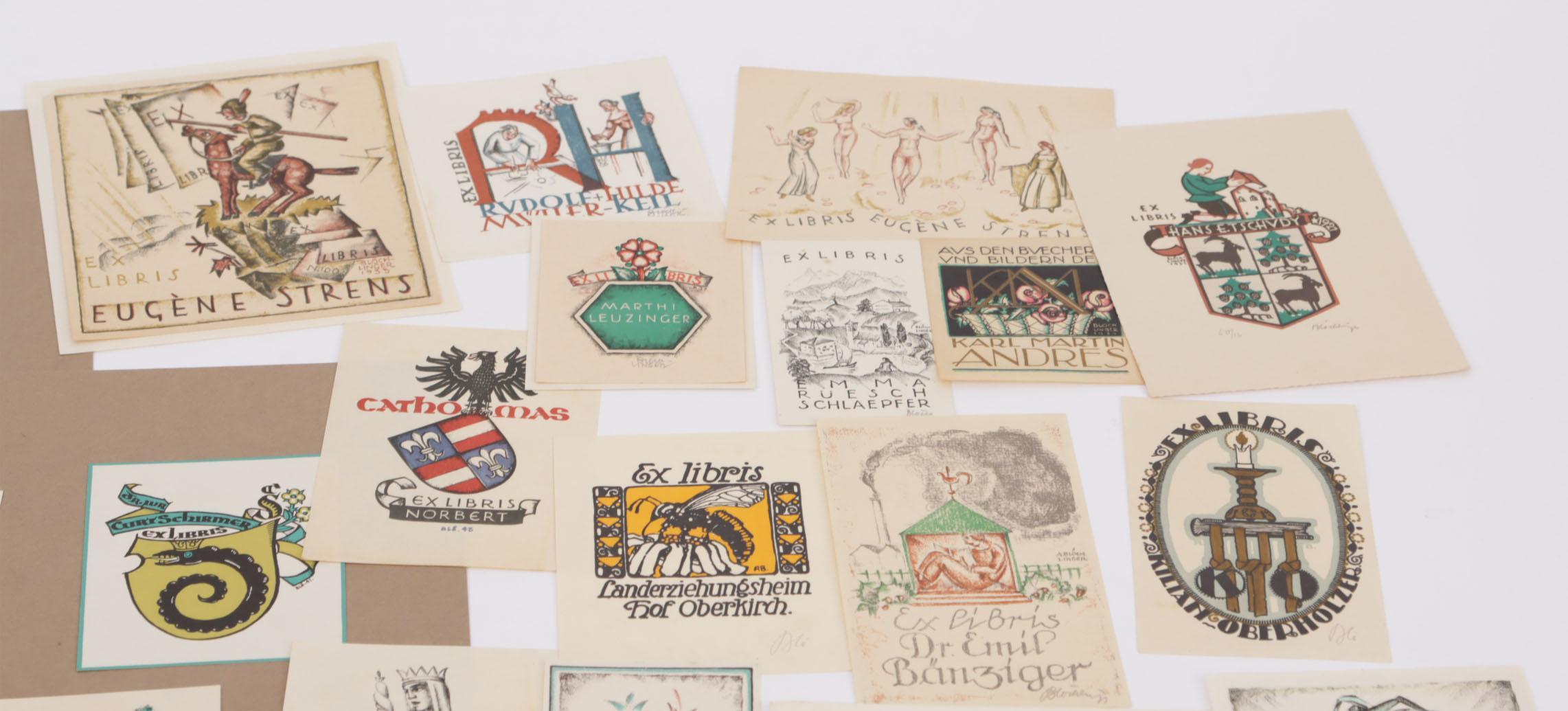 Bloechlinger, A., 37 exlibris / kleingrafiek, litho (vaak meerkleuren), deels gesigneerd, deels opgeplakt. Bevat enkele doubletten. O.a. voor Schirmer, Mettler, Kurer, Vogt, Keller, Bersinger, Kern.