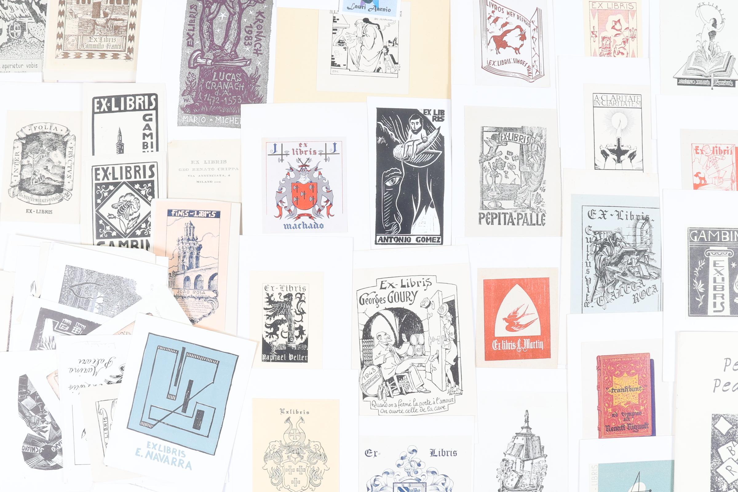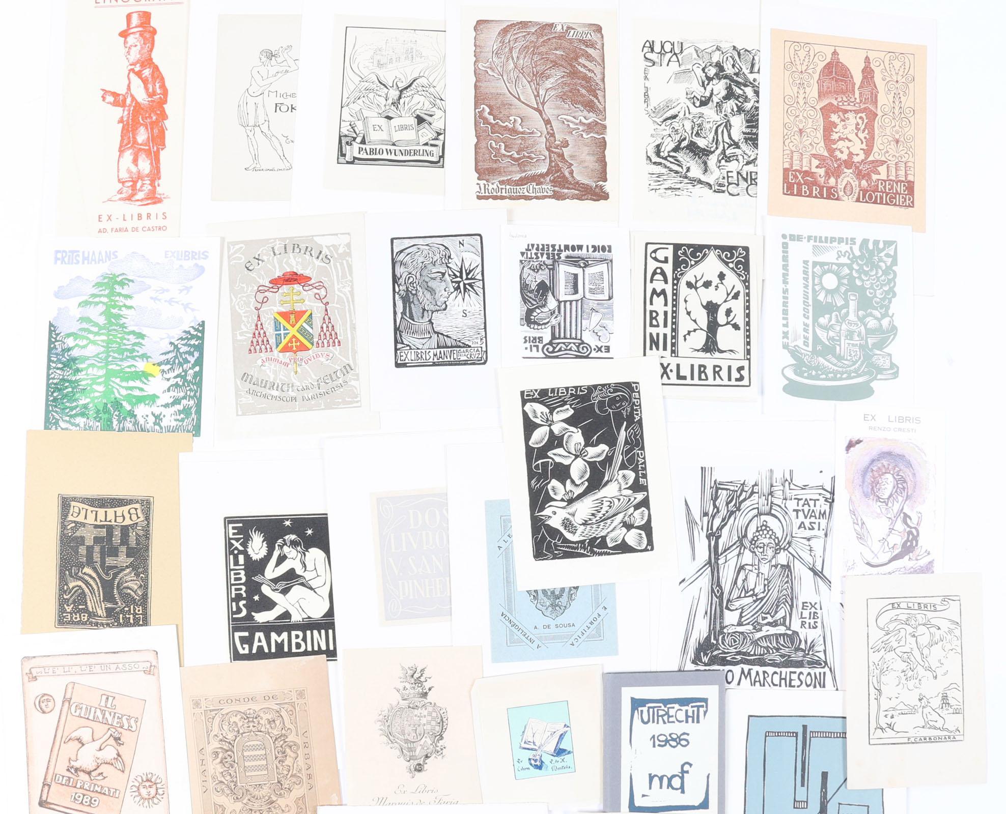collectie van plm. 150 exlibris / kleingrafiek, gemaakt door kunstenaars uit Italië, Spanje, Frankrijk, Portugal. Hoogdruk / vlakdruk. Deels opgeplakt, deels gesigneerd. Gemaakt door o.a. Zetti, Wolf, Gambini, Burzi.