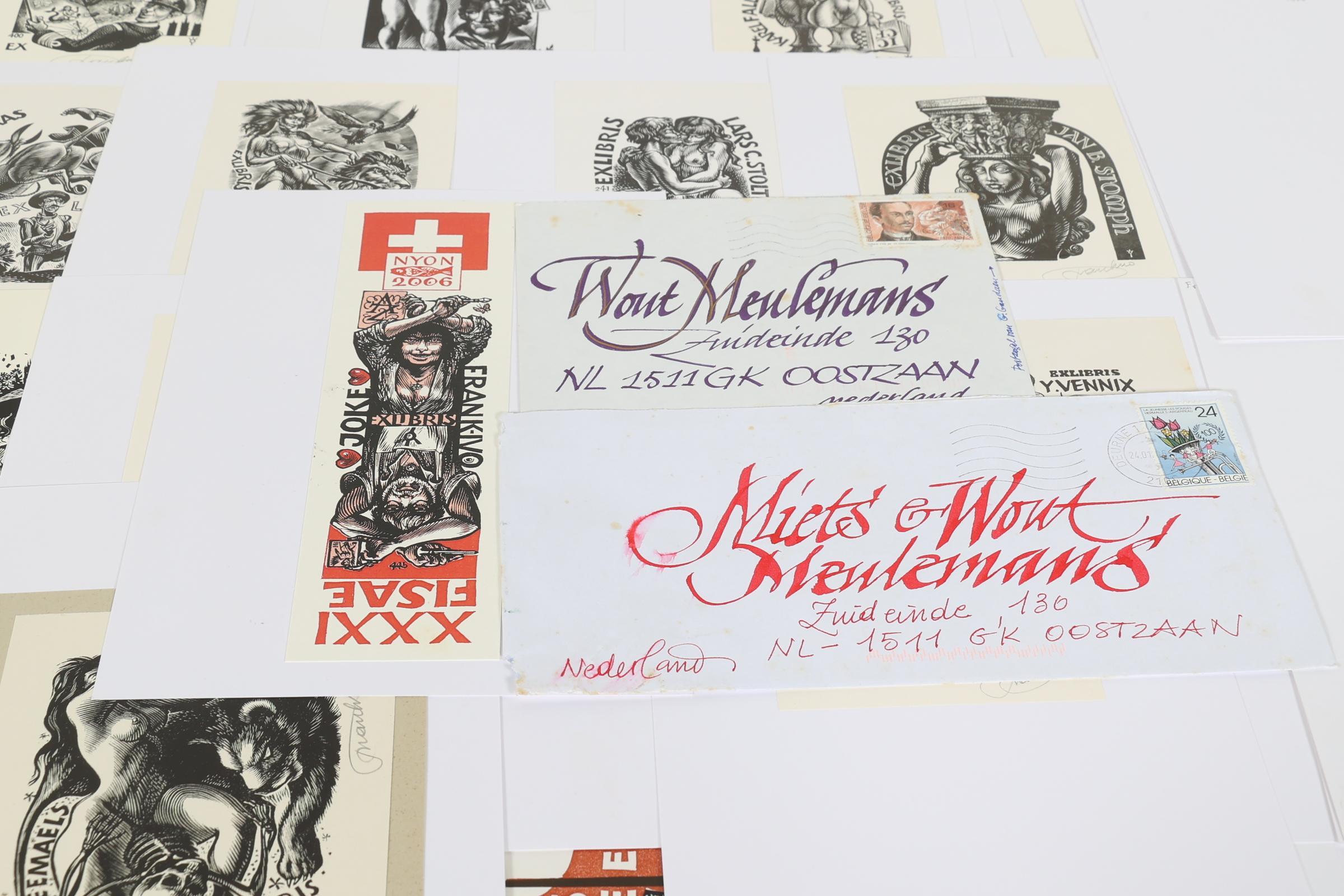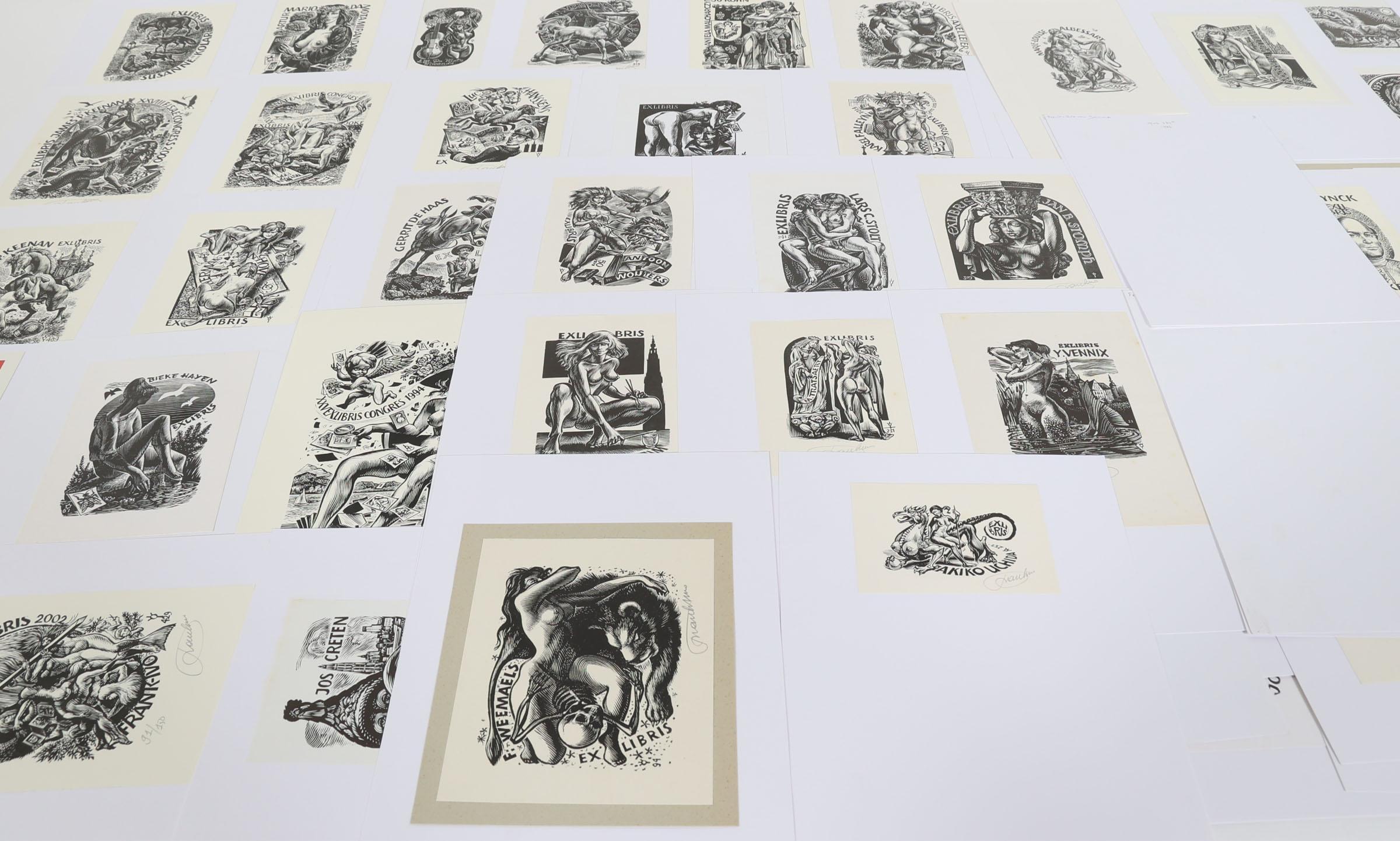 Damme, F.-I. van, 75 exlibris, X2, deels gesigneerd, opgeplakt. Deels erotisch / vrouwelijk naakt.