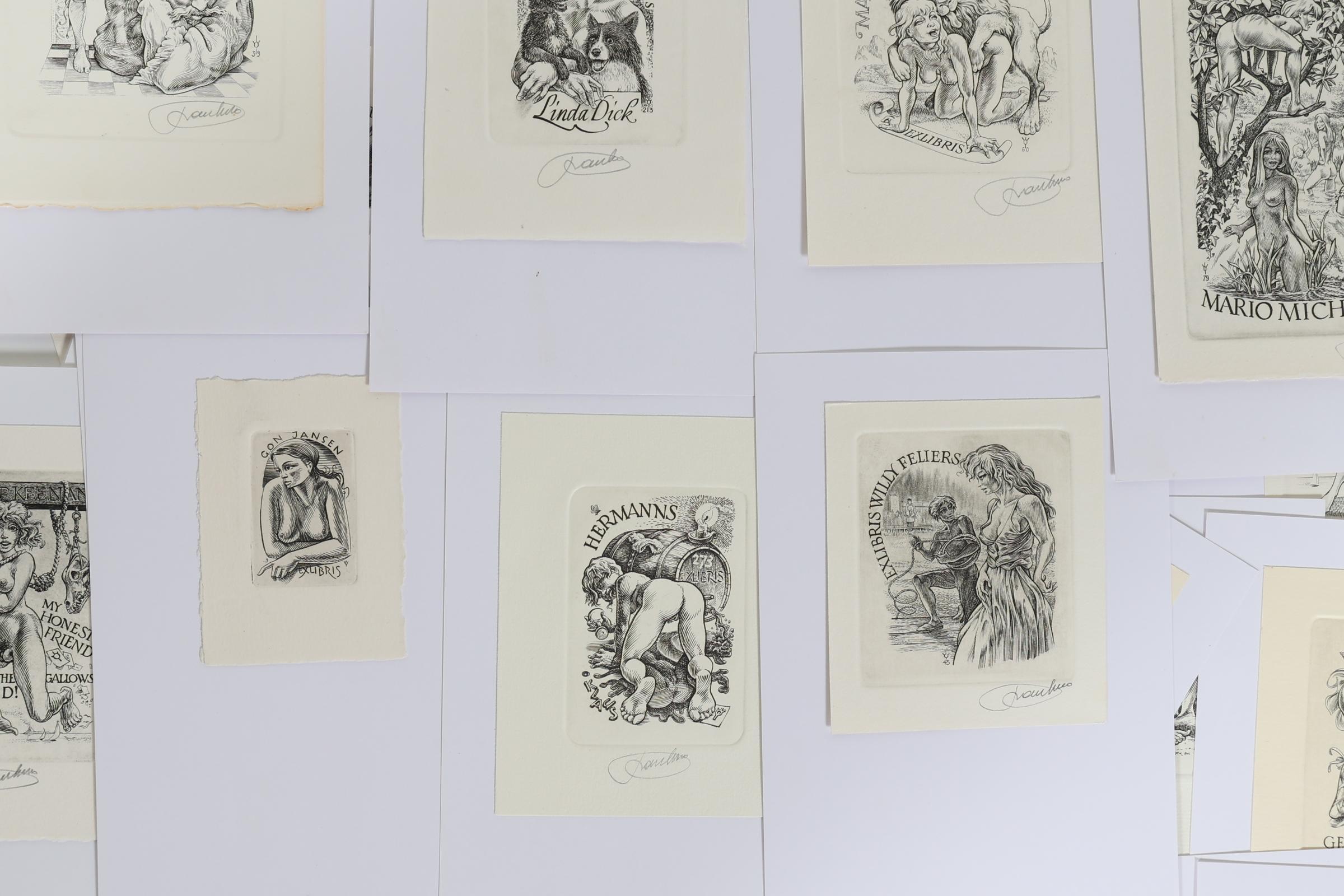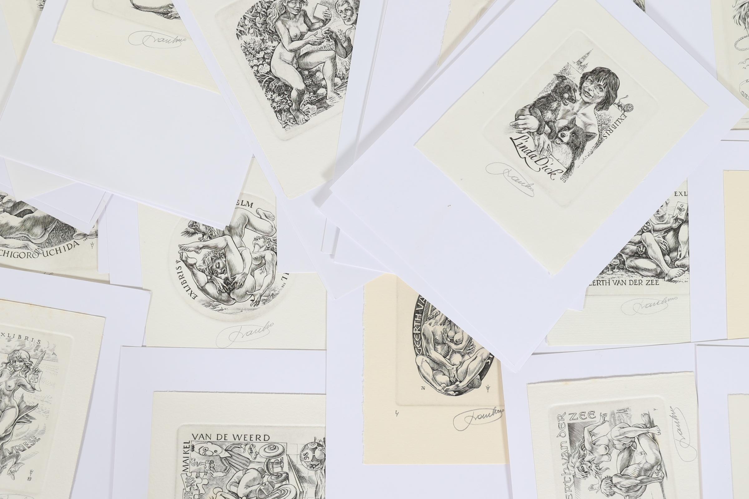 Damme, F.-I. van, 56 exlibris, C2, gesigneerd, opgeplakt. Deels erotisch / vrouwelijk naakt.