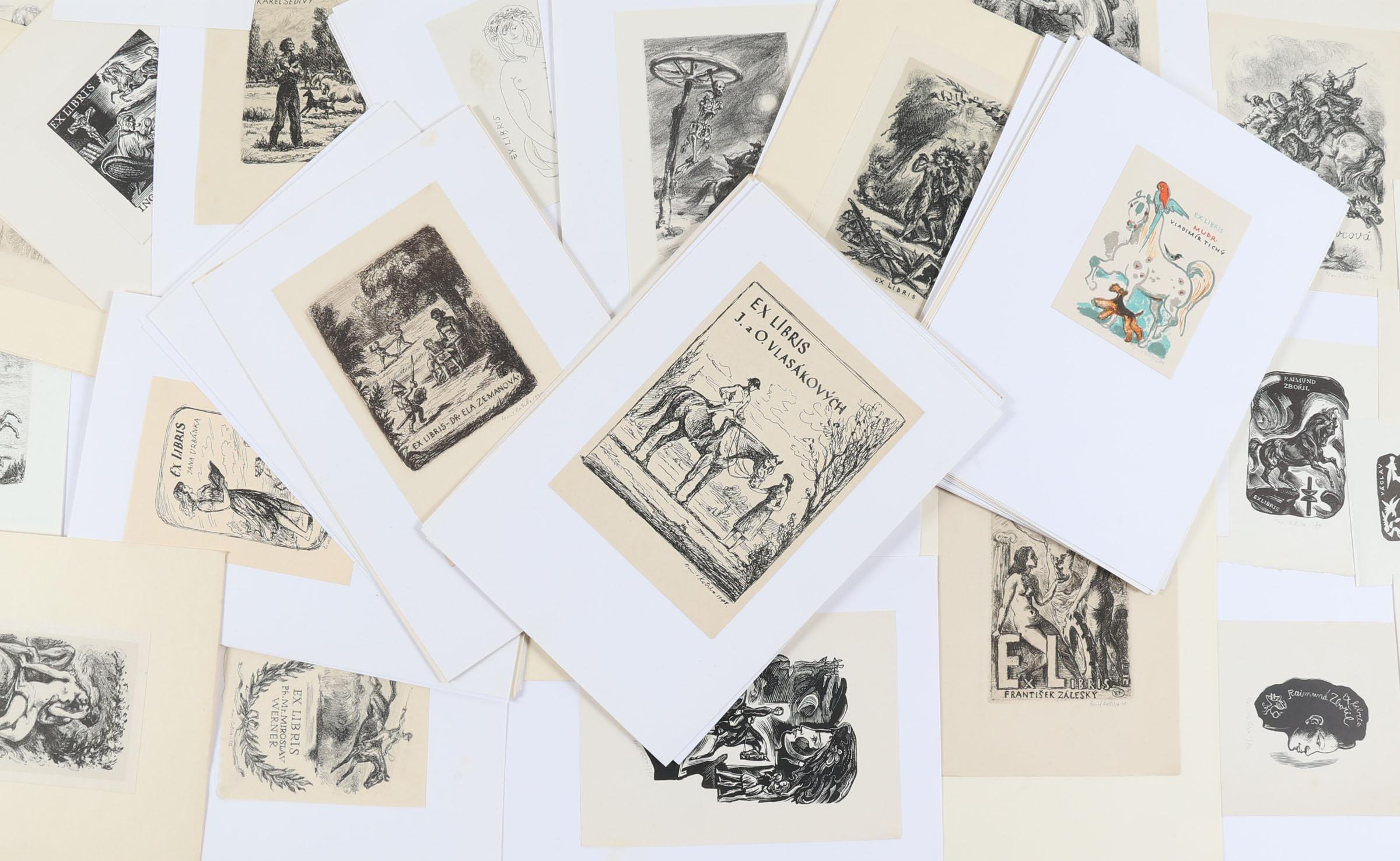 Kotrba, E., plm. 140 exlibris / kleingrafiek, diverse technieken, deels gesigneerd. Opgeplakt. Veel vrouwelijk naakt en paarden