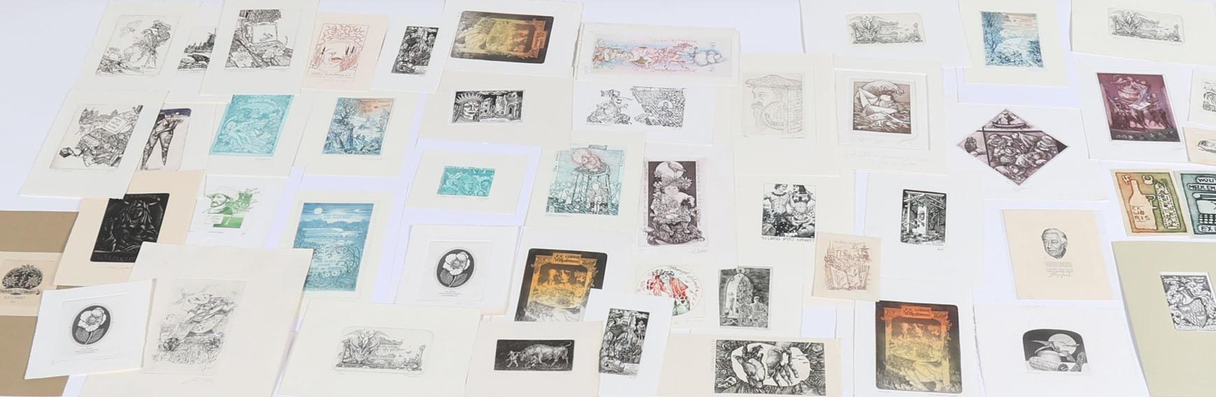 collectie van plm. Nederlandse 50 exlibris / kleingrafiek, diepdrukken(C2, C3 etc.), deels gesigneerd / opgeplakt. Bevat enkele doubletten. Gemaakt door o.a. Montyn, Strik, Steenvoorden, Zwiers, Van Vlijmen, Jepkes, Schmuell,Spronk, De Vries,