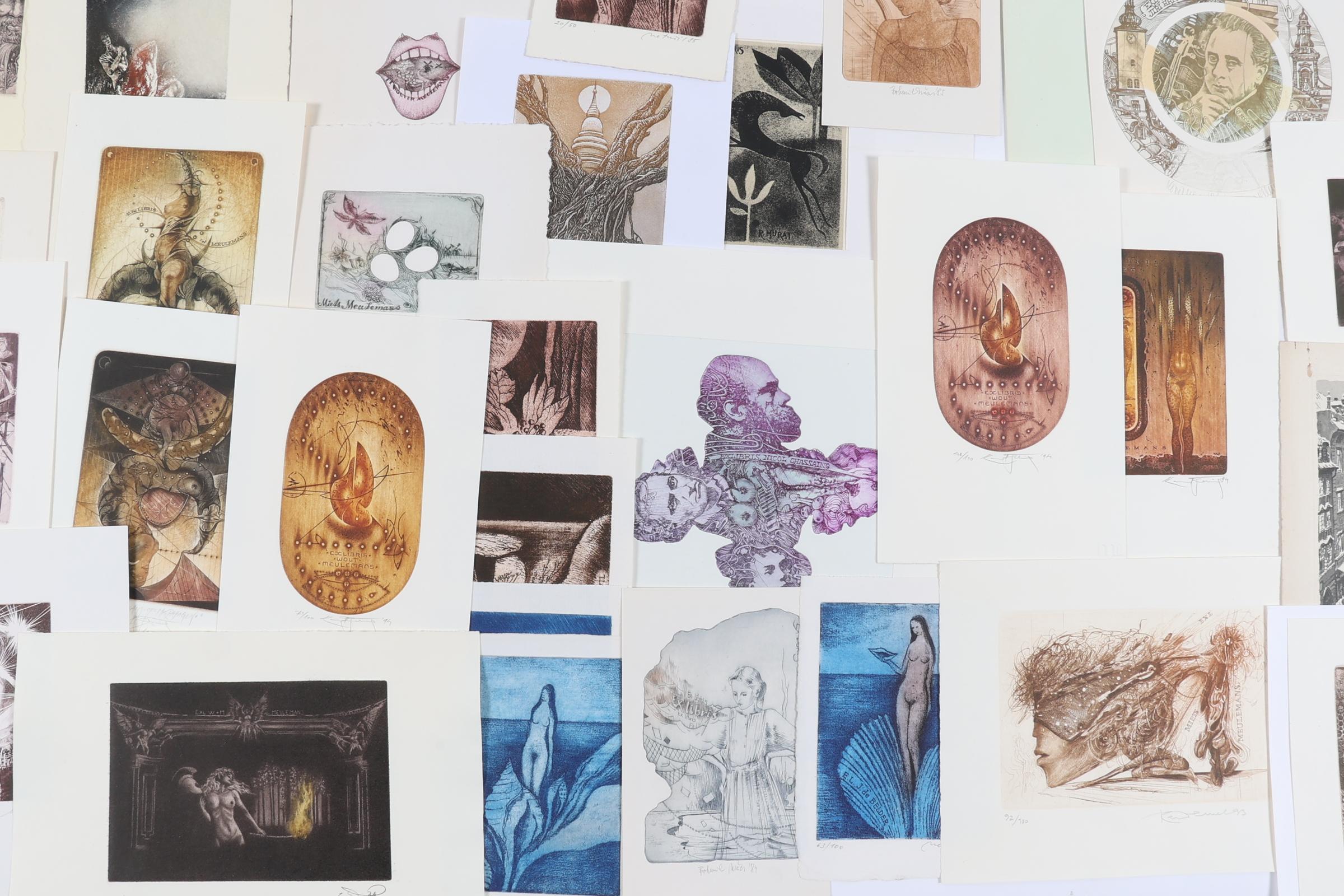 collectie van Tsjechische / Slowaakse exlibris / kleingrafiek, diepdrukken (C2, C3, etc), deels gesigneerd, deels opgeplakt. Gemaakt door o.a. Felix, Demel, Cernos, Smetanova, Kratky, Bugan, Kisza, Lodr.
