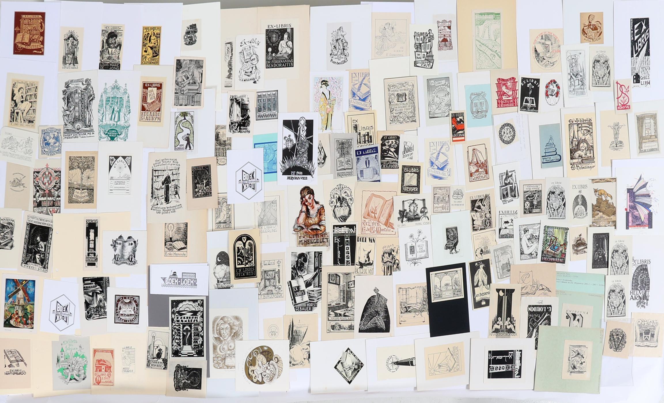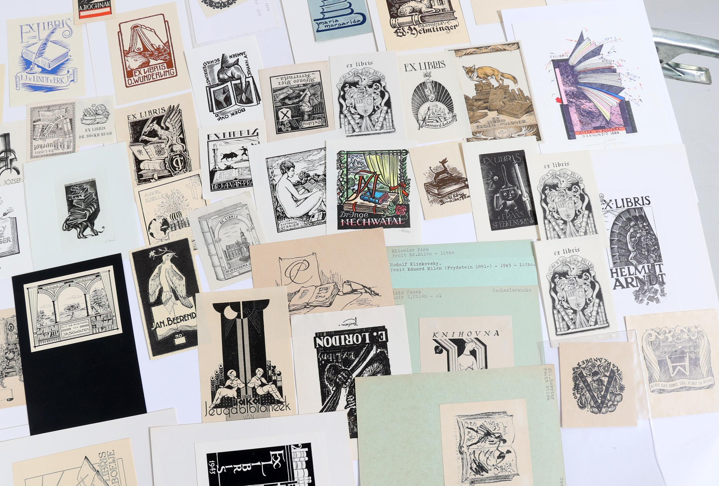 collectie van plm. 130 exlibris / kleingrafiek, thema: boeken / lezers / bibliotheken. Hoogdruk / vlakdruk. Deels gesigneerd, deels opgeplakt