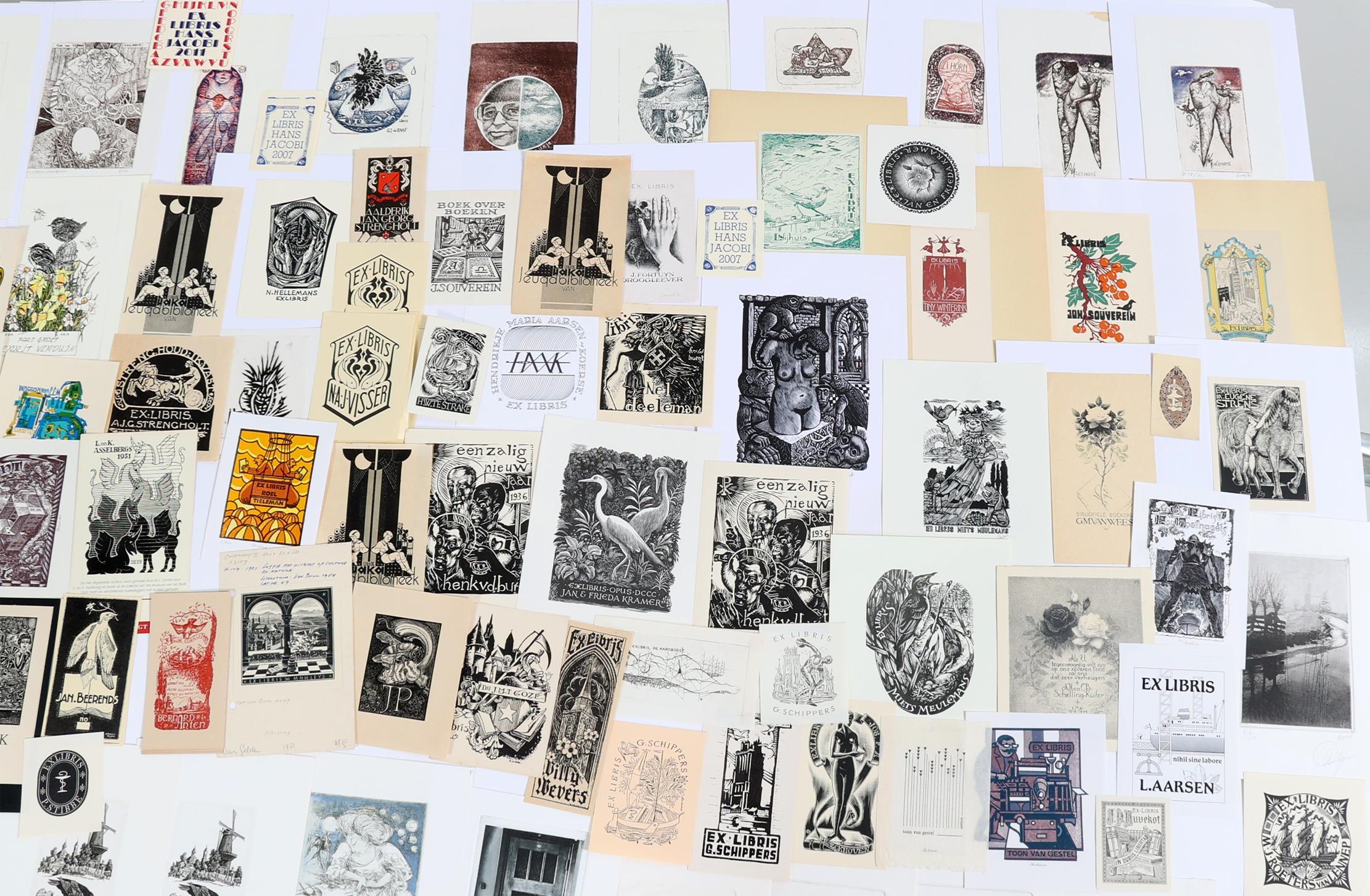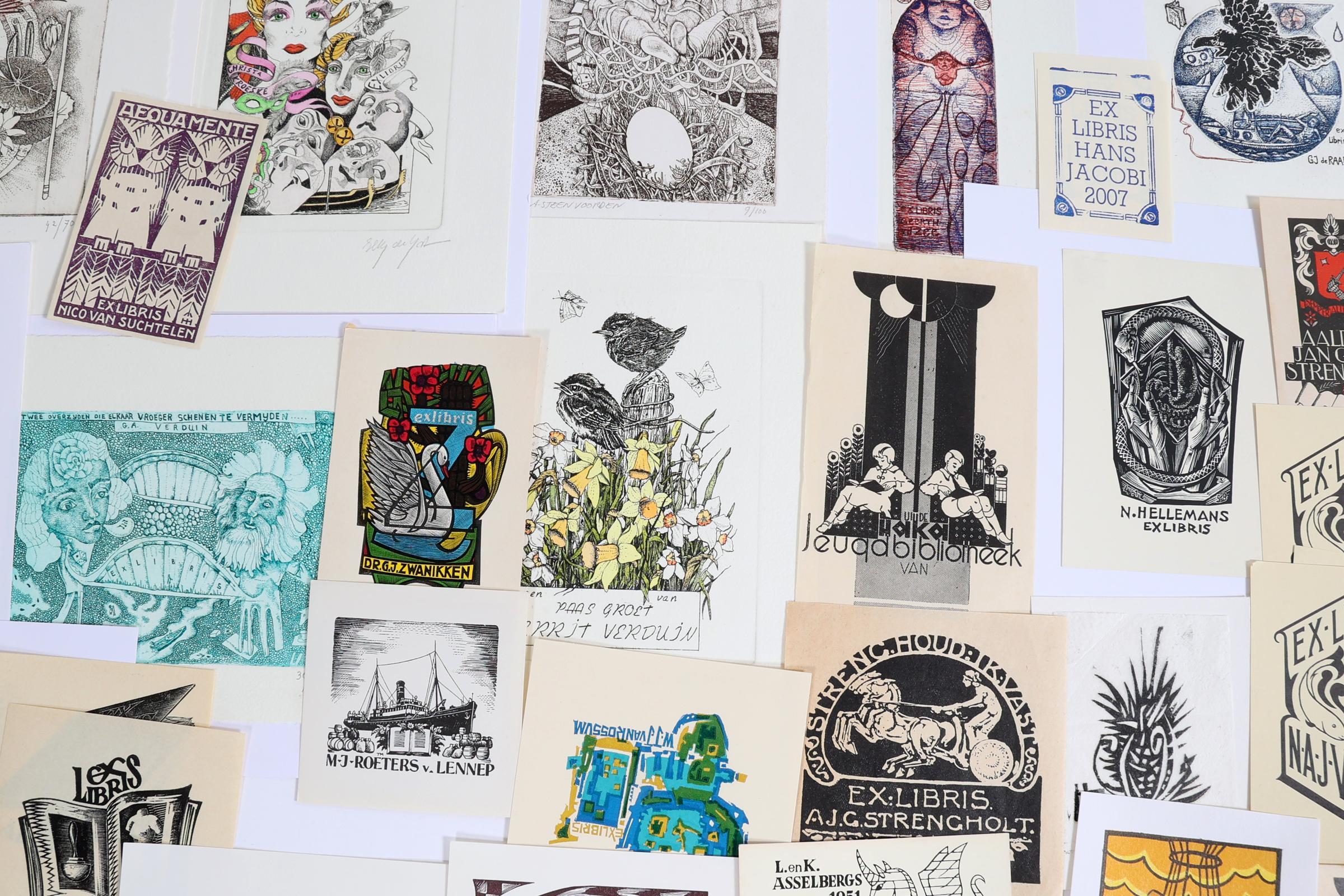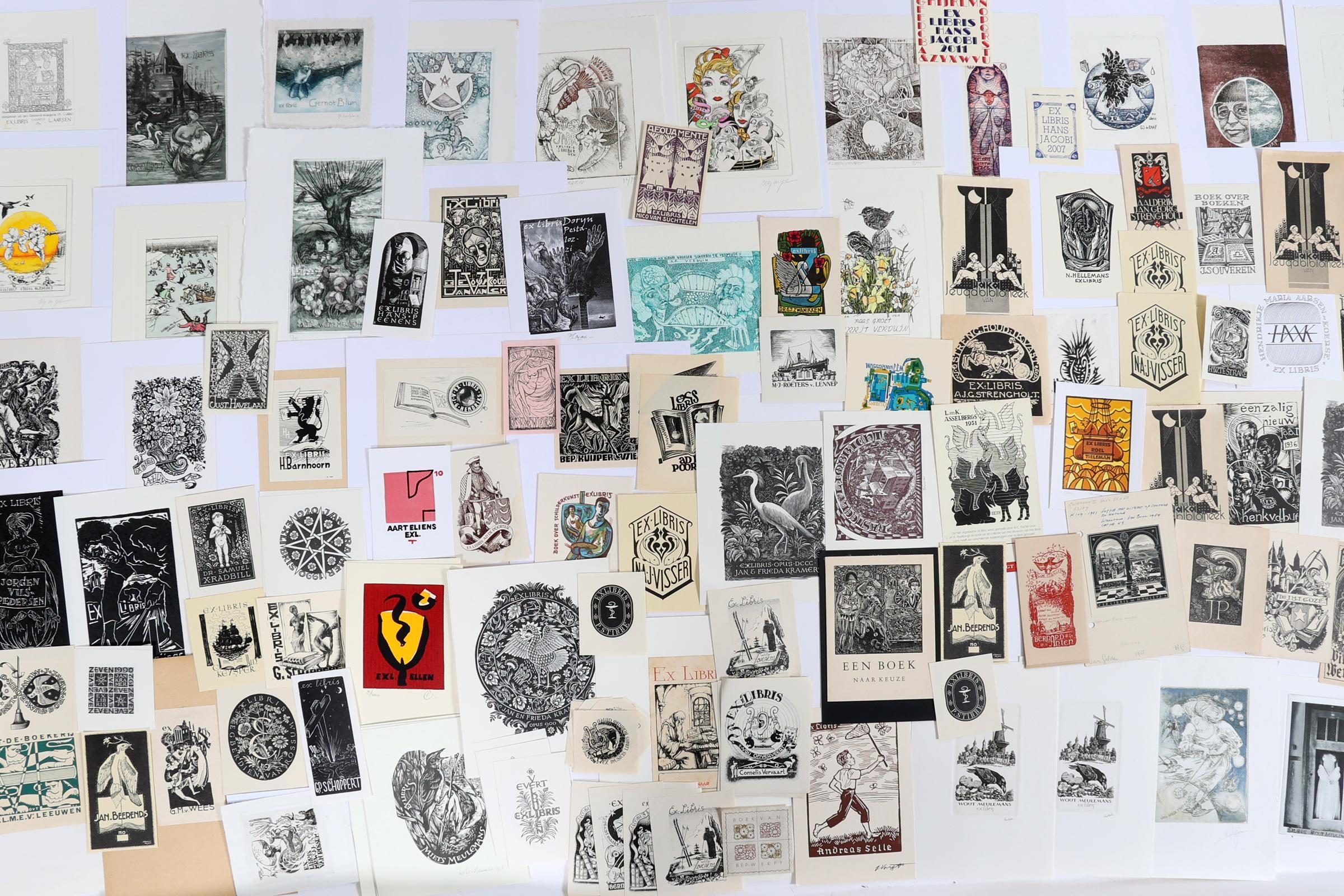 collectie van plm. 135 exlibris / kleingrafiek, gemaakt door Nederlandse kunstenaars. (100 x hoogdruk / vlakdruk, 35 x diepdruk). Deels gesigneerd, deels opgeplakt (geweest). Gemaakt door o.a. E. de Koster, Steenvoorden, Leeflang, Van Vlijmen, Lindeman, Wetselaar, Labots, Van Luyn, Rueter.