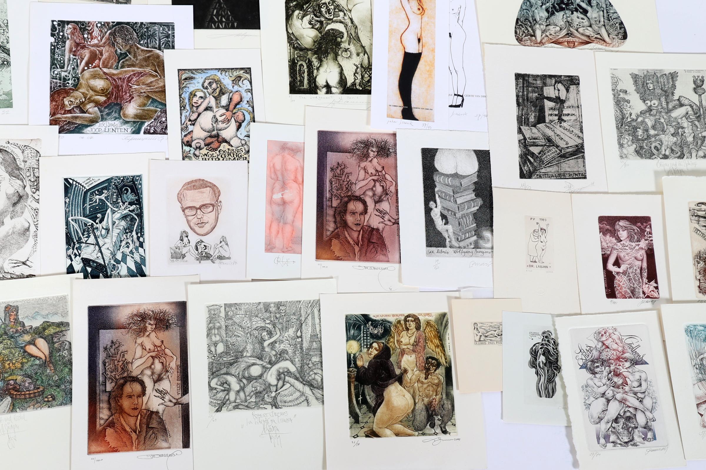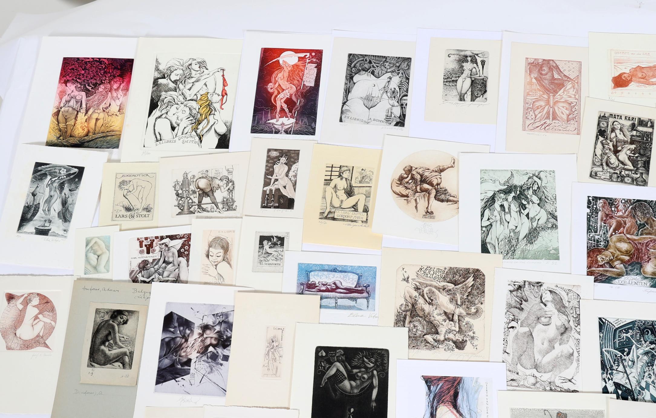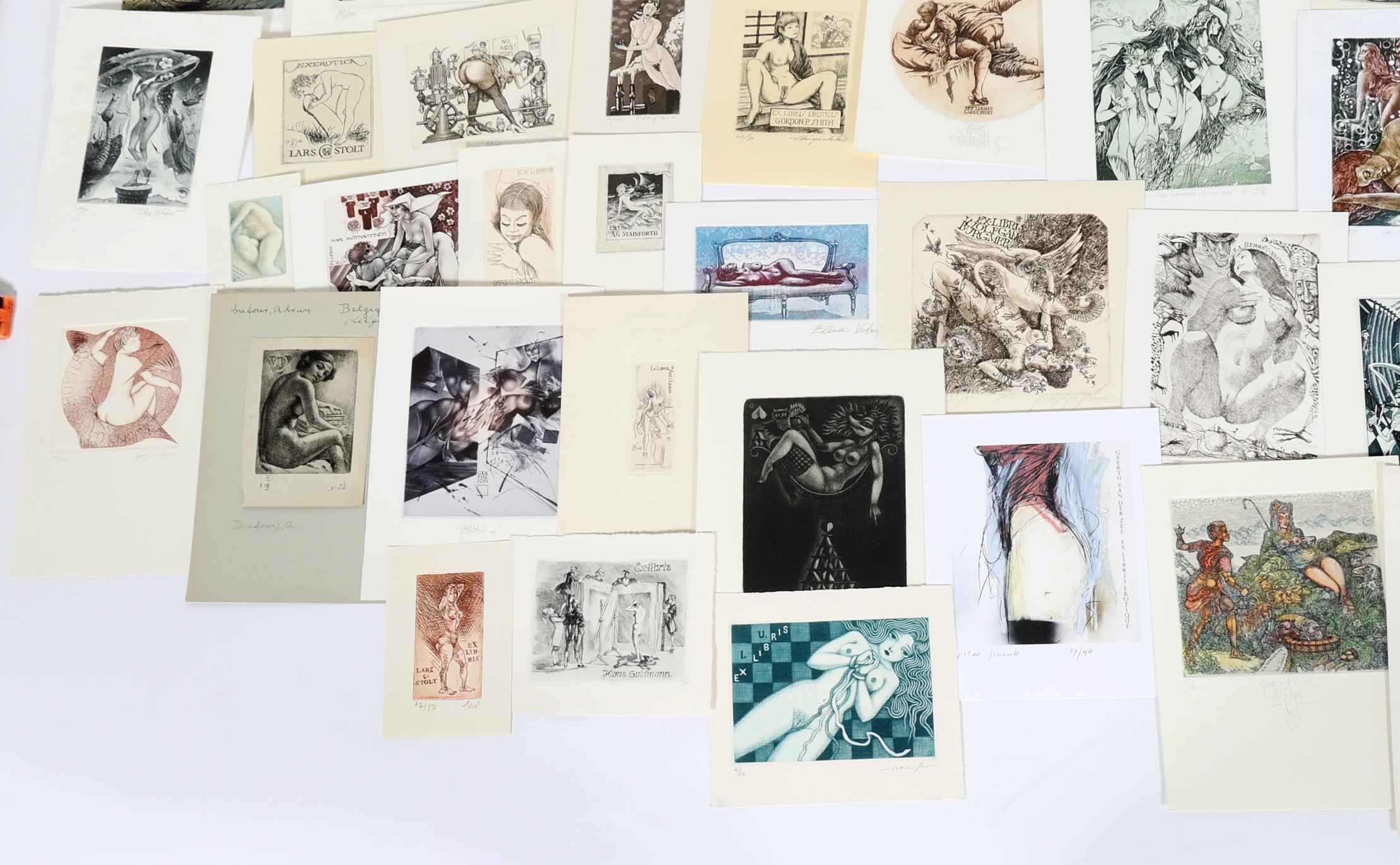 collectie van plm. 60 exlibris / kleingrafiek, thema: vrouwelijk naakt / erotiek. Diepdruk , vlakdruk. deels gesigneerd, deels opgeplakt. Gemaakt door o.a. Kvartelny, Nesterchuk, Ven, Vereschagin, Velikov, Schroth, Vutova, Polacovic, Dufour, De Vries, Rovegno, Nik Dad, Pauwels.