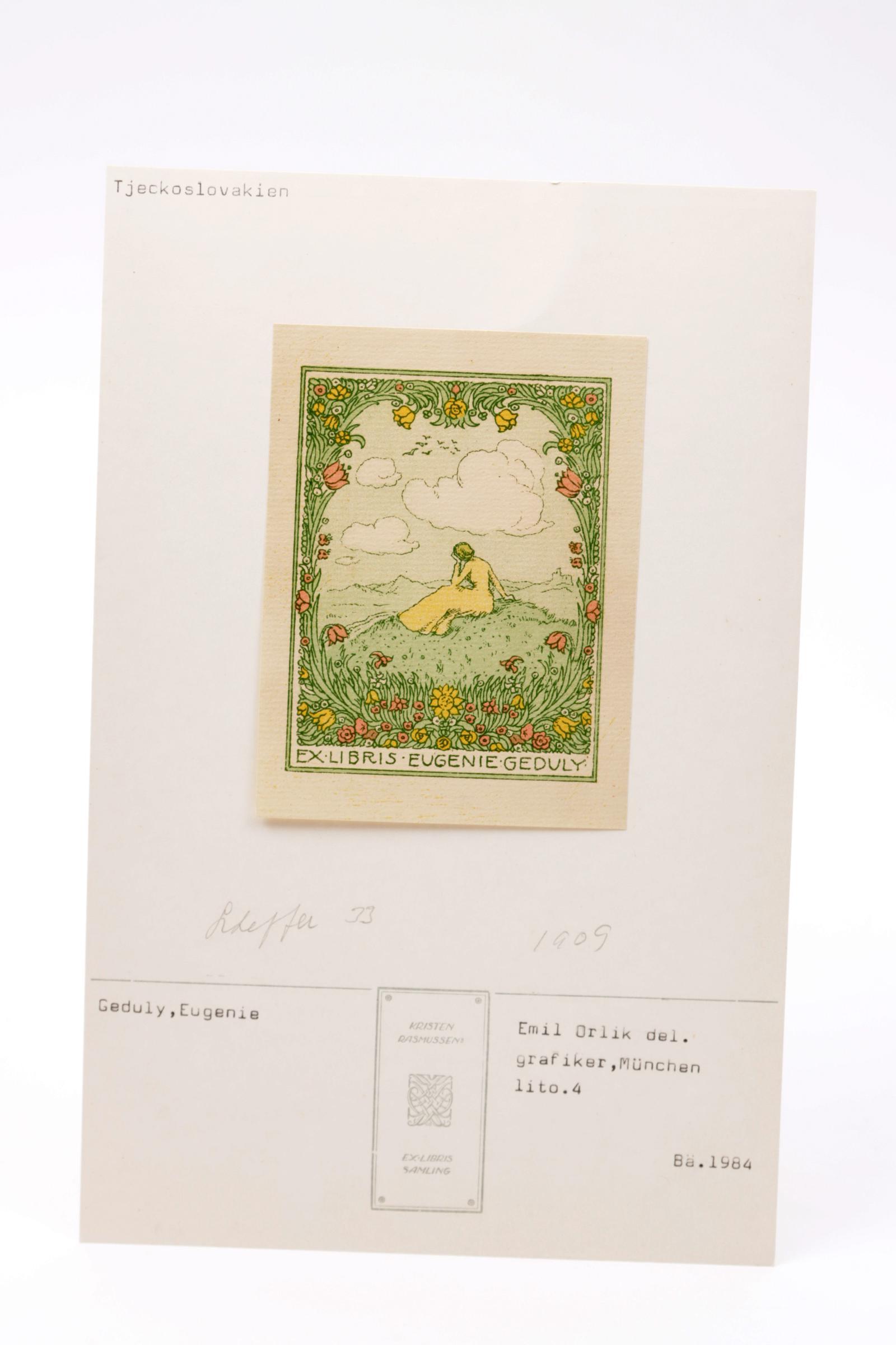Orlik, E., exlibris voor Eugenie Geduly, litho, niet gesigneerd, opgeplakt.