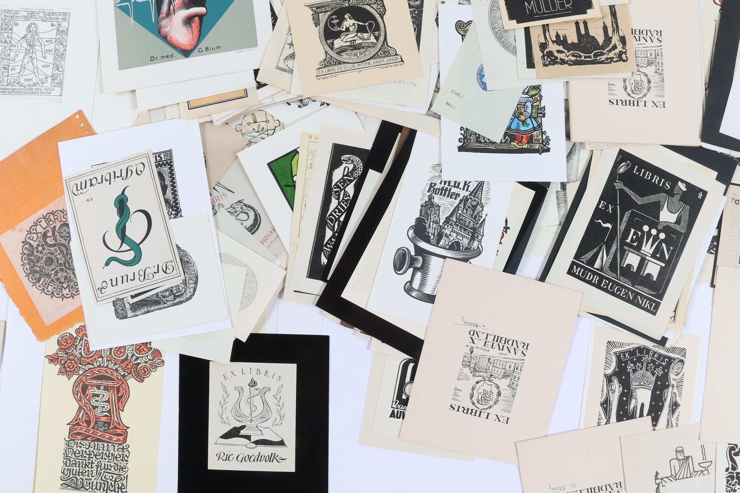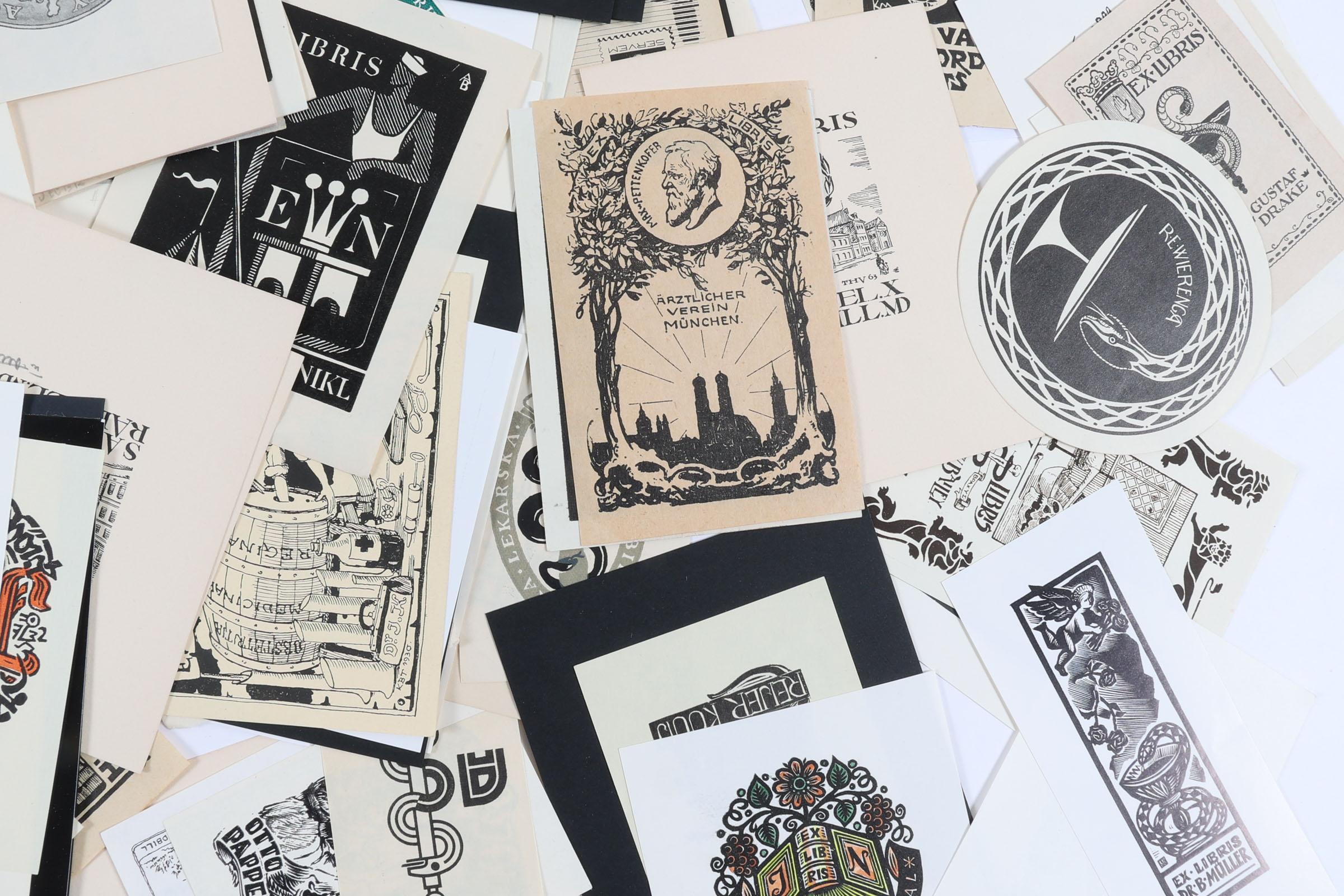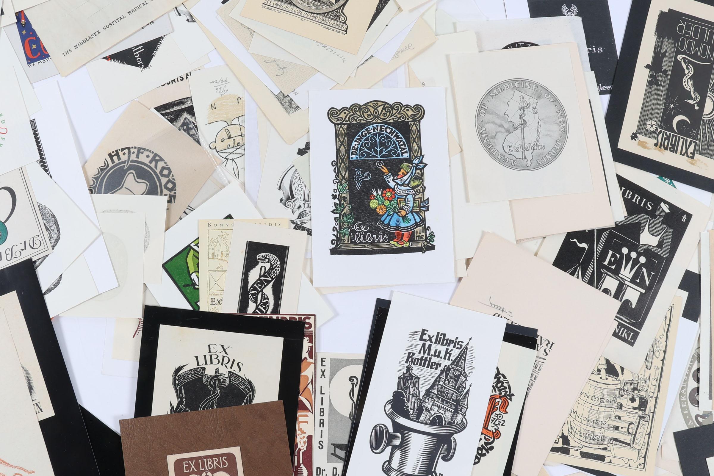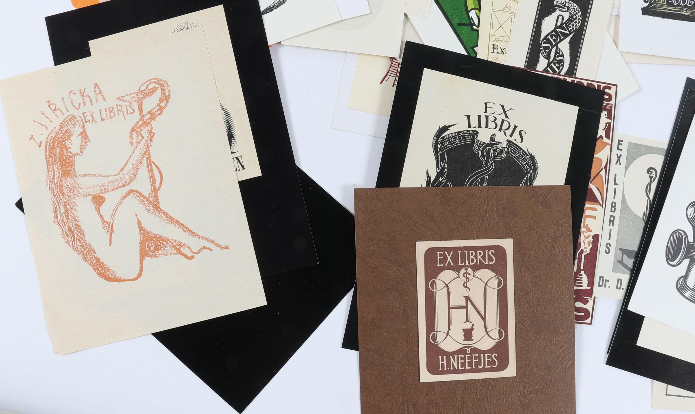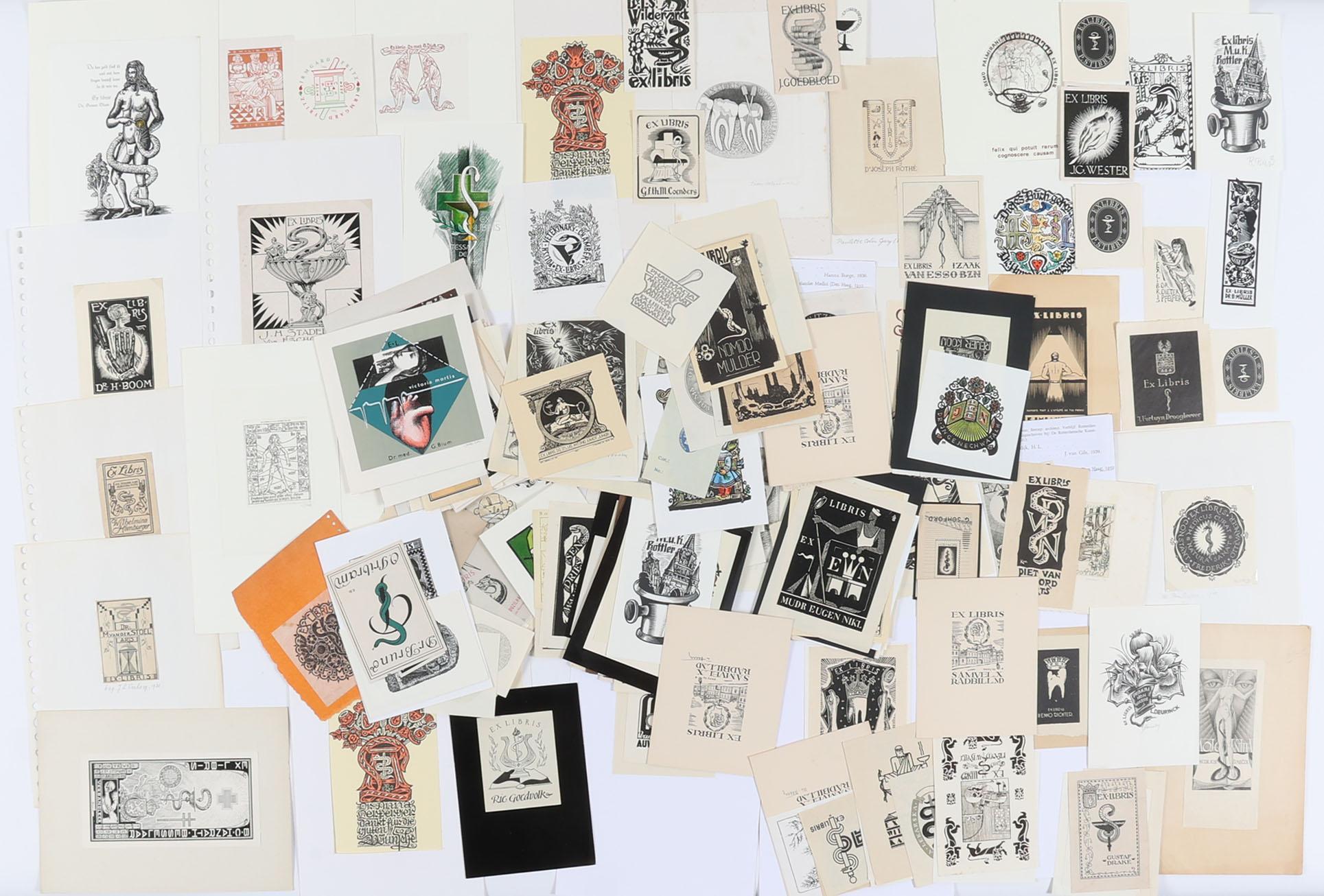 collectie van plm. 160 exlibris /. kleingrafiek, thema: 'medisch'. O.a. artsen, tandartsen, apothekers, instituten. Uit diverse landen. Voornamelijk hoogdruk / vlakdruk. Deels gesigneerd, deels opgeplakt
