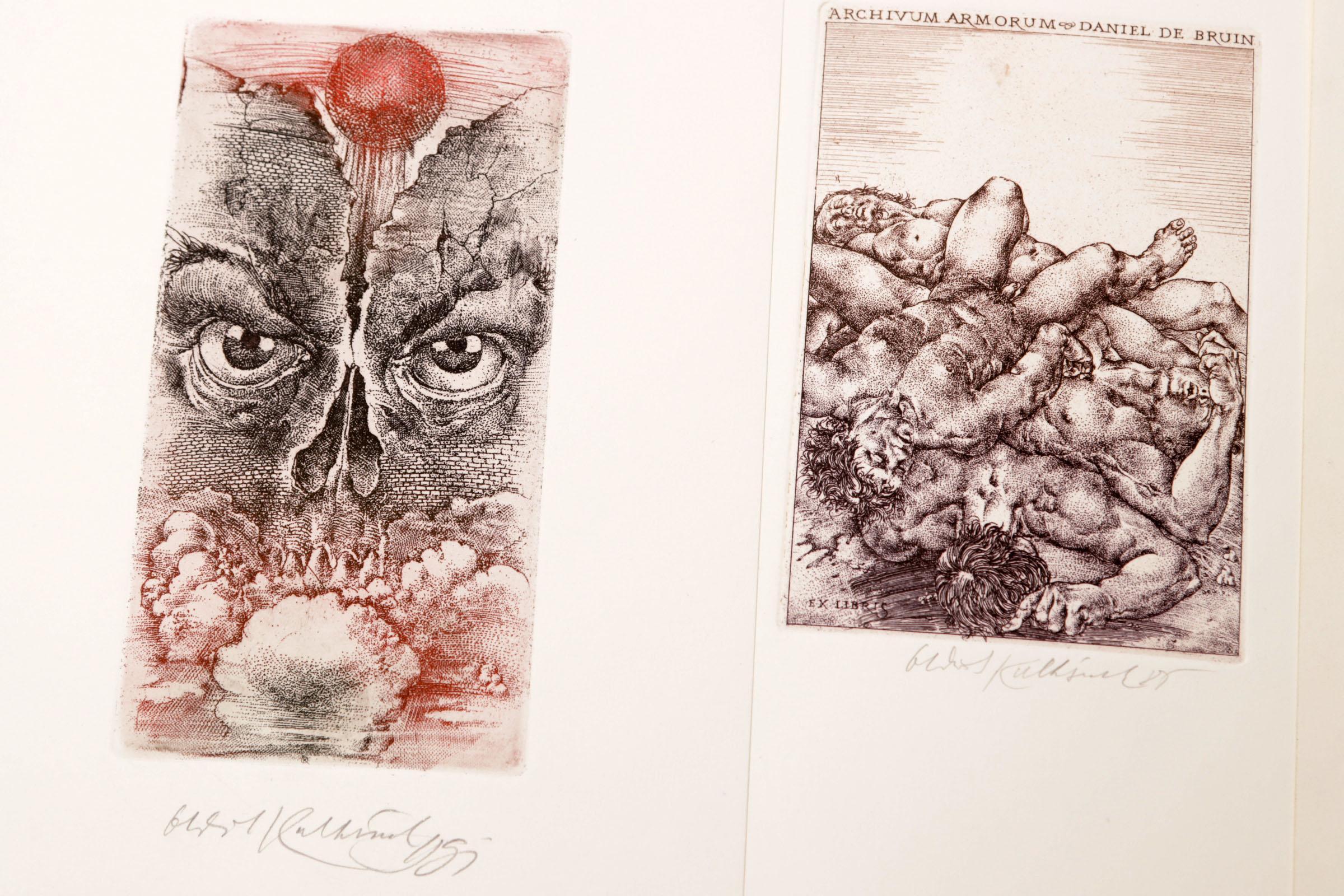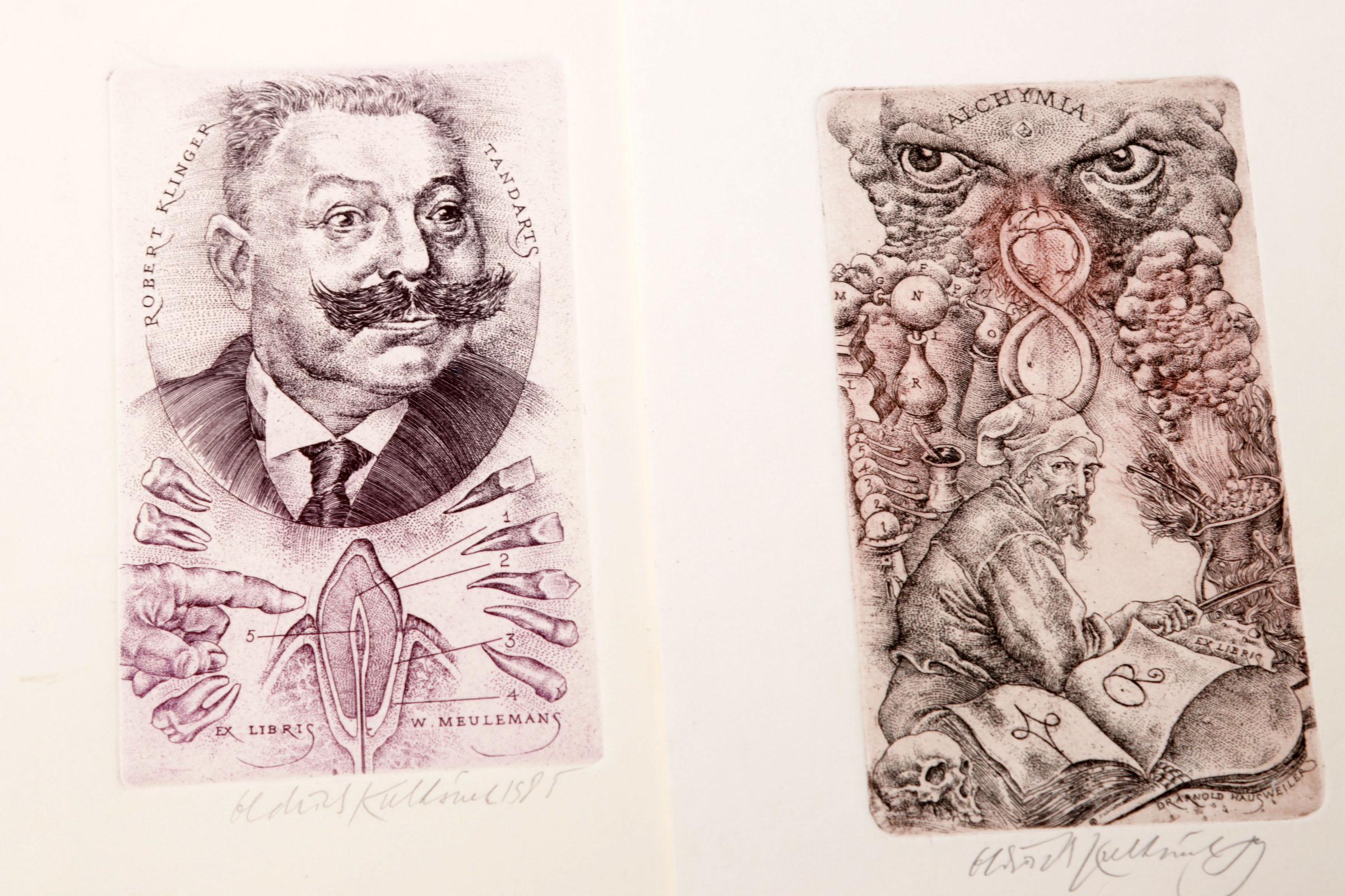 Kulhanek, Oldrich, 4 exlibris, C3, gesigneerd. Voor Hausweiler, Meulemans (tandarts), De Bruin (armorum), naamloos