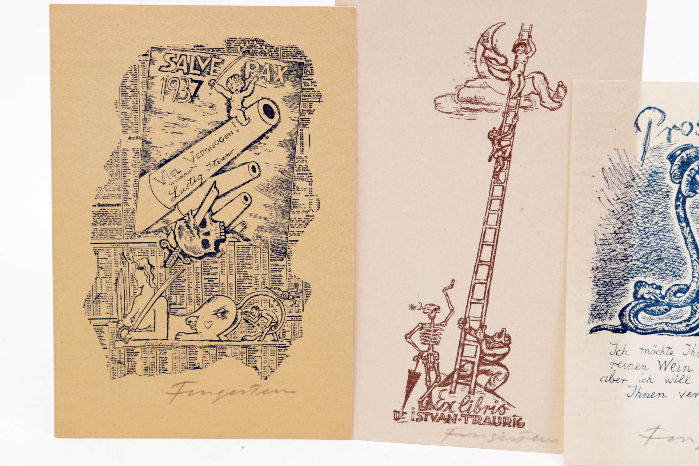 Fingesten, M., 6 exlibris / kleingrafiek, litho / cliché, deels opgeplakt (geweest), 3 x gesigneerd. Gemaakt voor: Fingesten, Lustig, Vitali, Kleeberg (met remarque), Strens