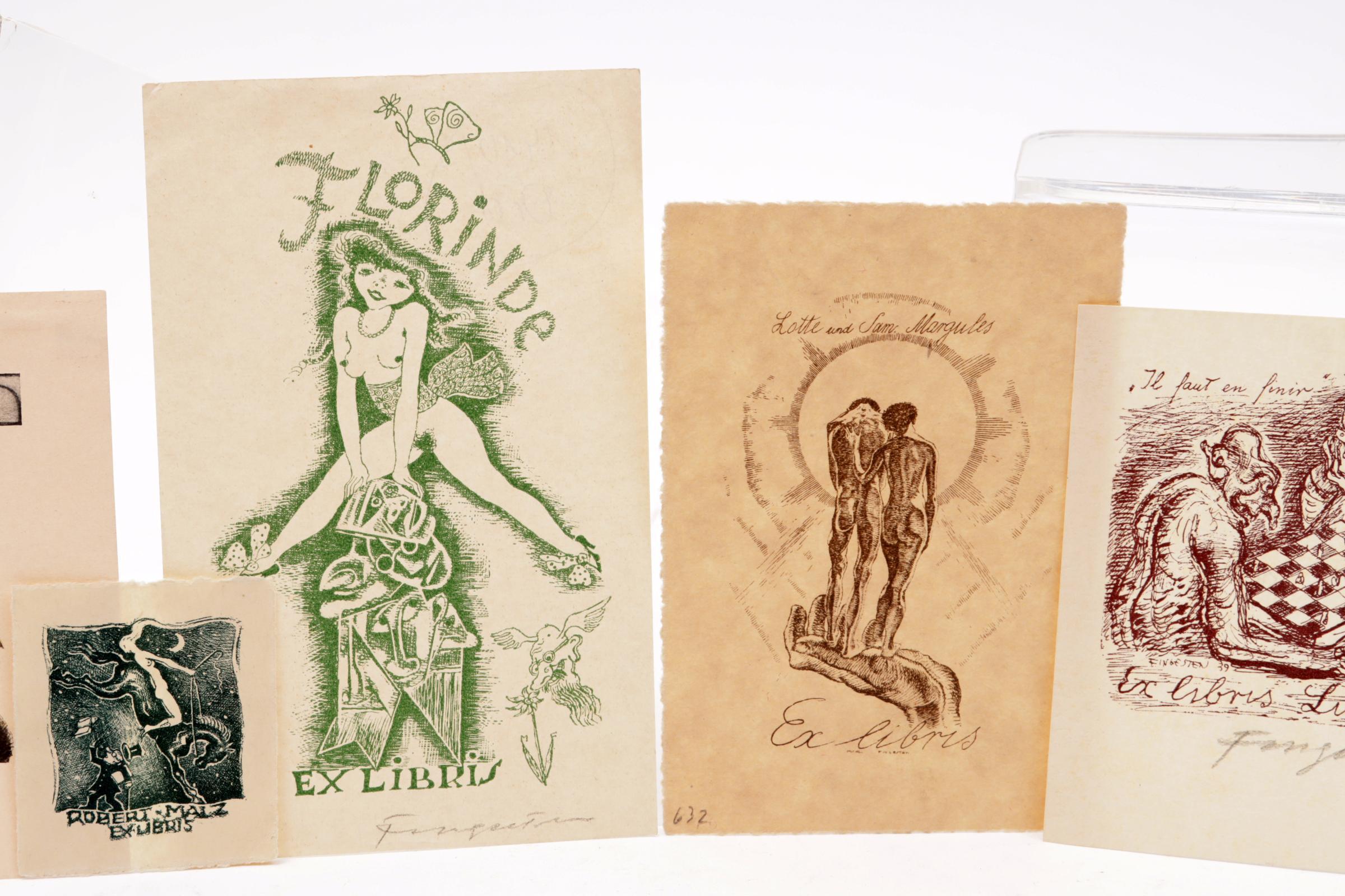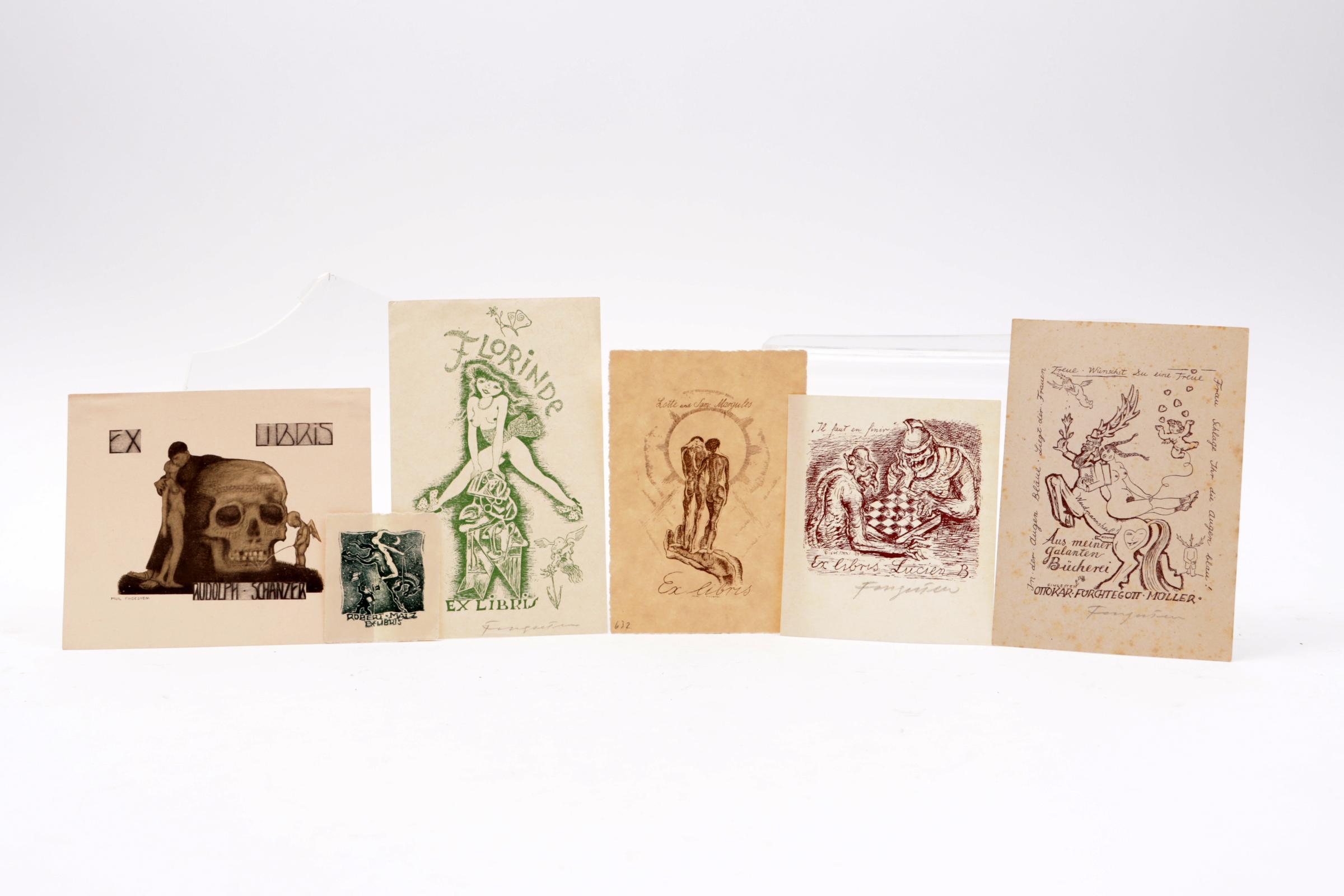 Fingesten, M., 6 exlibris / kleingrafiek, litho / cliché, deels opgeplakt (geweest), 3 x gesigneerd. Gemaakt voor: Margules, Malz, Lucien B., Florinde, Furchtegott-Mueller, Schanzer.