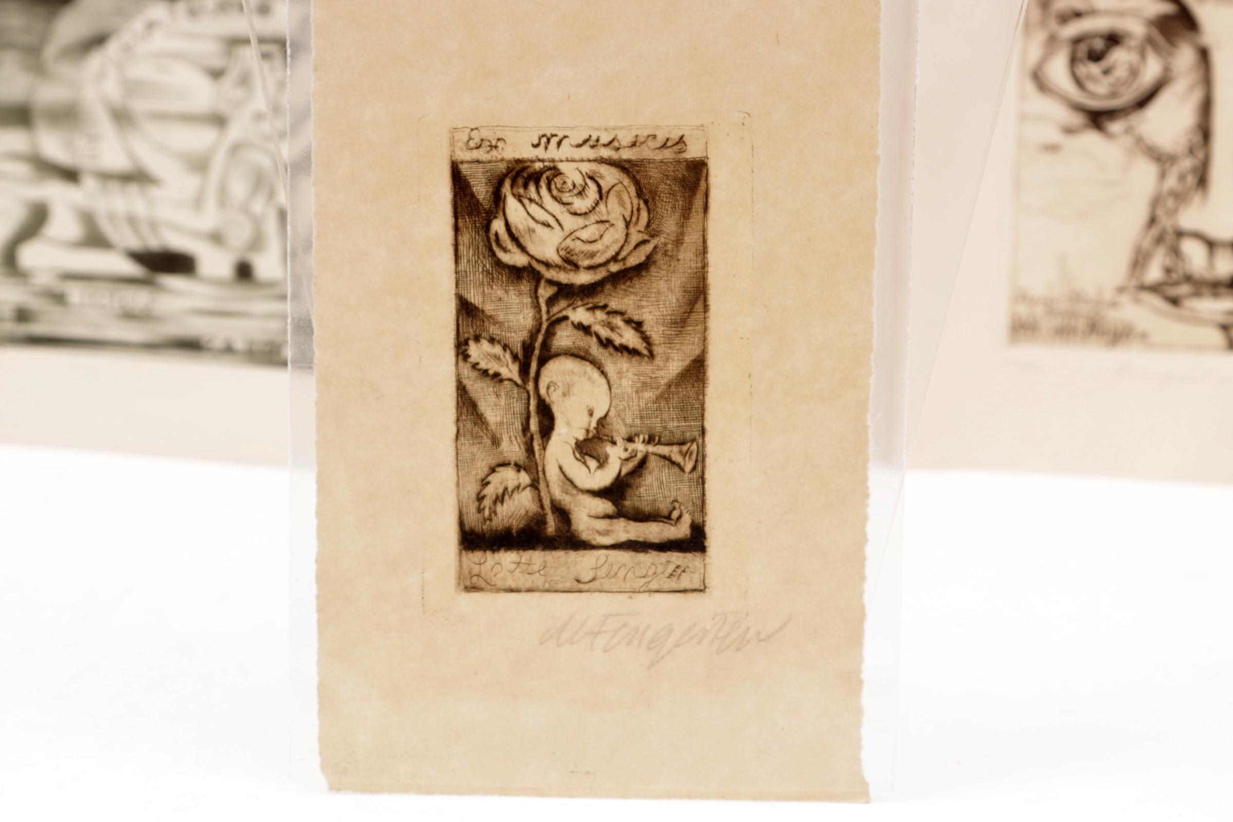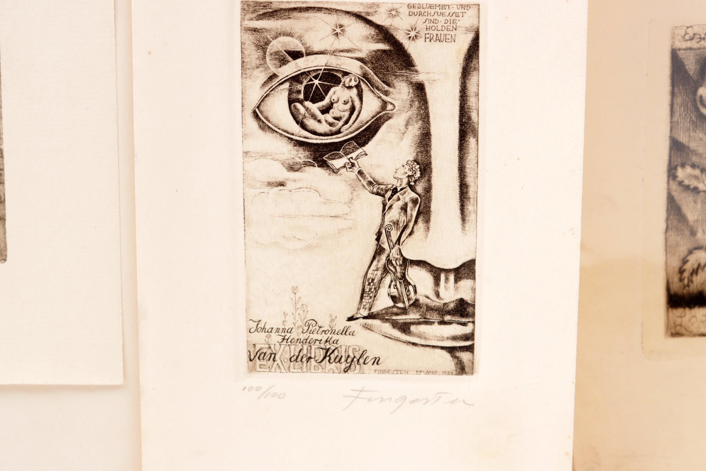 Fingesten, M., 4 exlibris, C3, 2 x gesigneerd. Deels opgeplakt geweest. Gemaakt voor: Senger, Van der Kuylen, Raimondo, Mantero