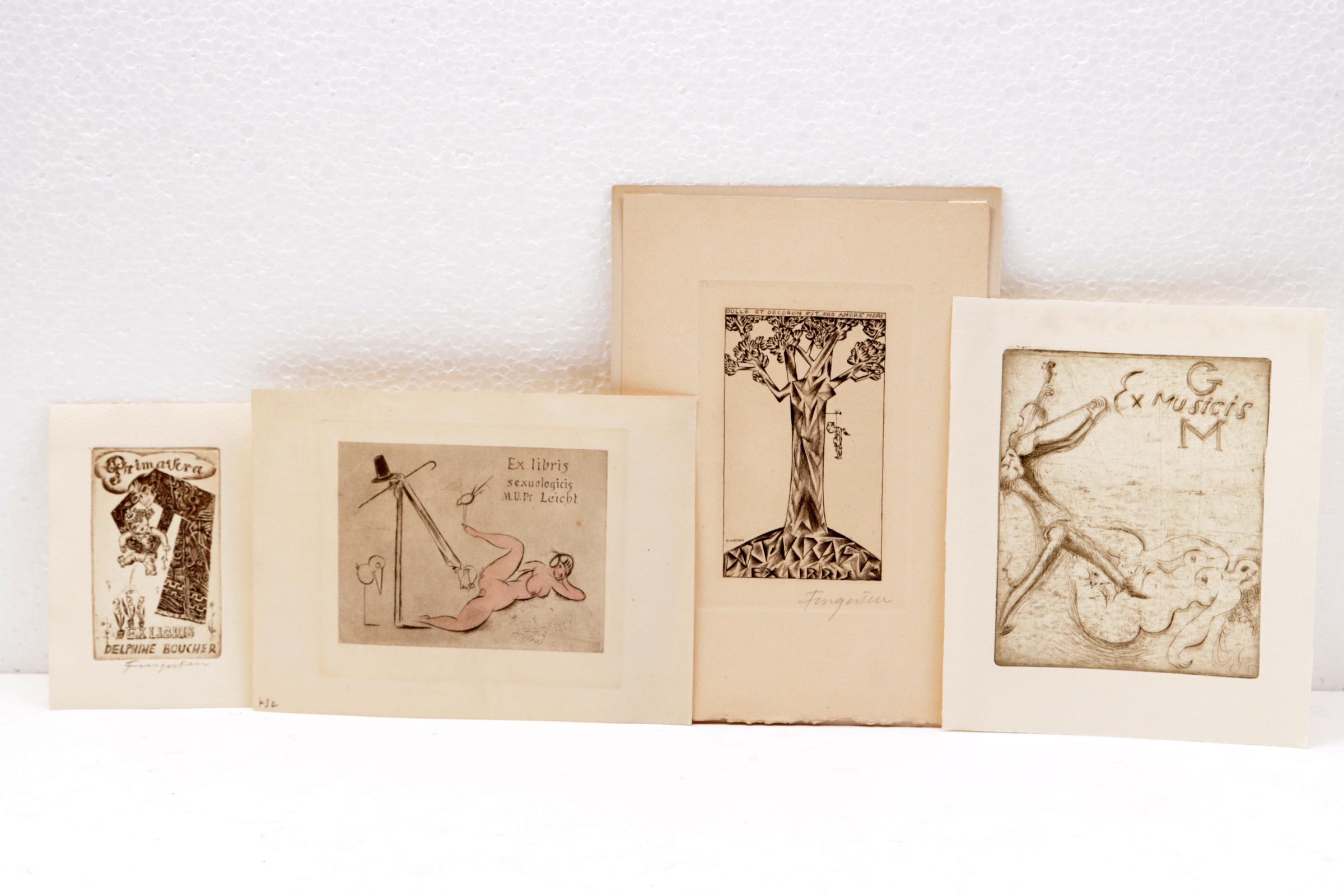 Fingesten, M., 4 exlibris, C3, 2 x gesigneerd. Deels opgeplakt geweest. Gemaakt voor: G.M., Leicht, Boucher, Art-Kraft