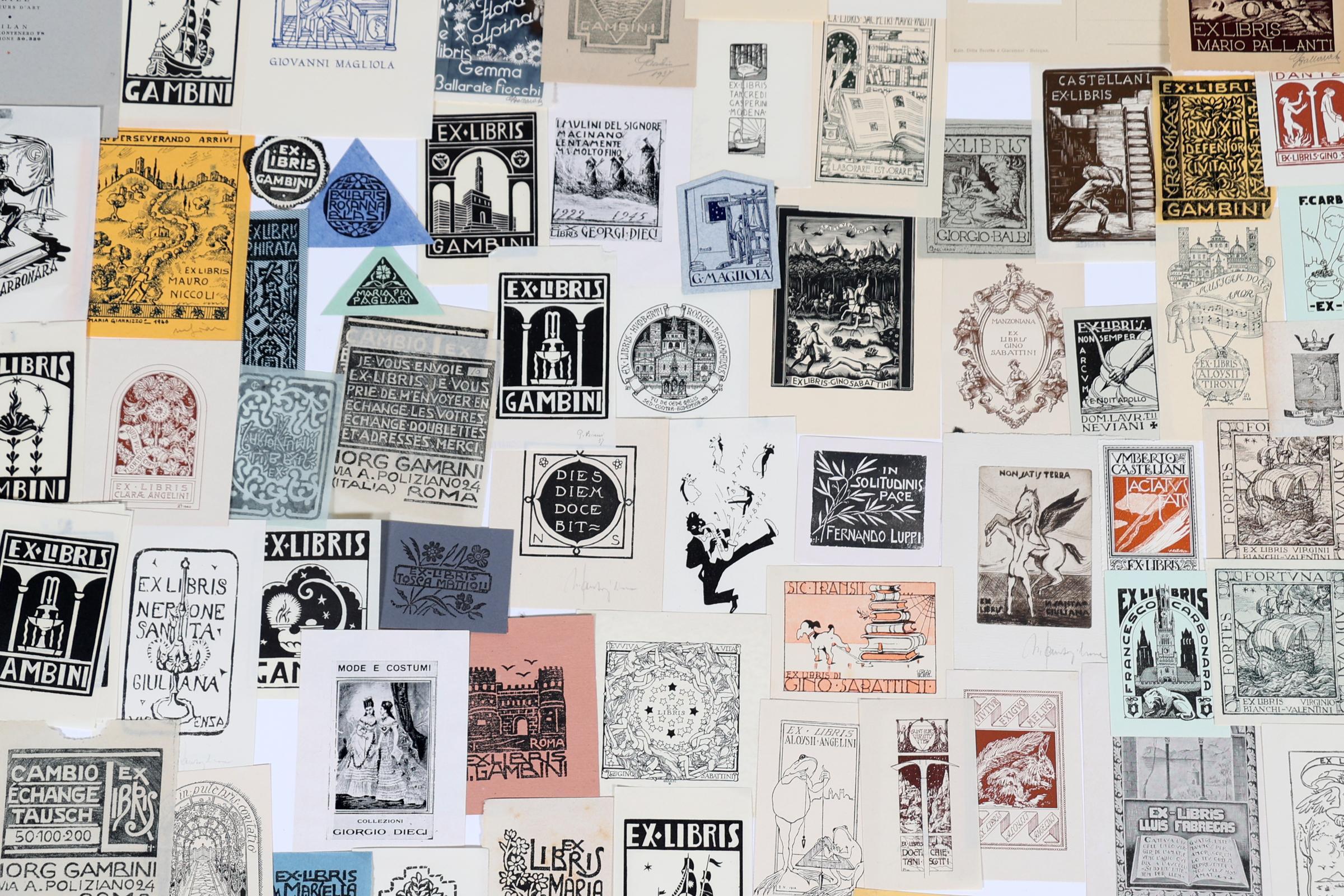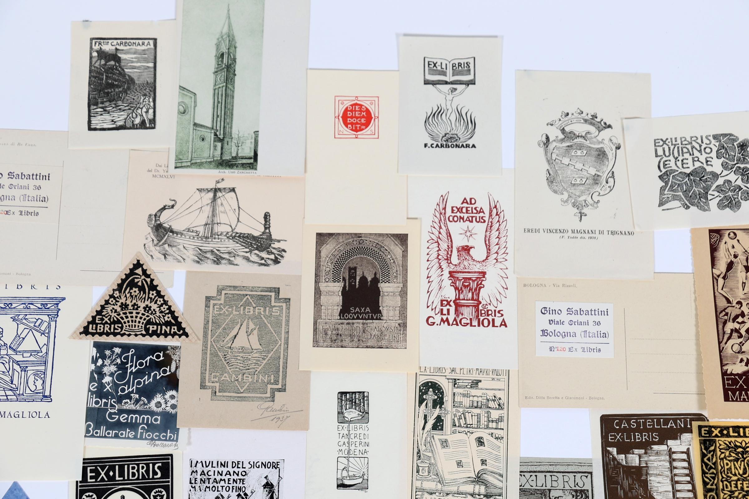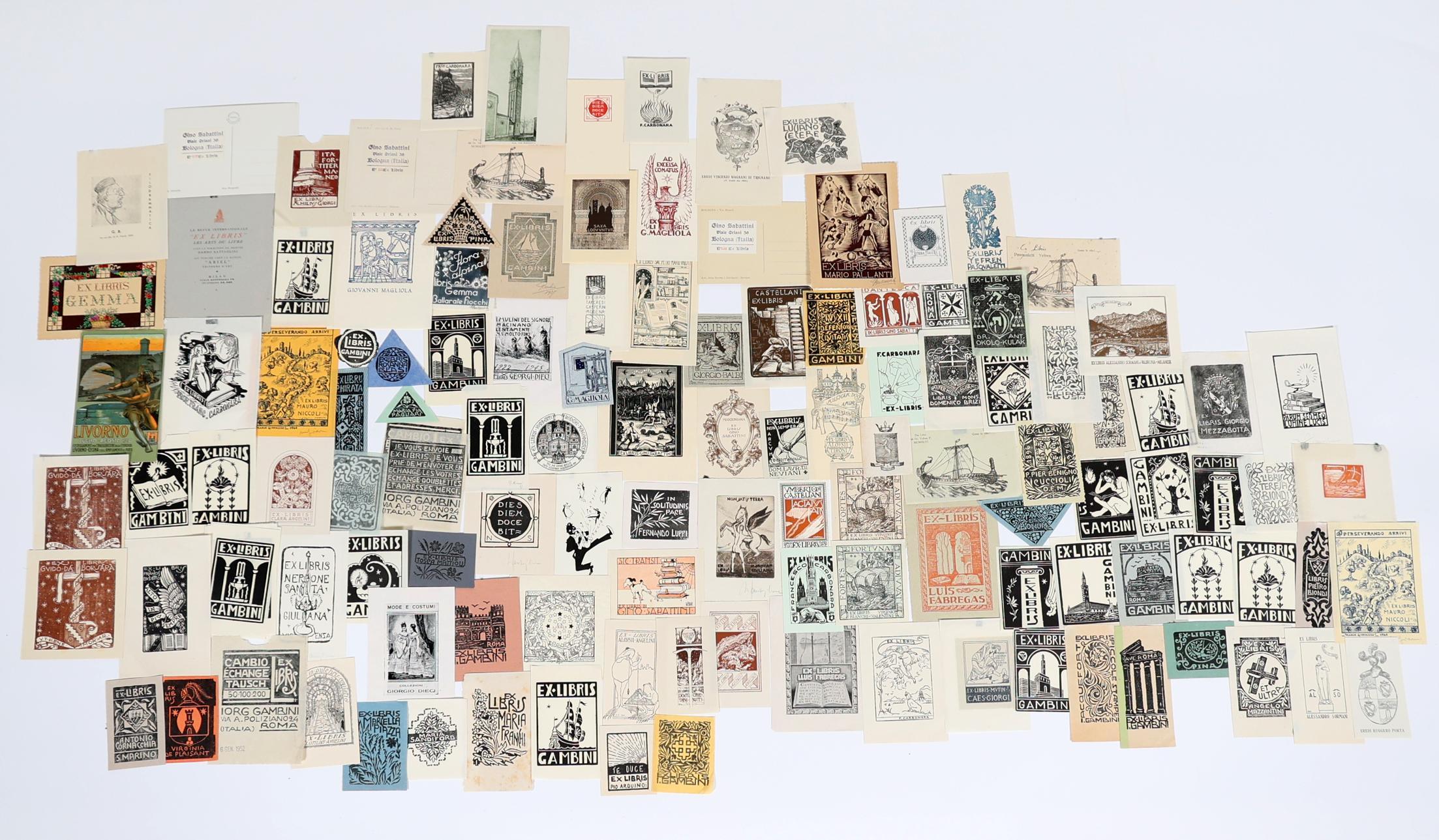 collectie van plm. 110 Italiaanse exlibris, voornamelijk uit de eerste helft van de 20-ste eeuw, voornamelijk hoogdruk / vlakdruk, niet gesigneerd, deels opgeplakt (geweest).