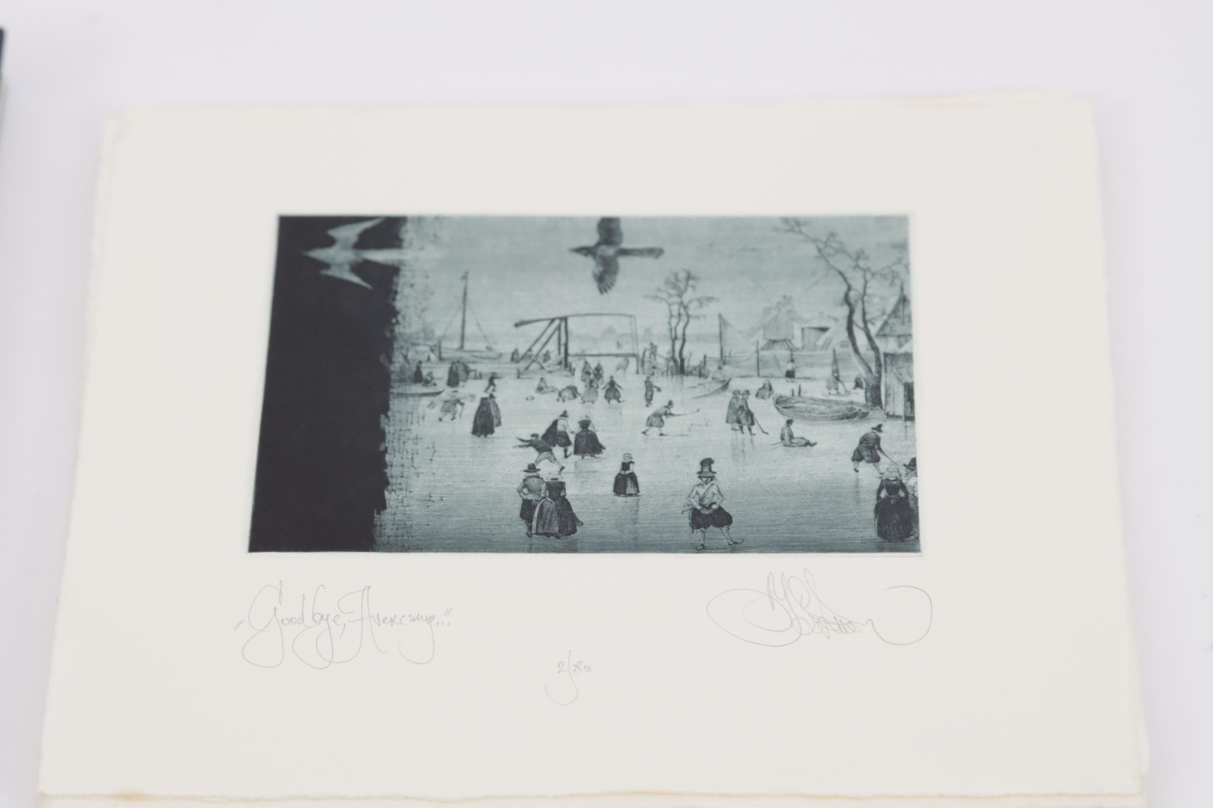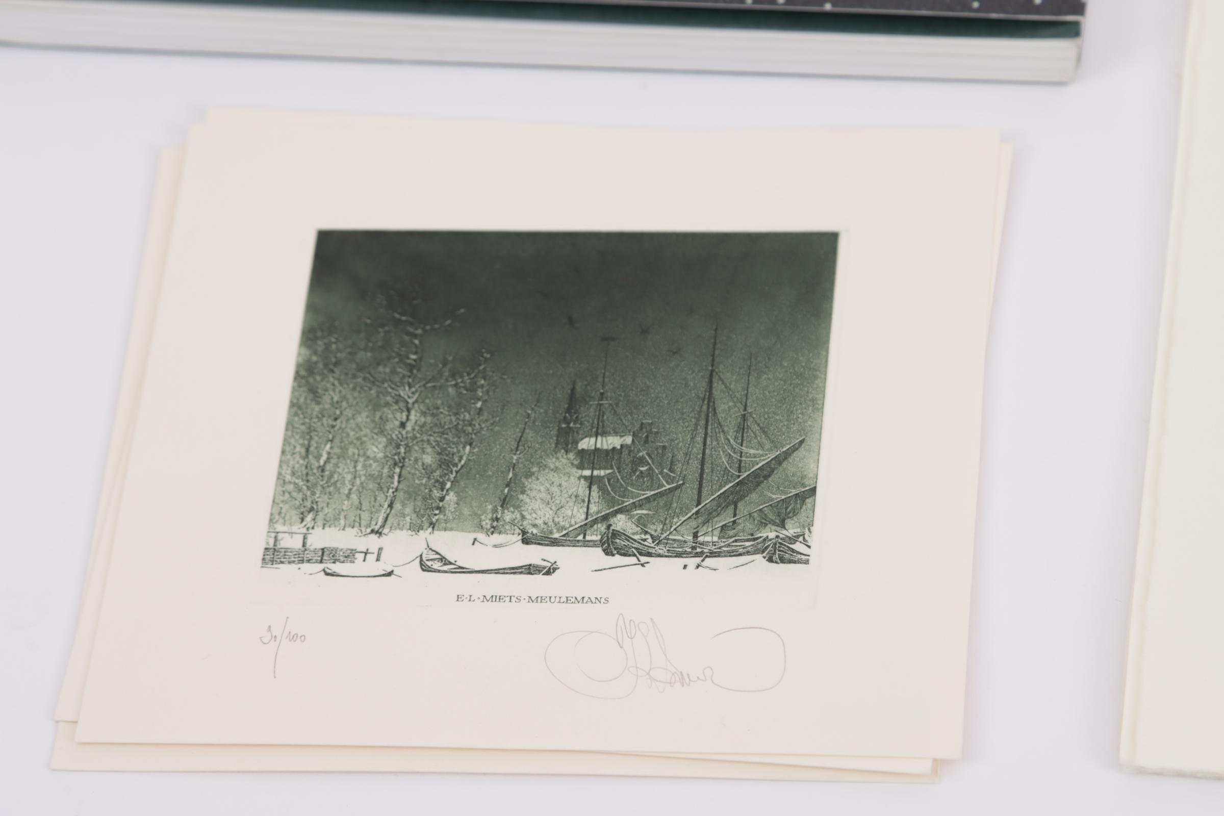 Kalynovych, K., exlibris voor Meulemans, ('Goodbeye Avercamp'), C3C5, genummerd en gesigneerd, 15 stuks (restoplage), plus exlibris Miets Meulemans, ('Winter'), C3, genummerd en gesigneerd, 3 stuks (restoplage), plus: 'Winterdreams', over het werk van Kalynovych, 2007, met gesigneerde opdracht van Kalynovych aan Meulemans.