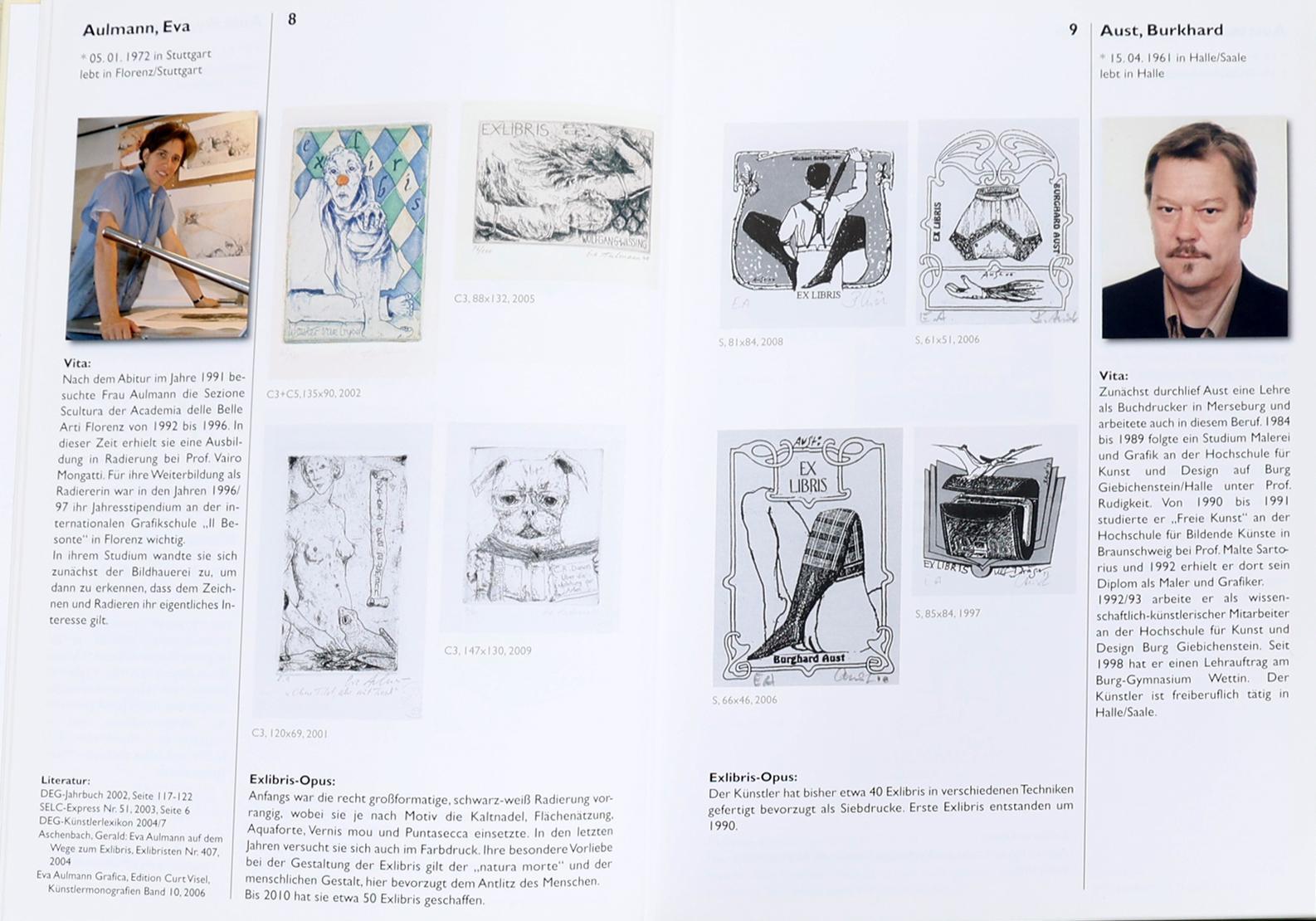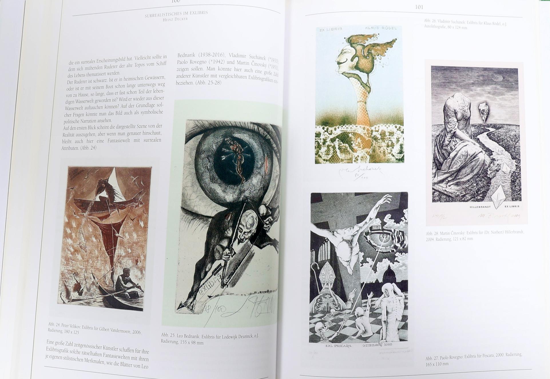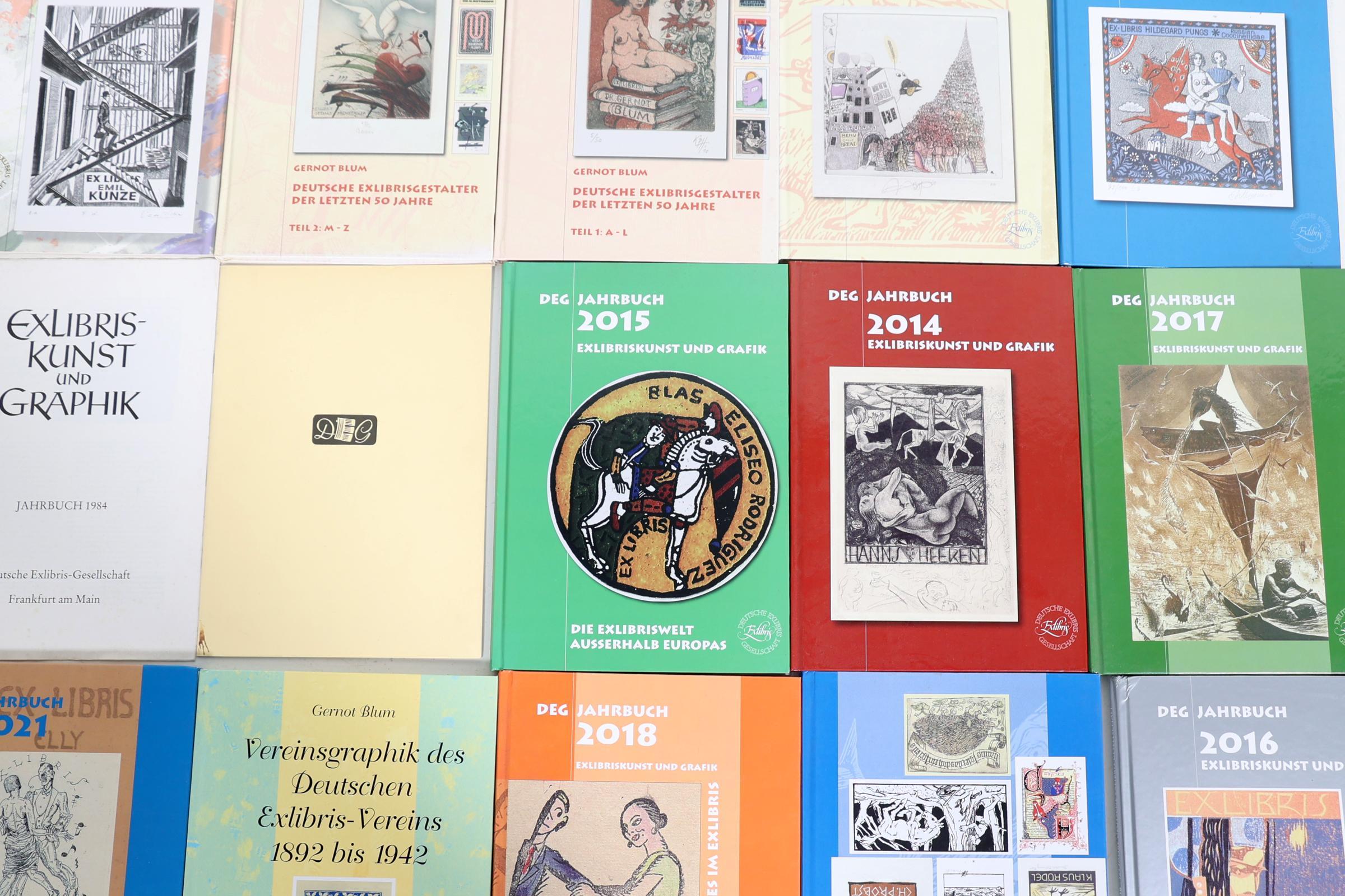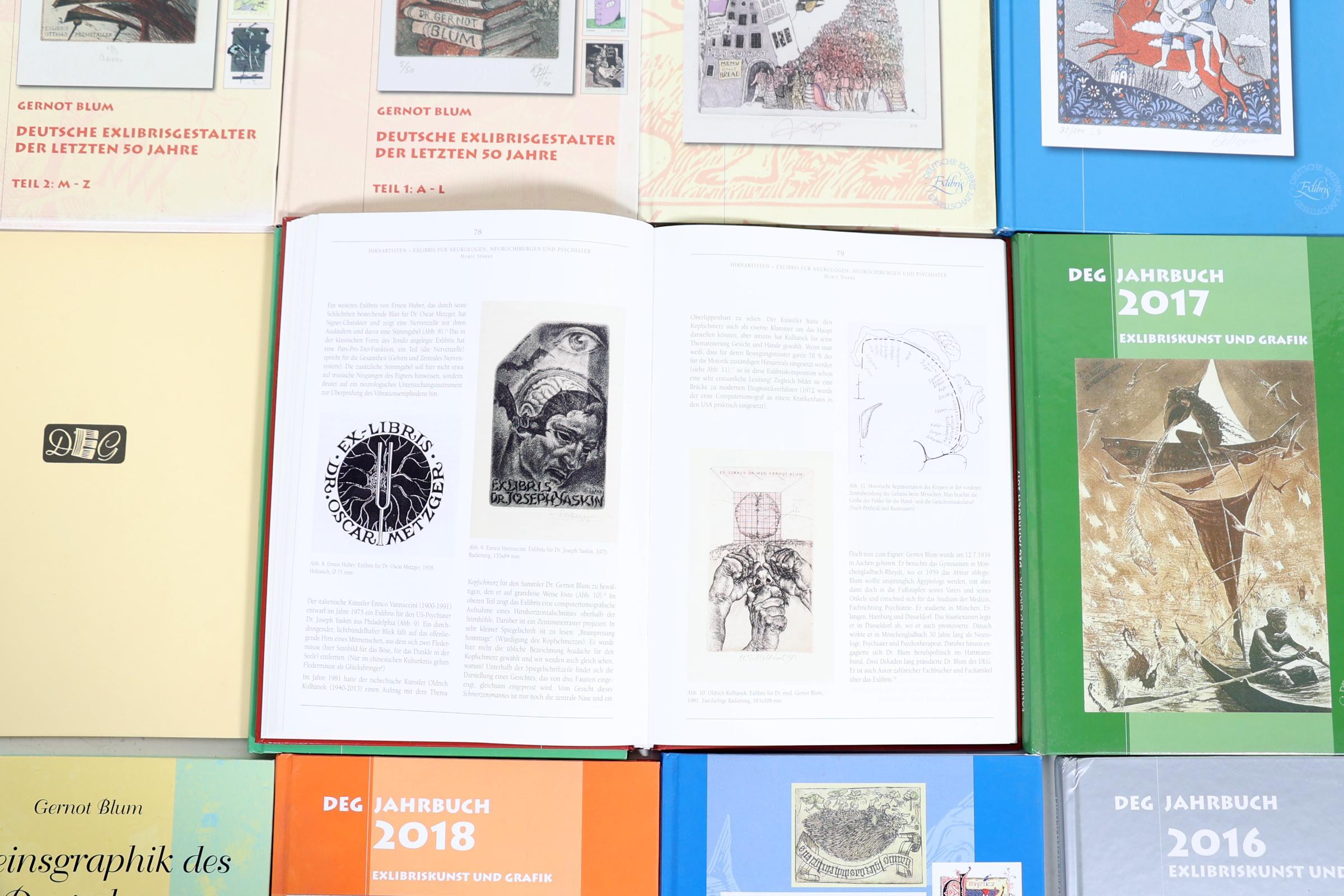 exlibris-literatuur, 12 'Jahrbuecher' van de Deutsche Exlibris Gesellschaft (1998, 2010, 2011, 2012, 2013, 2014, 2015, 2016, 2017, 2018, 2019, 2021), plus: ' Vereinsgraphik des DEG 1892 bis 1942 Blum. Veel ingeplakte originele grafiek, hardcover.
