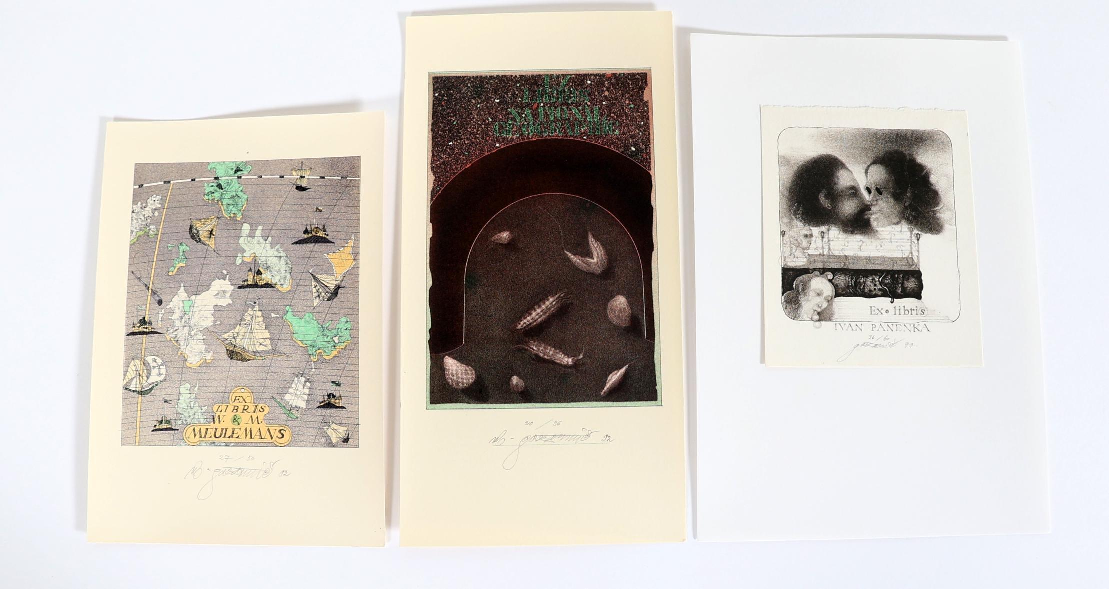 Gazovich, Vl., 3 exlibris, (Meulemans, Panenka, ?), meerkleurenlithoś, genummerd en gesigneerd