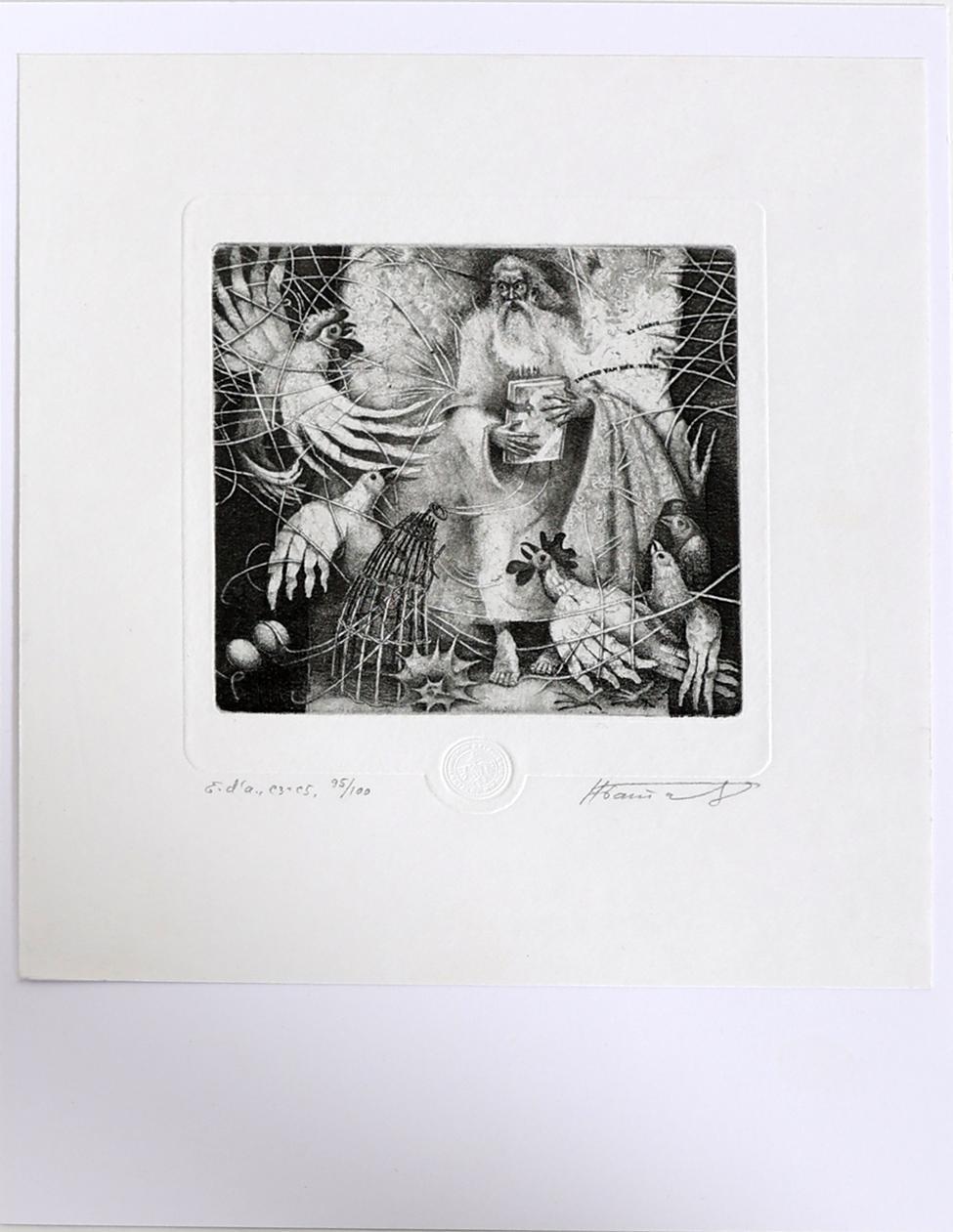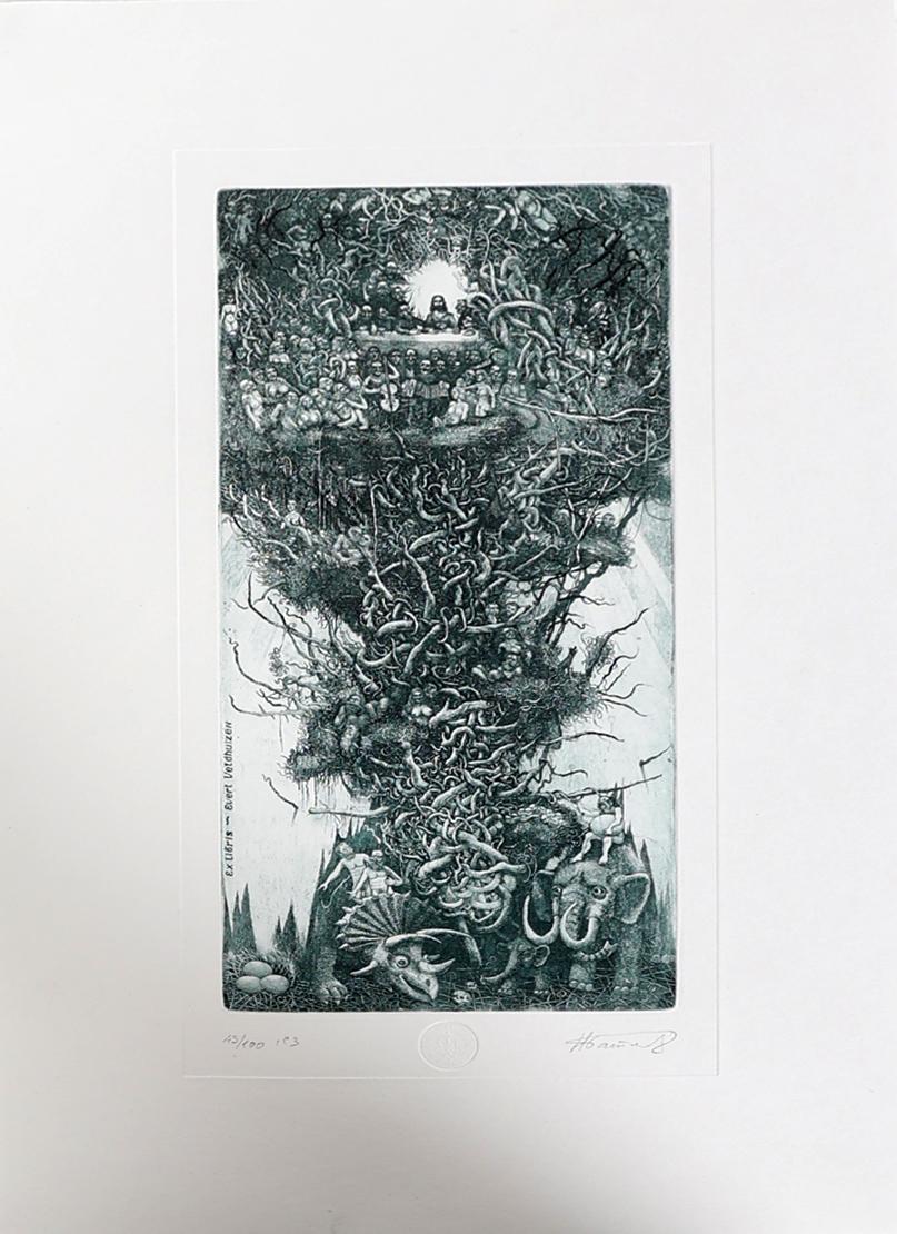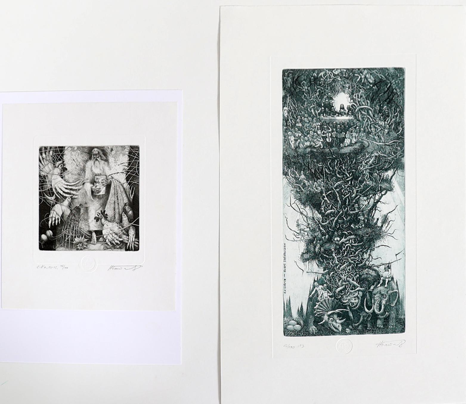 Batakov, N., 2 exlibris, (1. E.Veldhuizen, C3, 223x103 mm, genummerd en gesigneerd, 'tree of life'), 2. exlibris voor Ingrid van der Veen, C3C5, 85x85 mm, genummerd en gesigneerd, opgeplakt