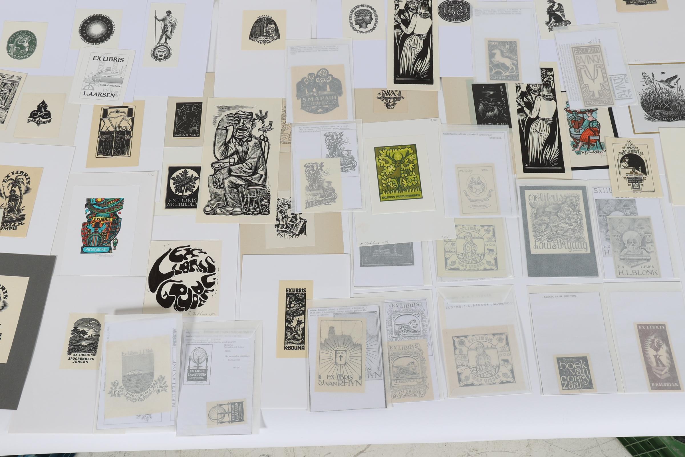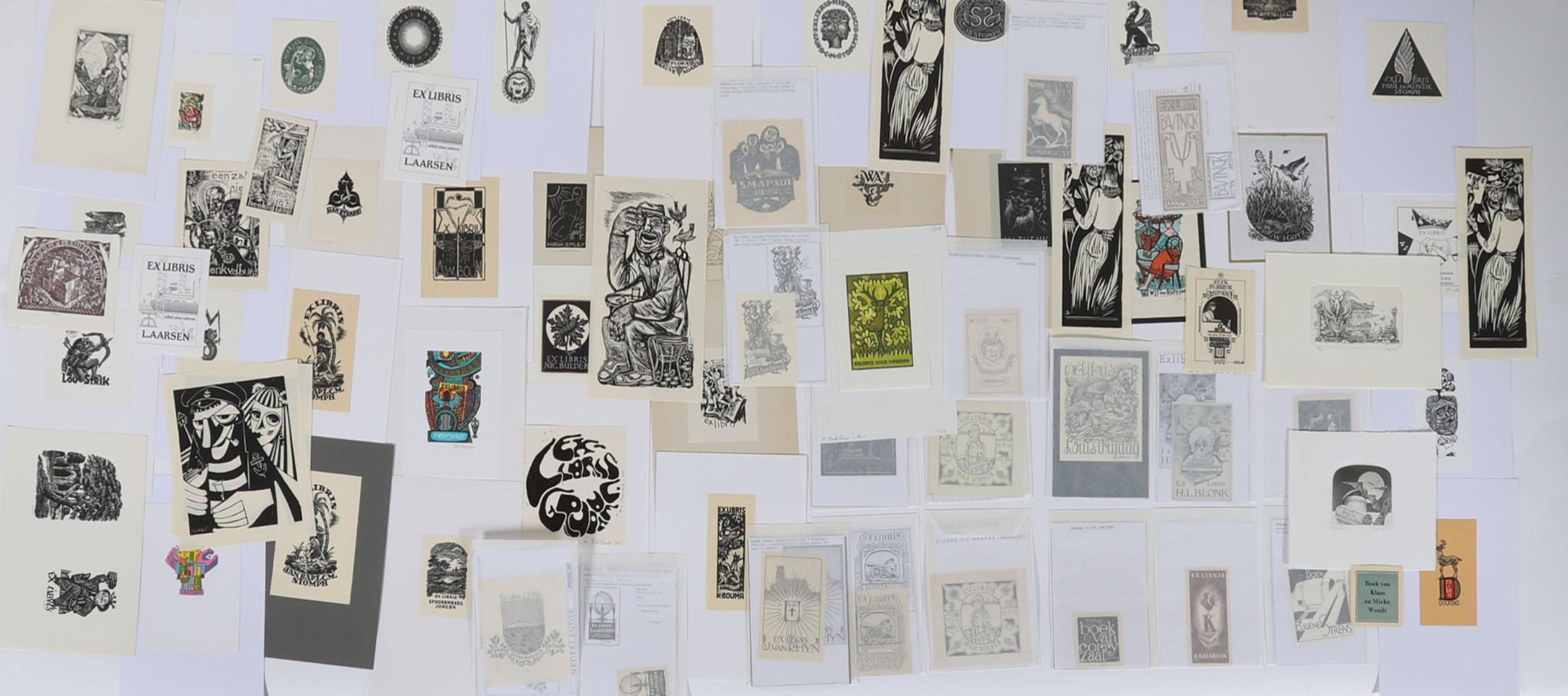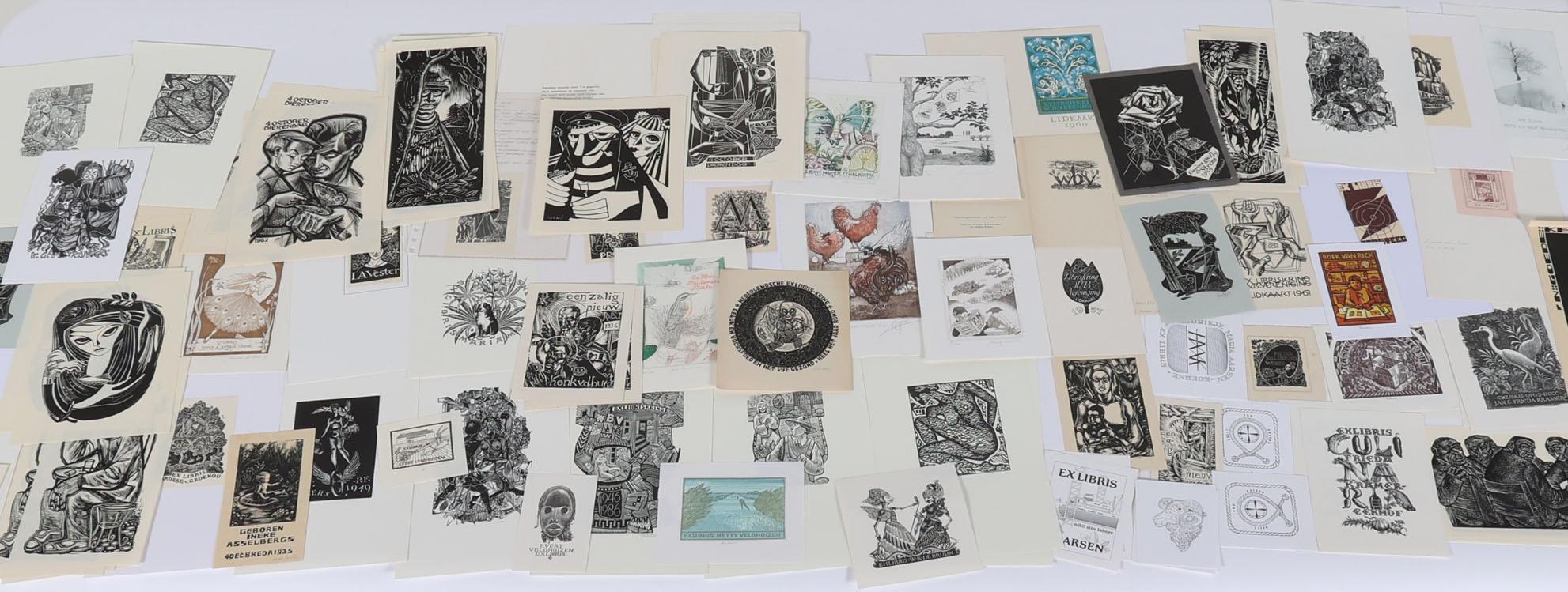 collectie 150 Nederlandse exlibris, voornamelijk hoogdrukken, deels gesigneerd, deels opgeplakt (geweest). Bevat een aantal doubletten. O.a. werk van Zwiers, Rueter, Lazarov, De Vries, Schmuell, Van Doorn, Van Hell, Strik, Battermann, etc.