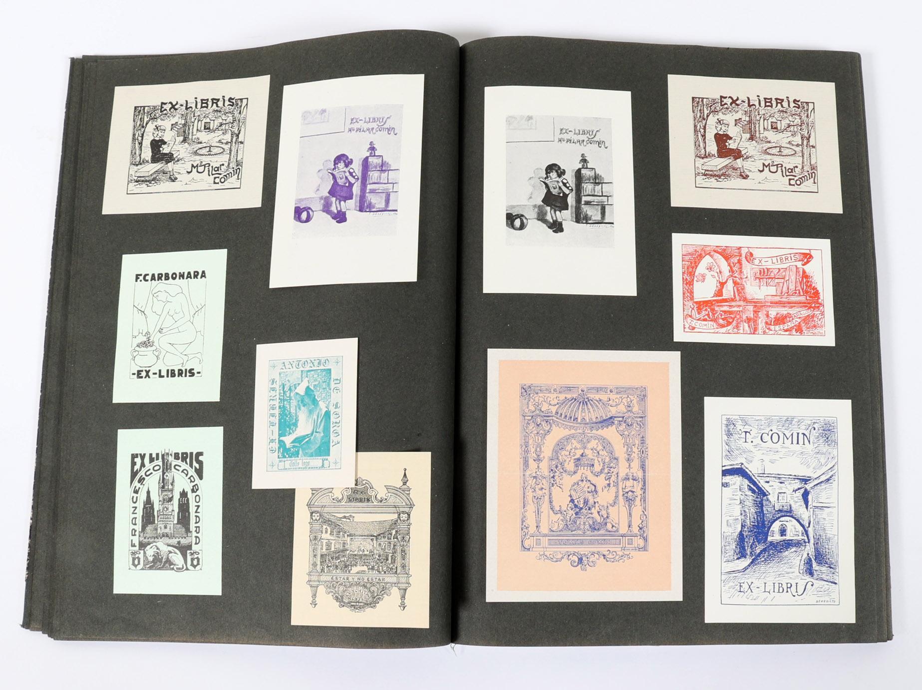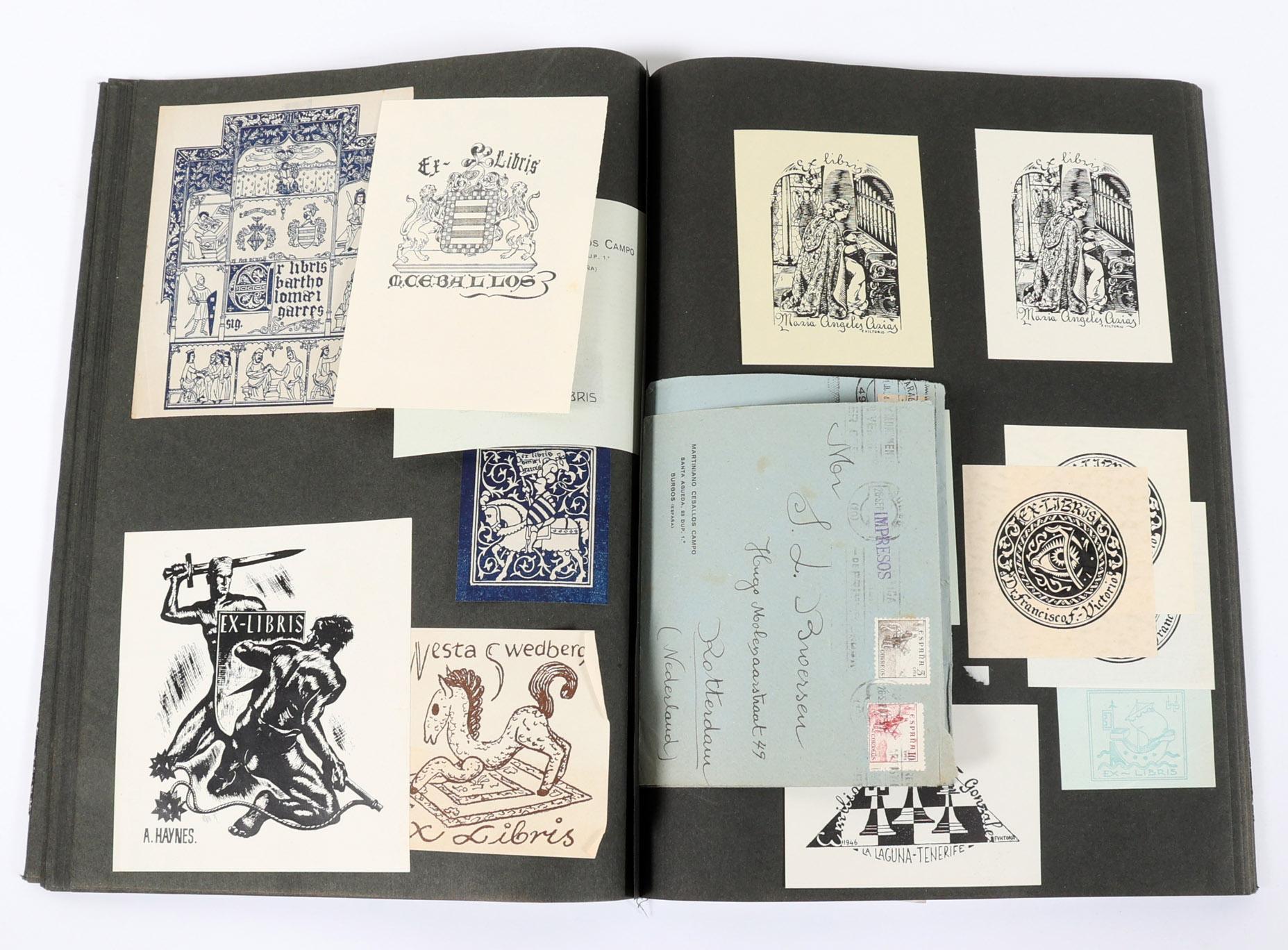 collectie plm, 400 Spaanse exlibris, voornamelijk eerste helft vorige eeuw, voornamelijk hoogdruk, ingeplakt in boek, bevat doubletten en kleurvarianten, niet gesigneerd.