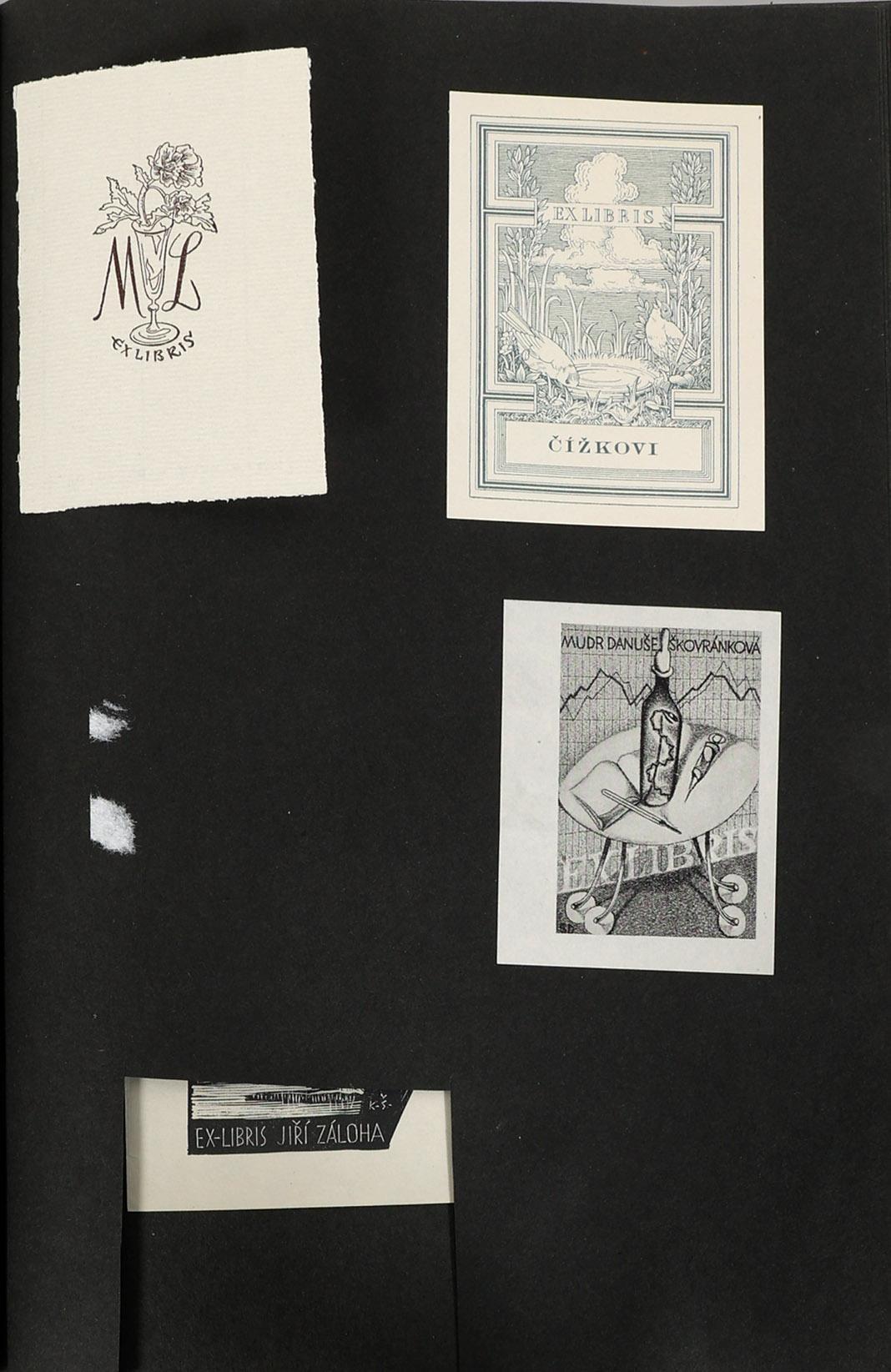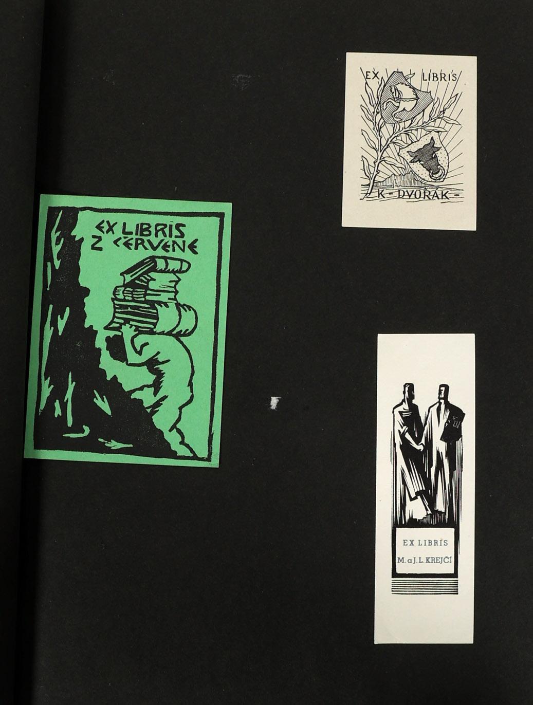 collectie van plm. 225 exlibris en kleingrafiek uit Tsjecho-Slowakije, voornamelijk eerste helft vorige eeuw, opgeplakt in boek, voornamelijk hoogdruk / vlakdruk, niet gesigneerd. O.a. werk van Dolezal, Danihelka, Oldrich Karel, Vodraszka, Hodek, Marik, Beranek, Stastny, Kobliha.