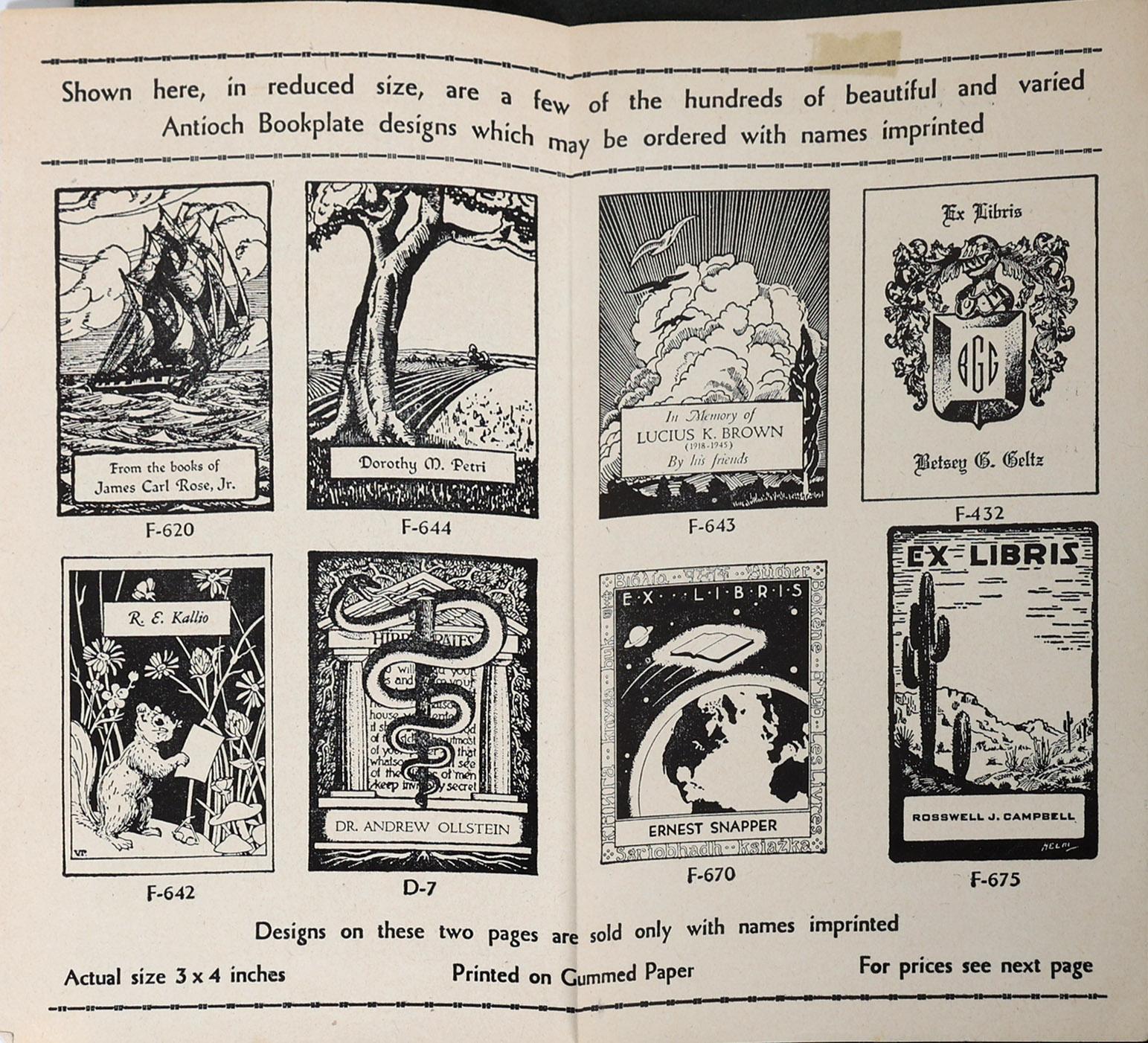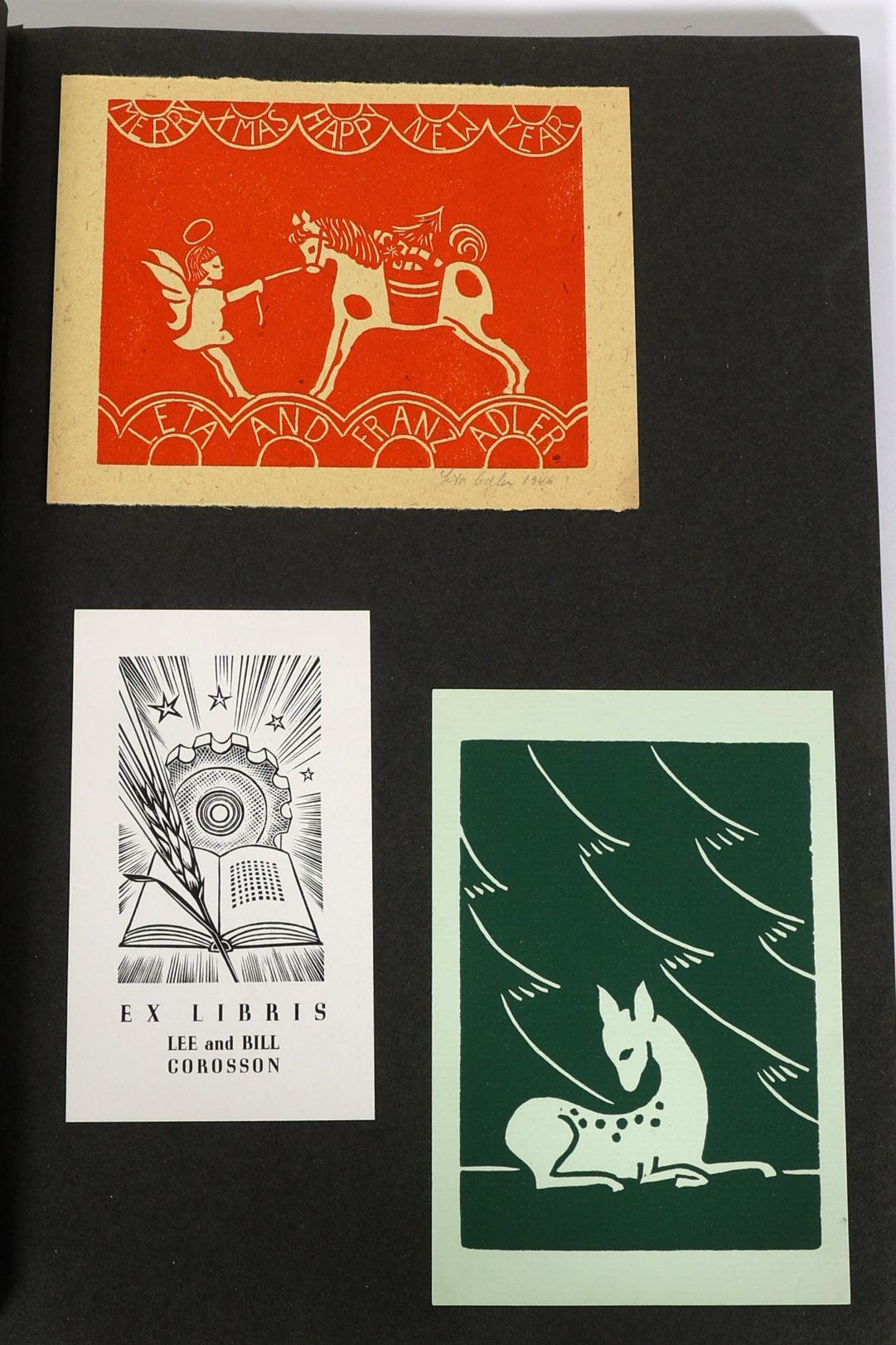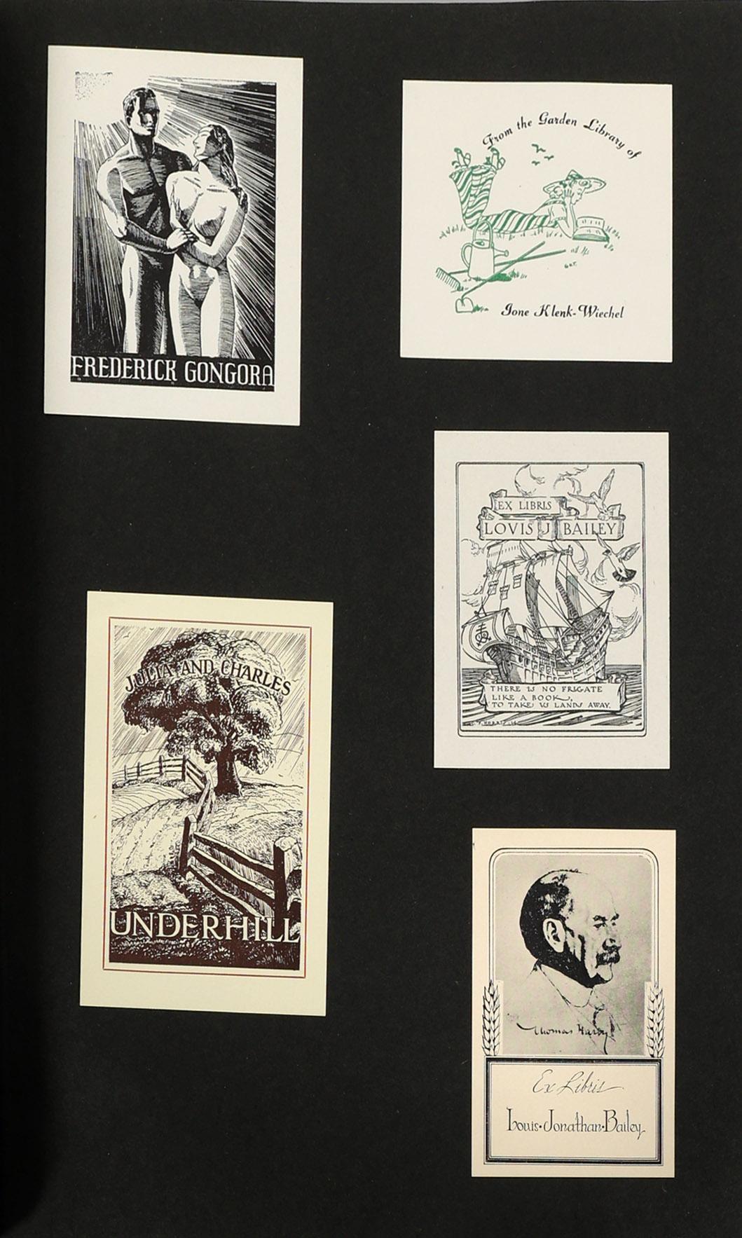 collectie Amerikaanse exlibris, plm. 50 stuks, voornamelijk hoogdruk, eerste helft vorige eeuw, opgeplakt in boek, niet gesigneerd
