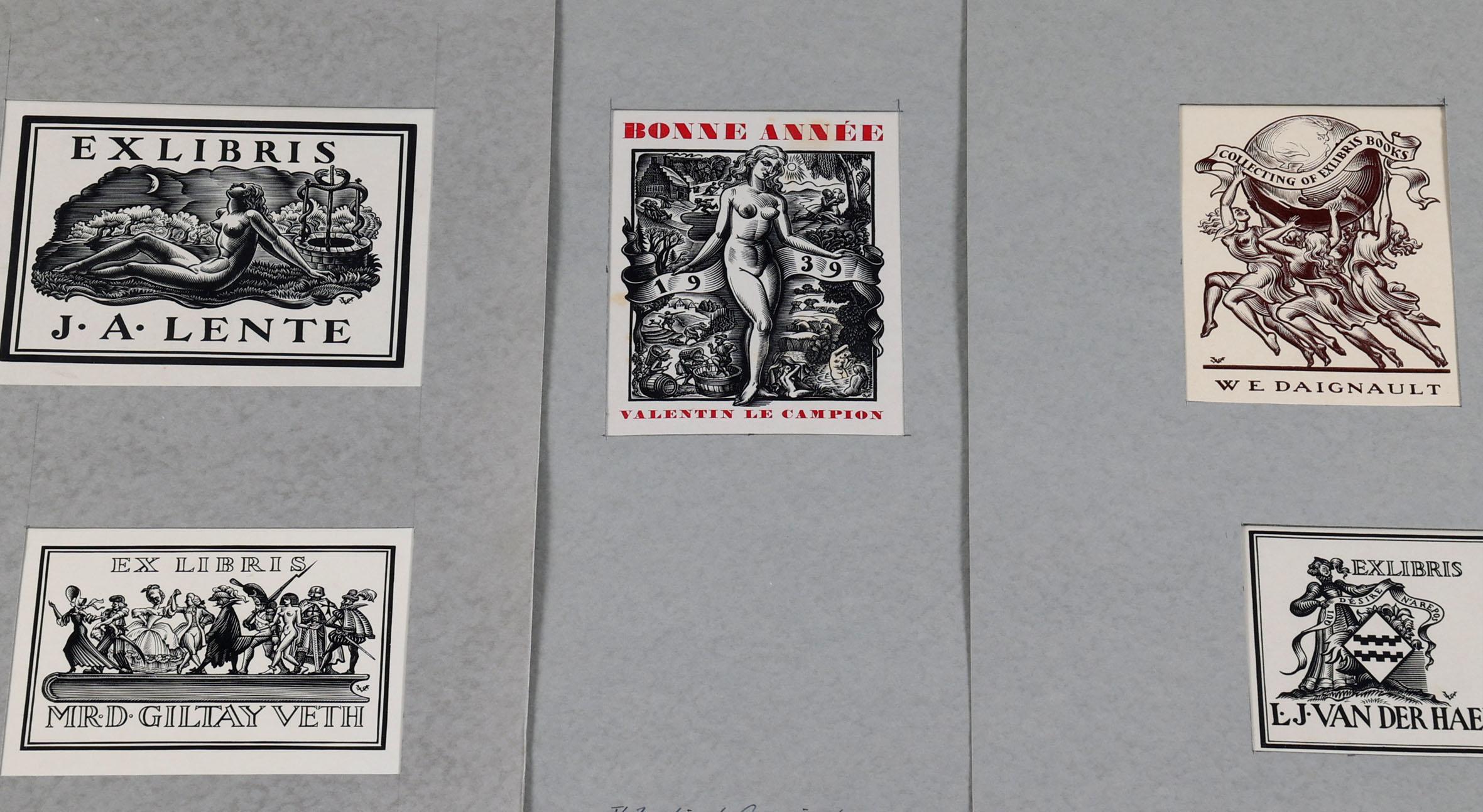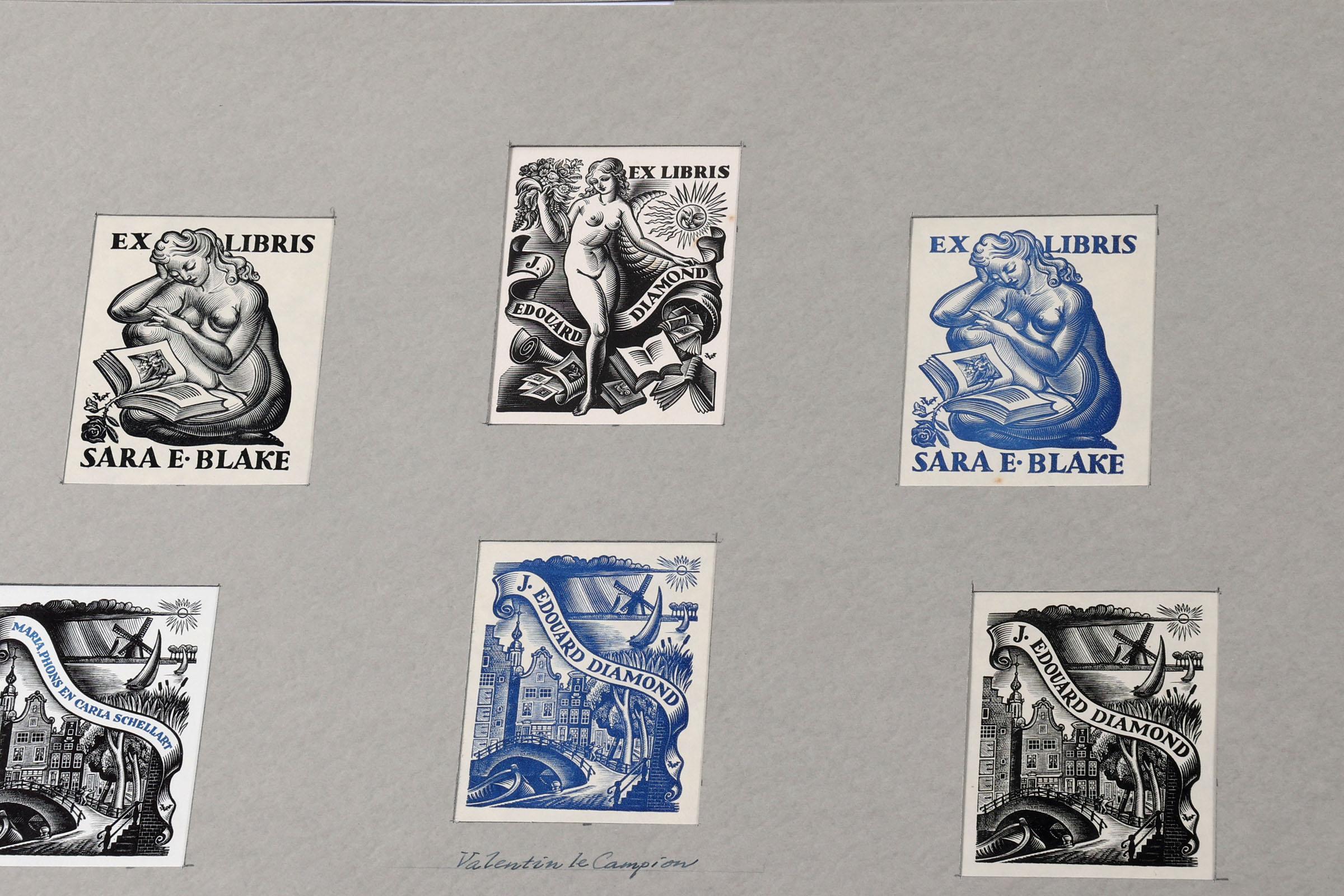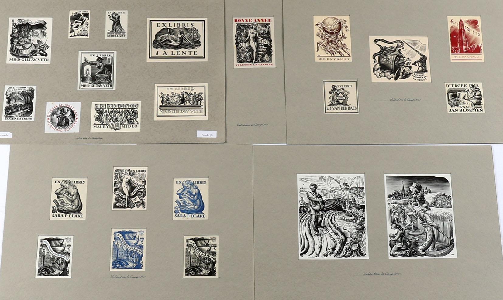 Campion, V. le, 25 x exlibris / kleingrafiek, X1, niet gesigneerd, opgeplakt op grote vellen.