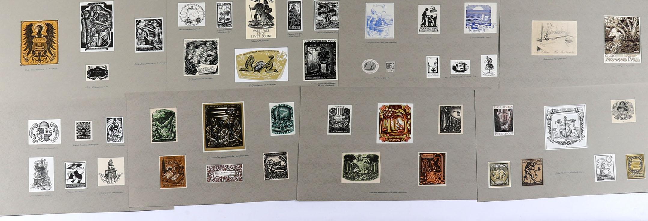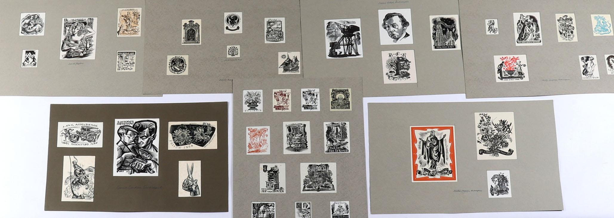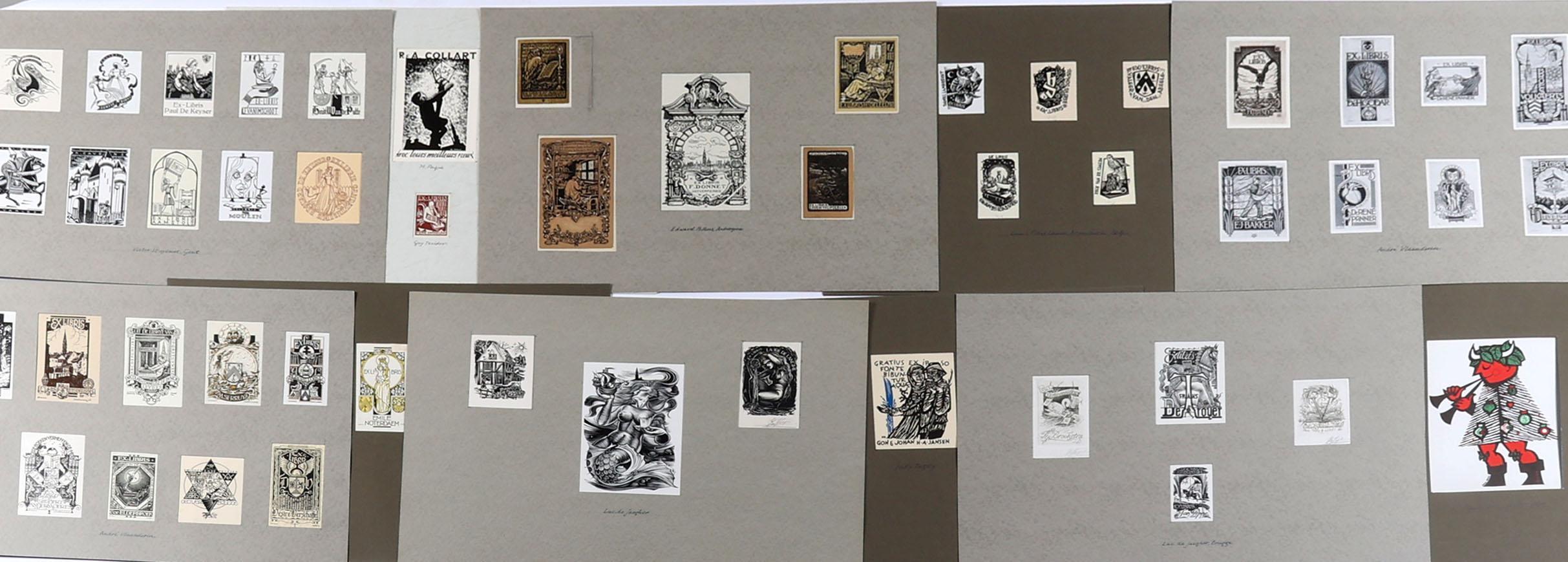 collectie (oudere) met plm. 130 Belgische exlibris en kleingrafiek,voornamelijk houtsnede / houtgravure. Opgeplakt op grote vellen. Niet gesigneerd. O.a. Keuterickx, Lasure, Pellens, Stuyvaert, Vlaanderen, de Jaegher, Acket, Degouy, Gaudaen).
