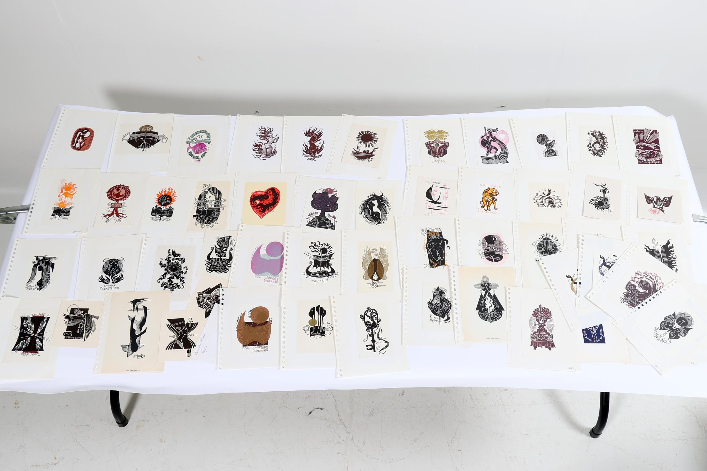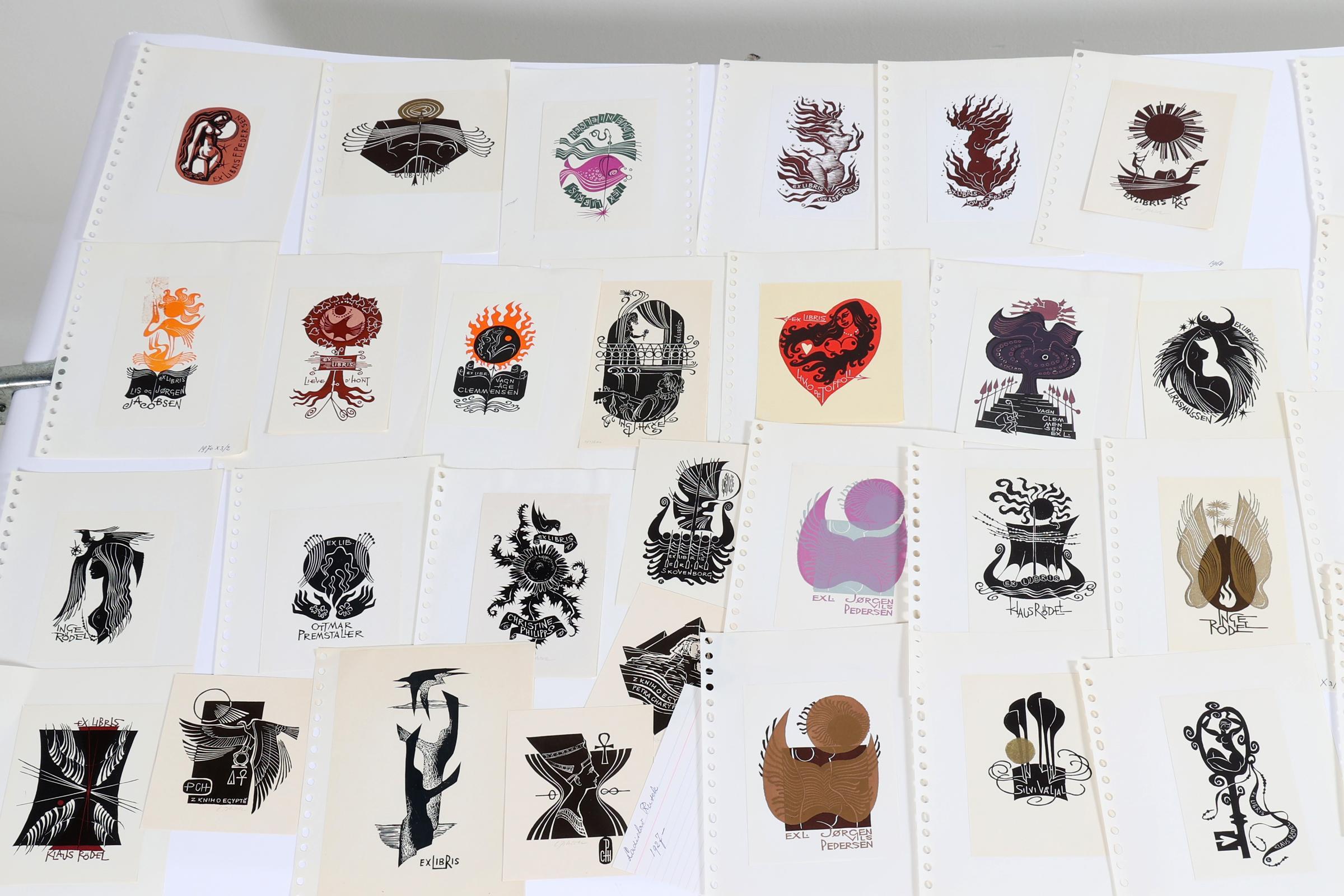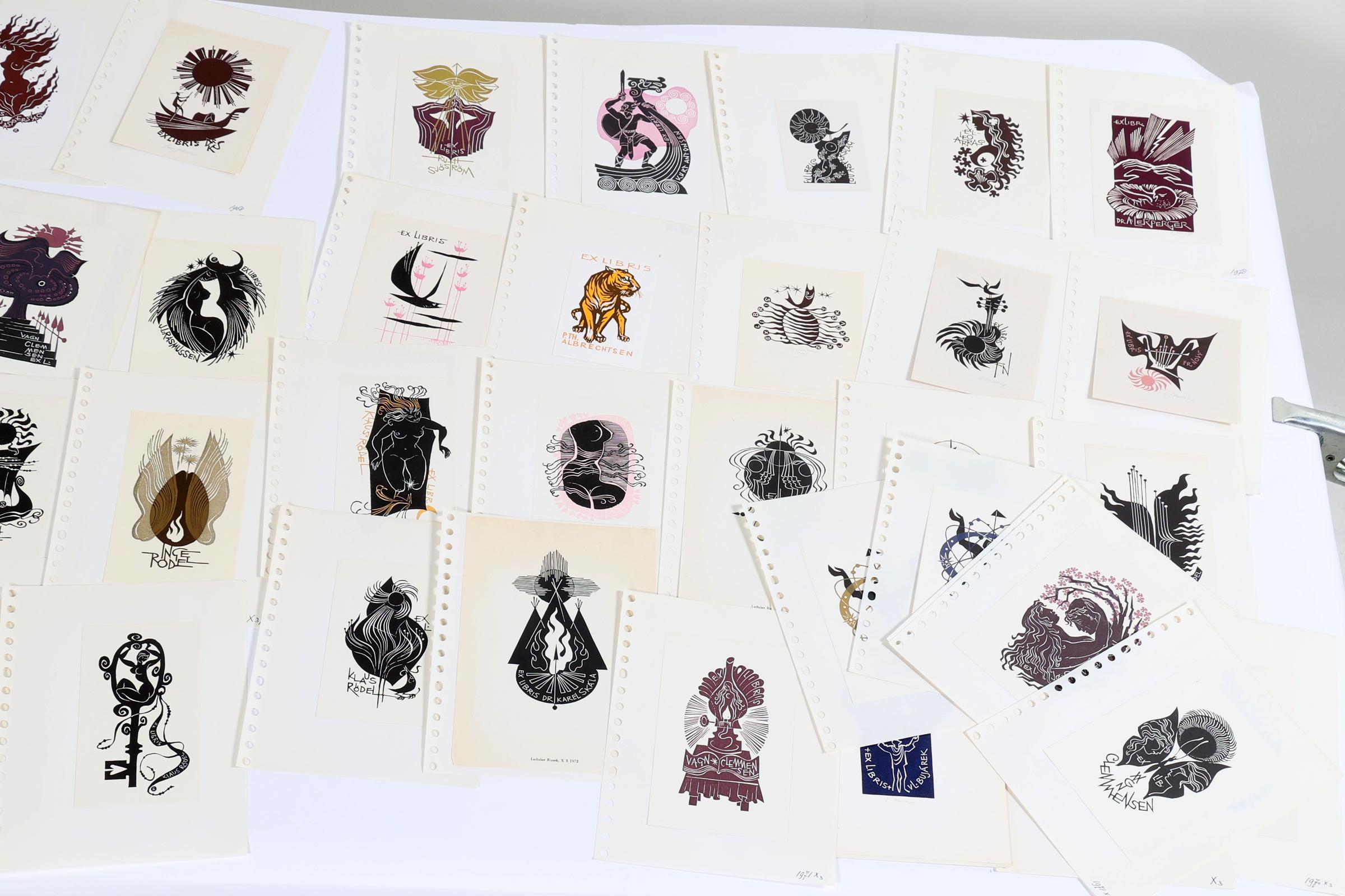 Rusek, L., plm. 50 exlibris / kleingrafiek, X3, deels meerkleuren, deels gesigneerd, deels opgeplakt