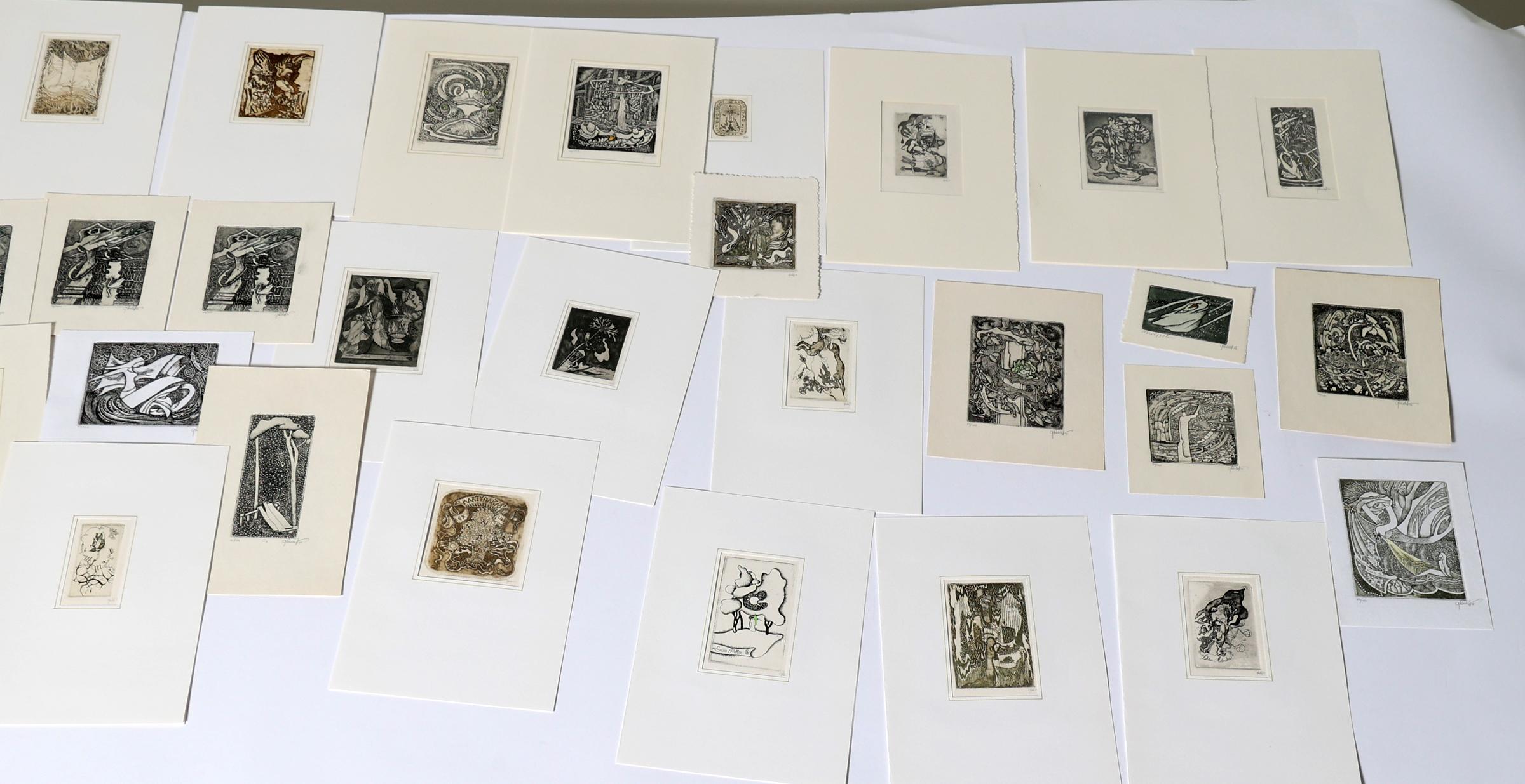 collectie van plm. 35 exlibris gemaakt door kunstenaars uit Estland / Letland / Litauen, C3 (deels ingekleurd / meerkleuren), gesigneerd, deels opgeplakt. Vooral Didelyte, plus Cepauskas