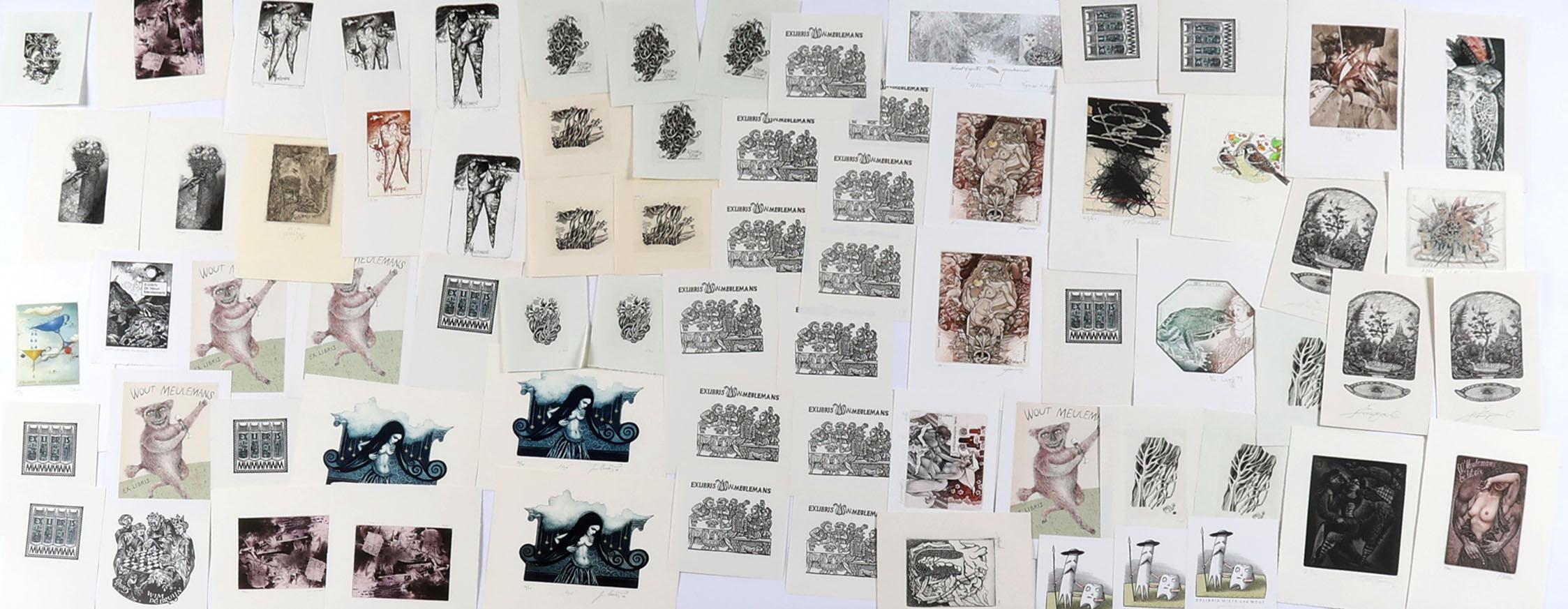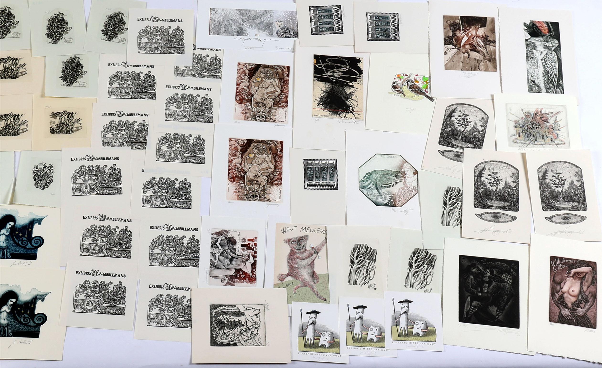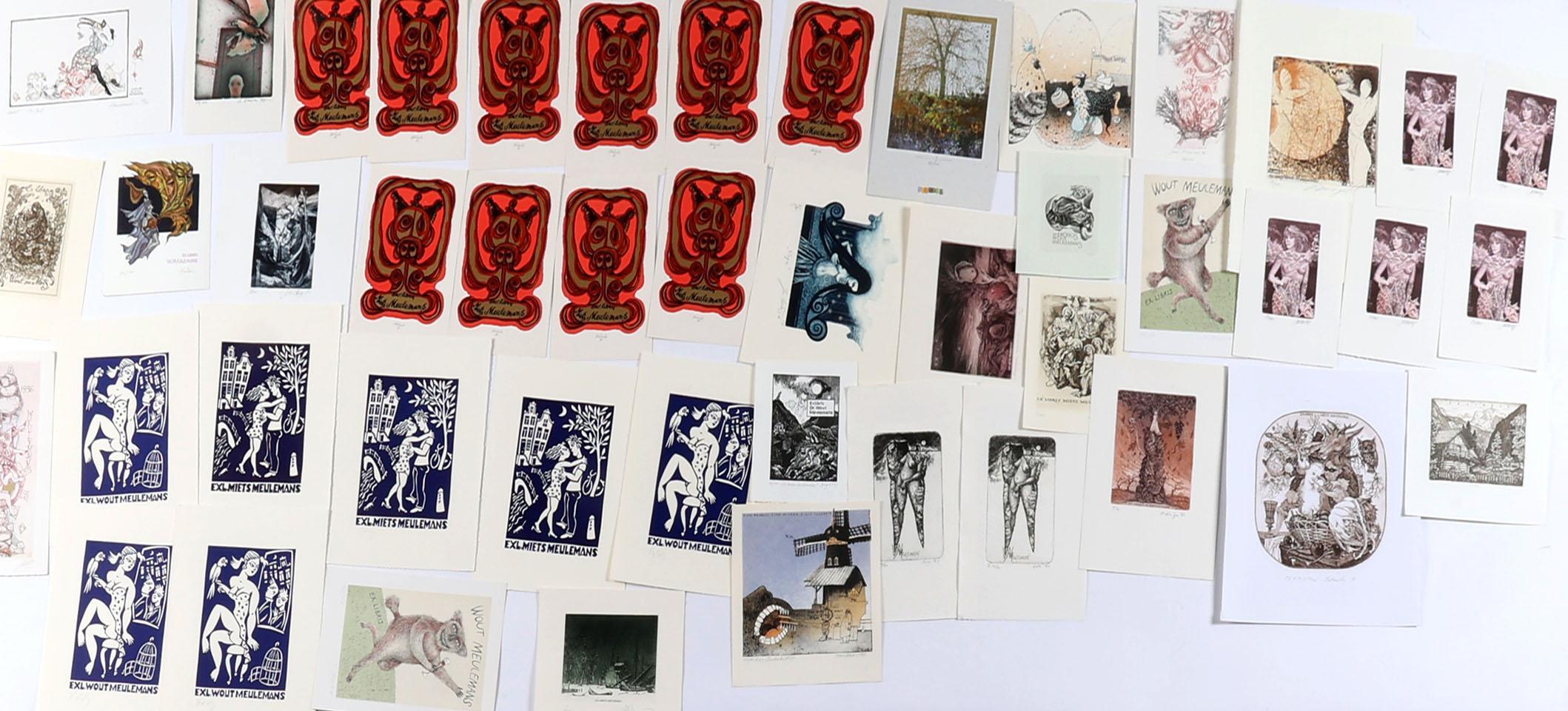 collectie van plm. 80 stuks exlibris en kleingrafiek op naam van Meulemans. Deels diepdruk, deels hoogdruk / vlakdruk. Deels gesigneerd. Bevat doubletten. Werk van o.a. J. Werner, Jakubowski, Saltenyte, Rulf, Battermann, Cernos, Benenson, Mezl, Jirka, Baeyens, etc.