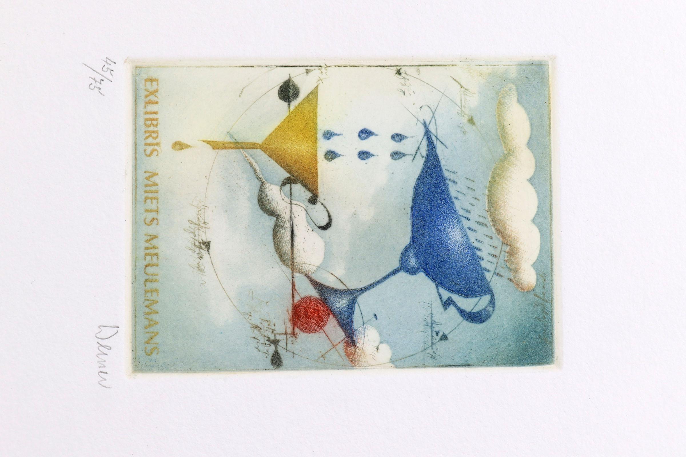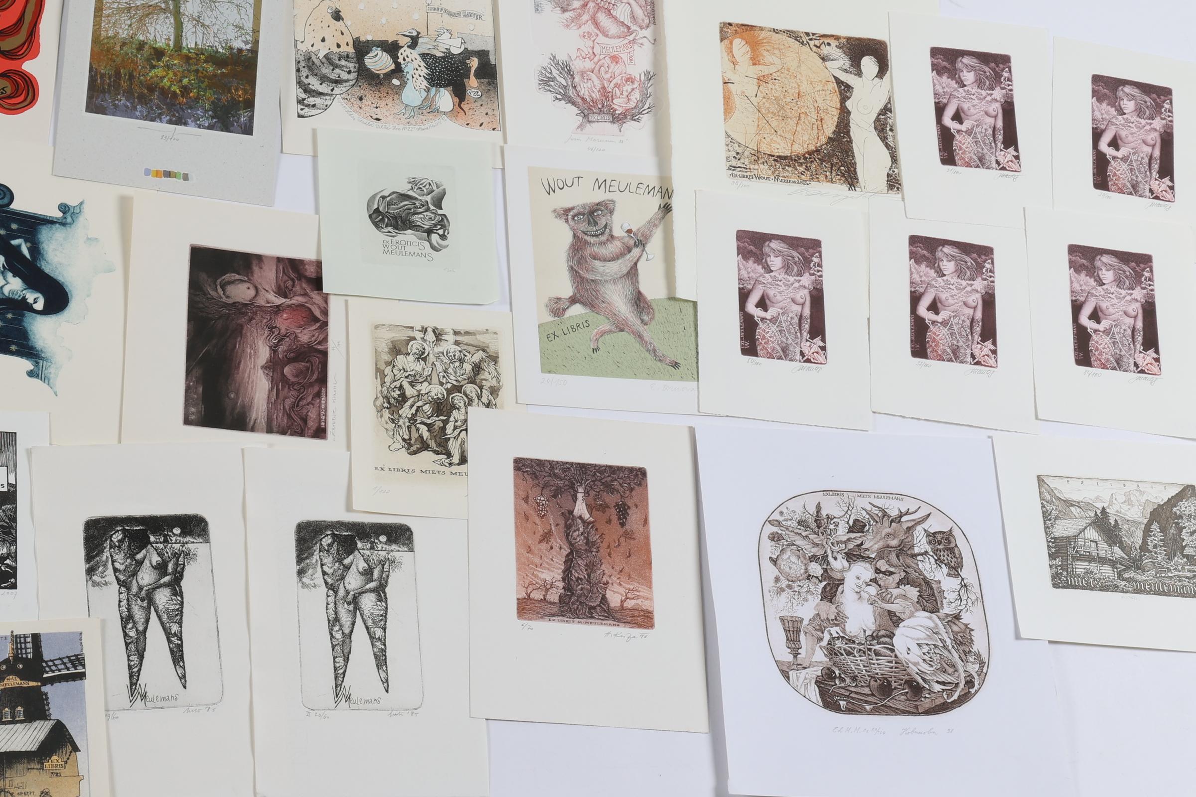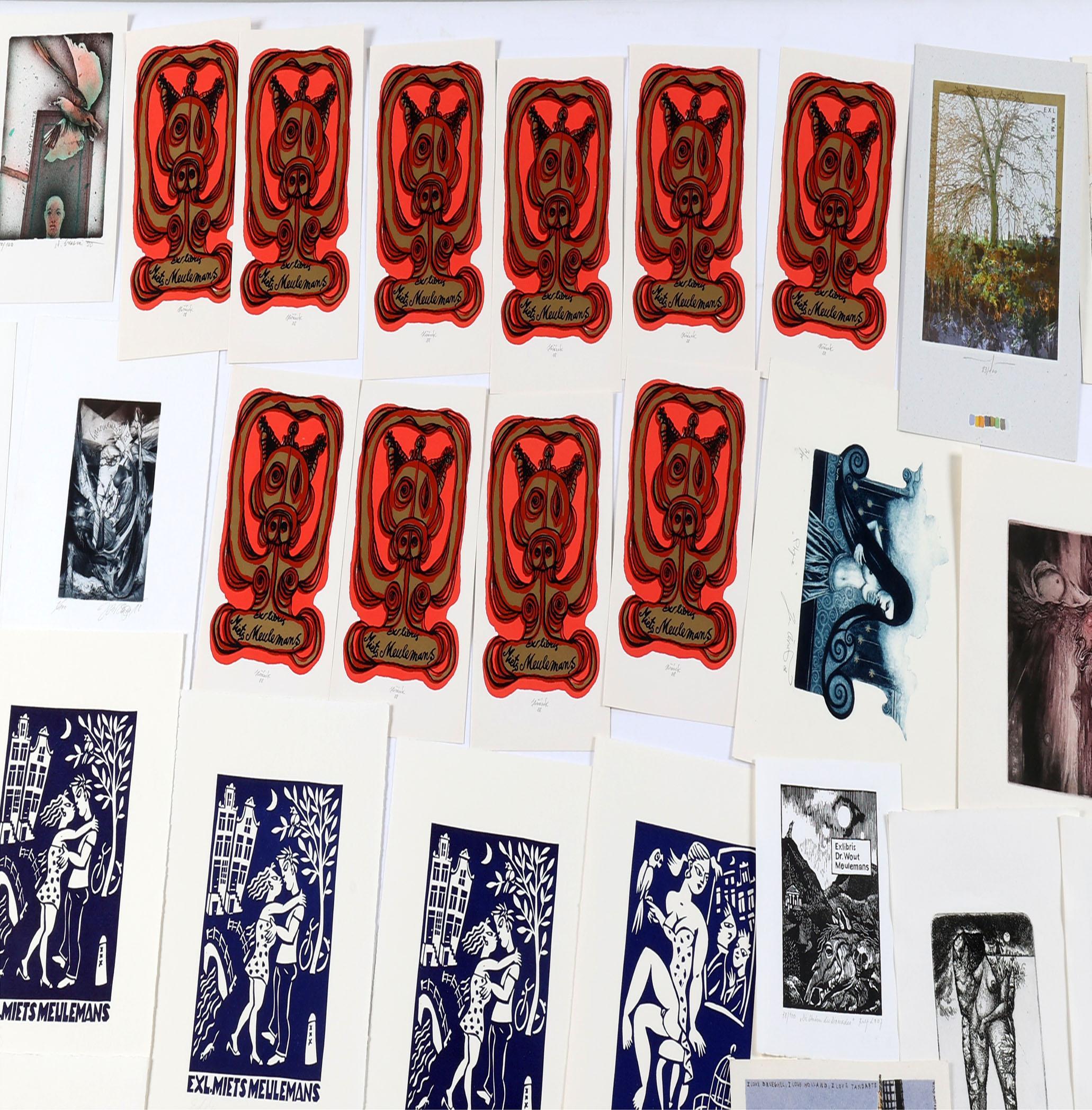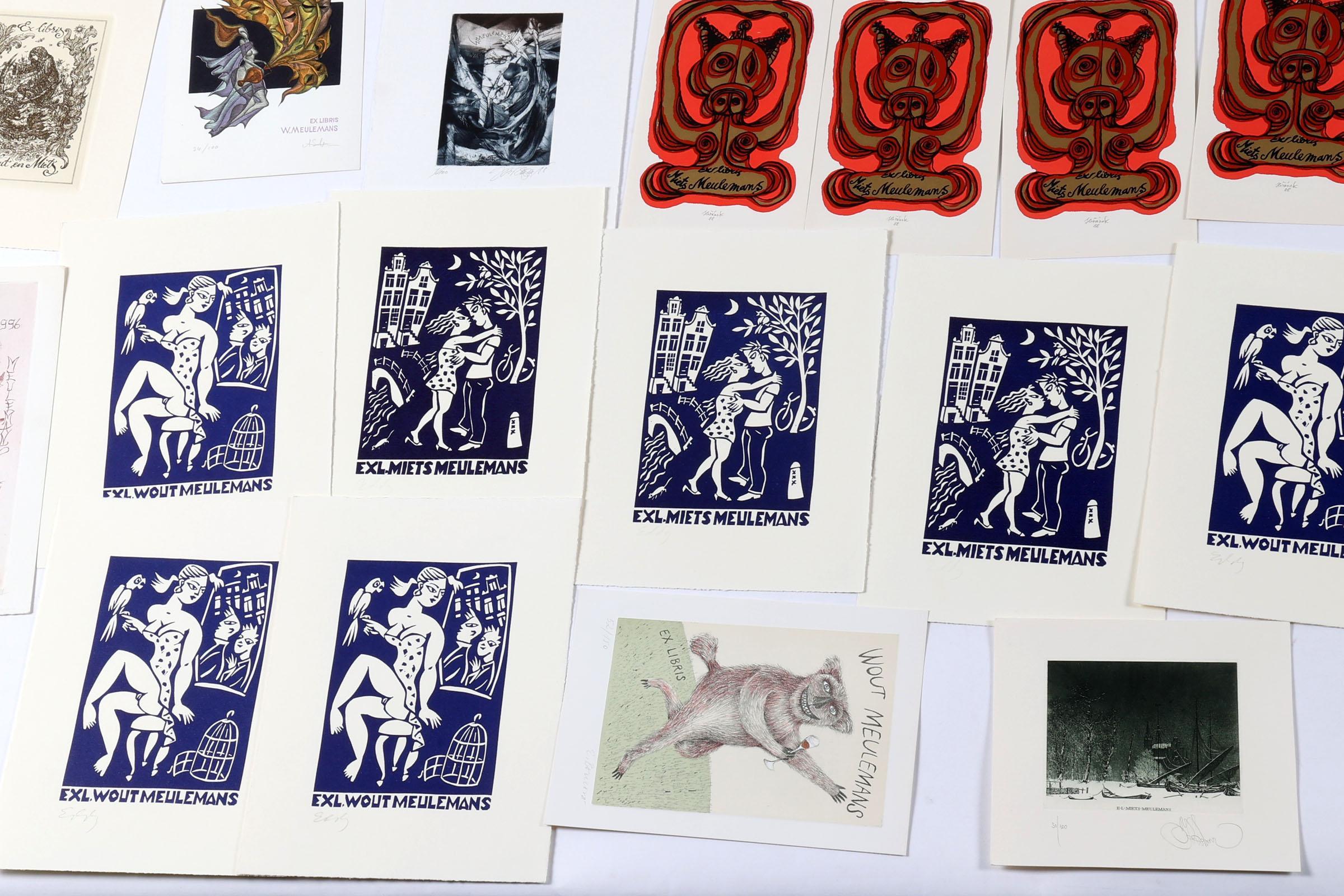 collectie van plm. 80 stuks exlibris en kleingrafiek op naam van Meulemans. Deels diepdruk, deels hoogdruk / vlakdruk. Deels gesigneerd. Bevat doubletten. Werk van o.a. J. Werner, Jakubowski, Saltenyte, Rulf, Battermann, Cernos, Benenson, Mezl, Jirka, Baeyens, etc.