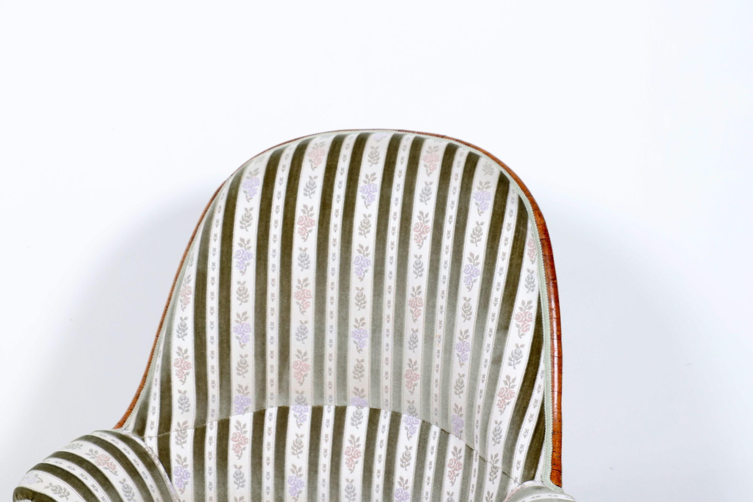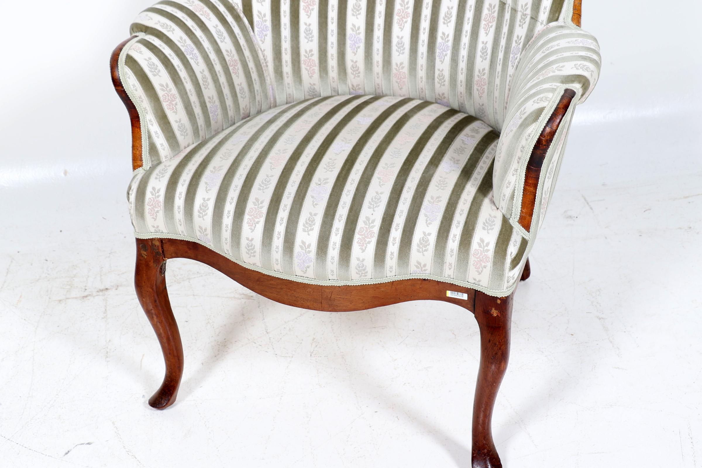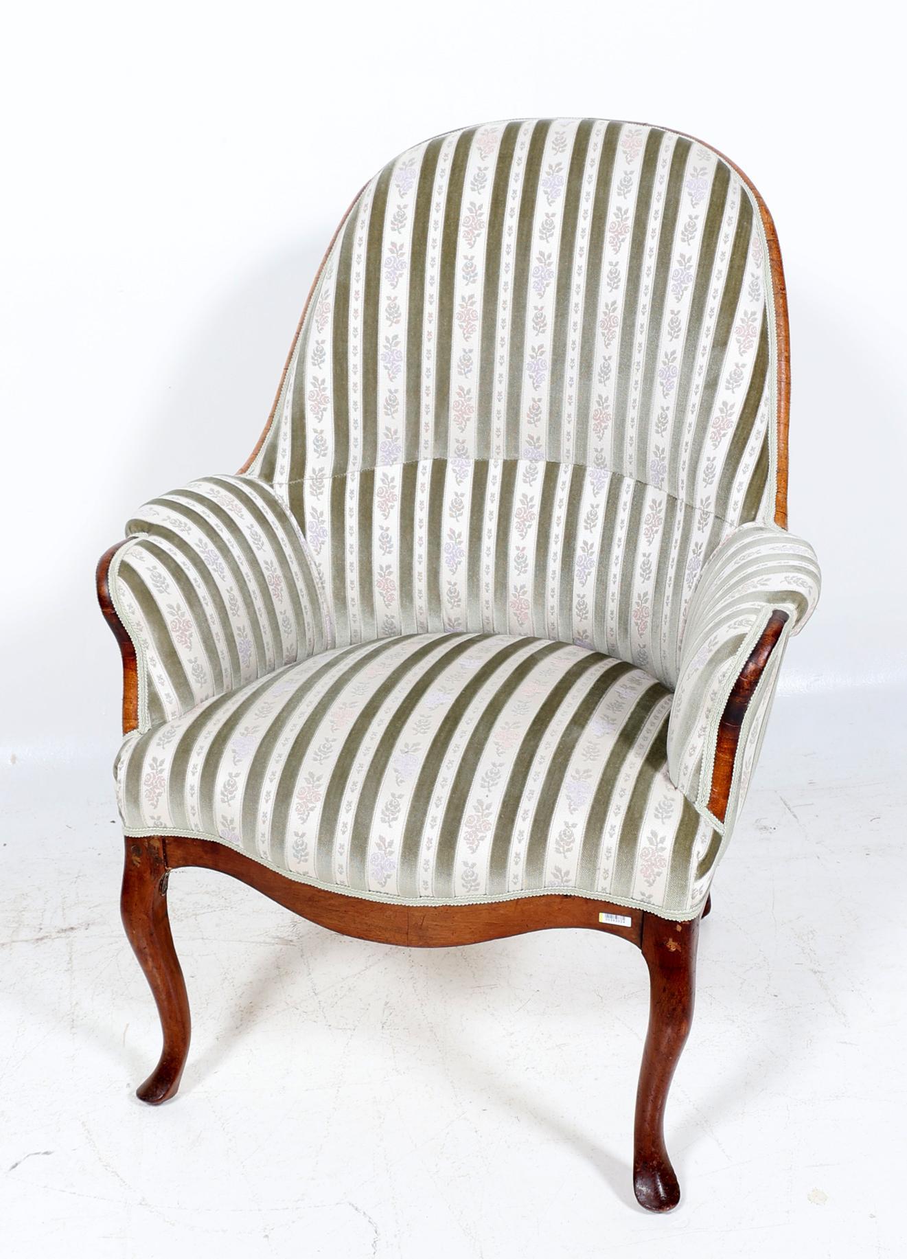 Antieke mahoniehouten voltaire met groen gestreepte stof bekleed