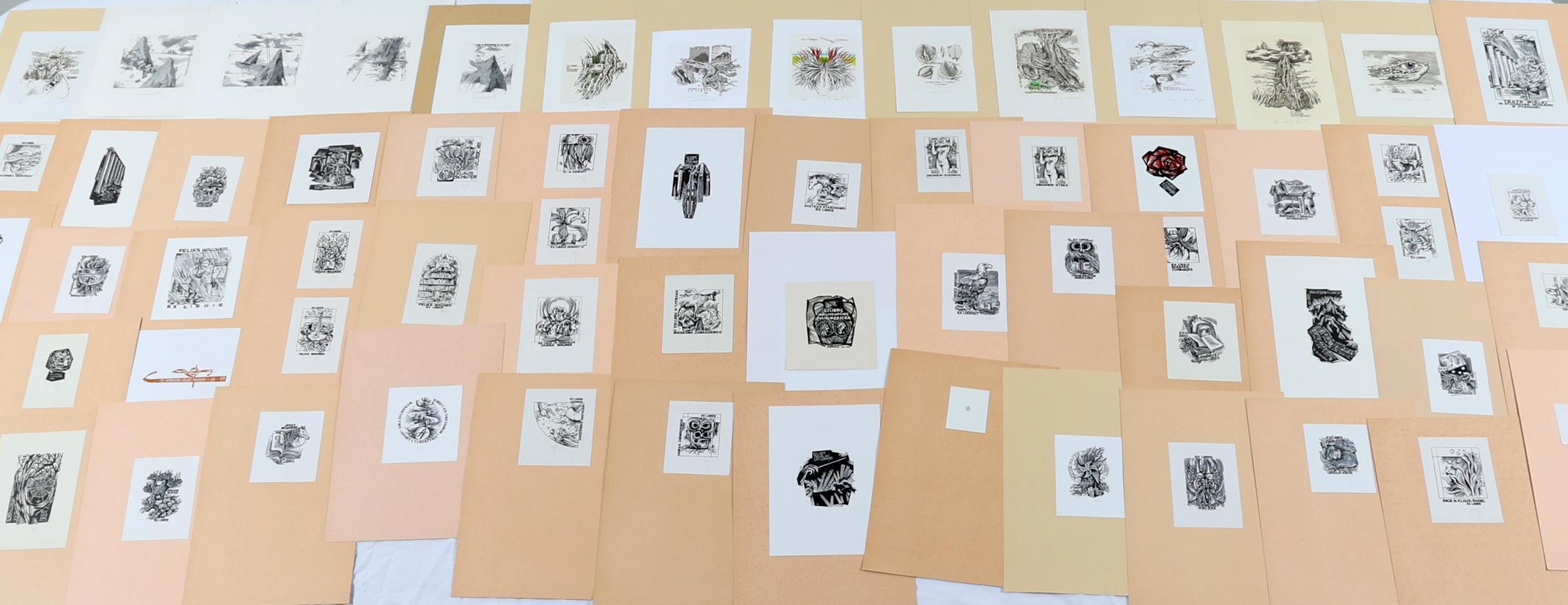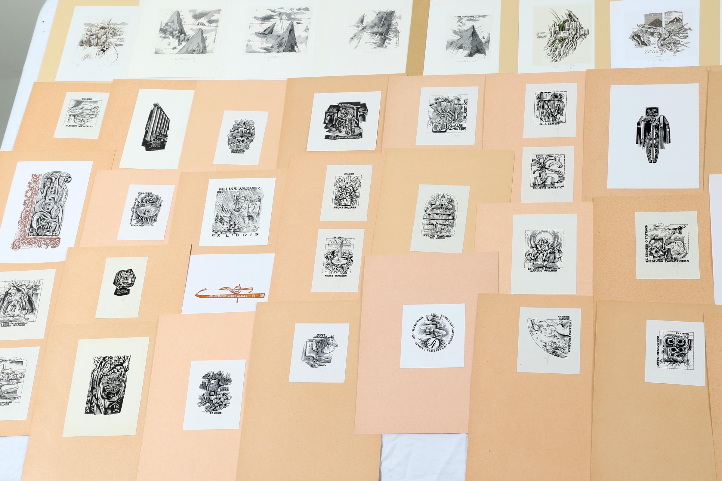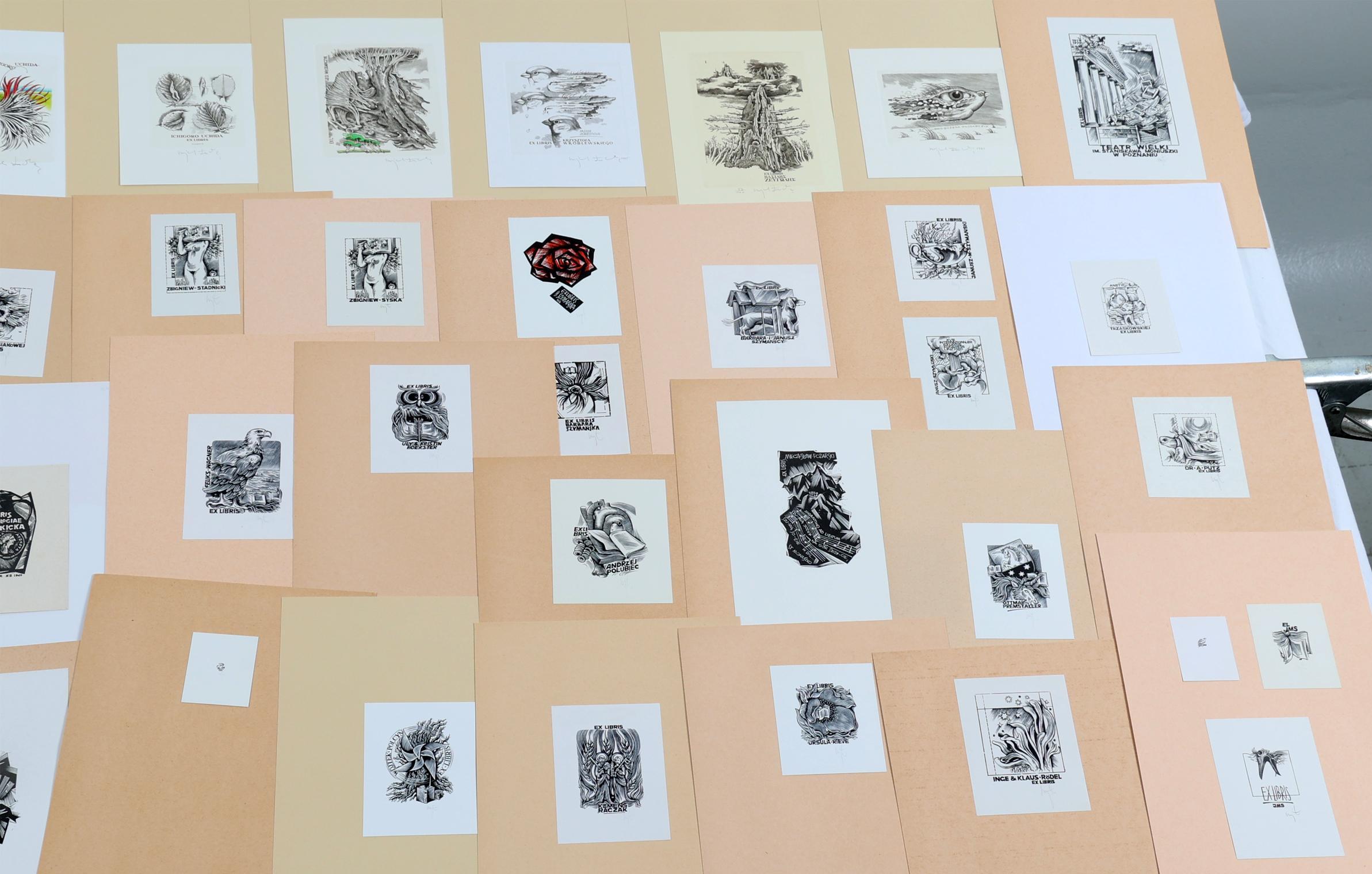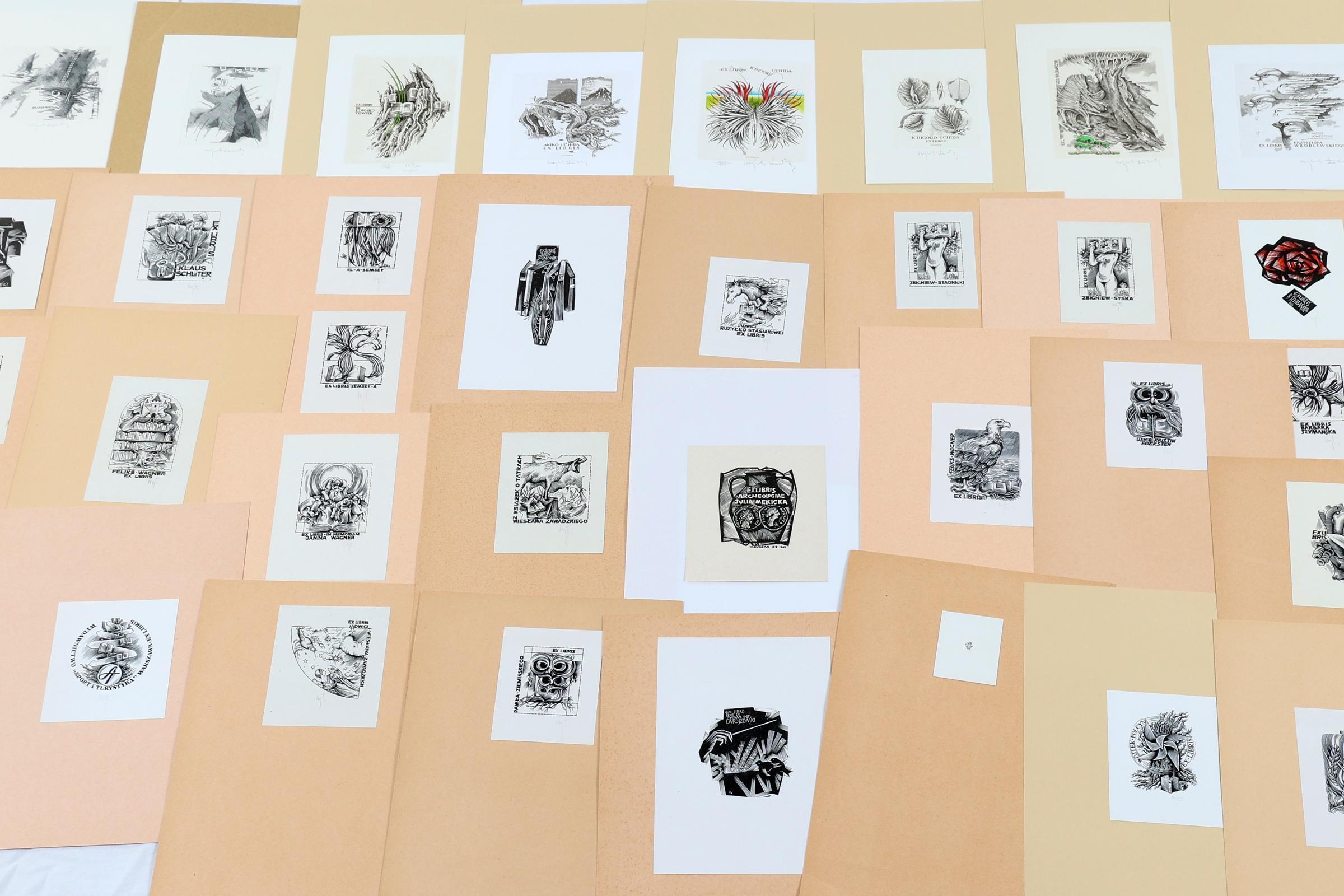 Luczak, W., plm. 60 exlibris (13 x diepdruk - sommige met de hand ingekleurd, 50 x hoogdruk), merendeel gesigneerd. Opgeplakt.