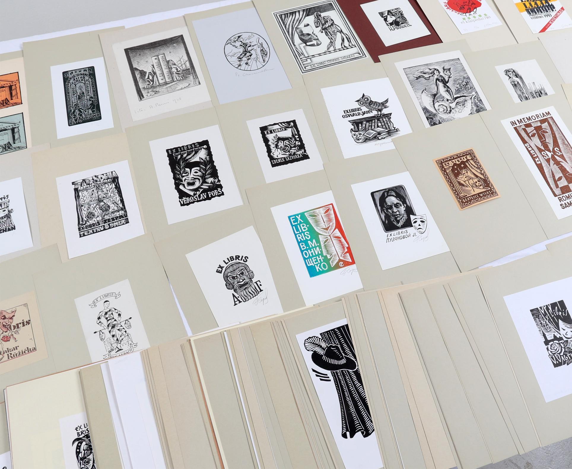 collectie van plm. 180 exlibris, thema: dramatische kunst, toneel. Hoogdruk /vlakdruk. Werk van o.a. De Wolff, Vermeylen, Sivac, Rytir, Rueter, Meeeuws. Deels gesigneerd, opgeplakt.