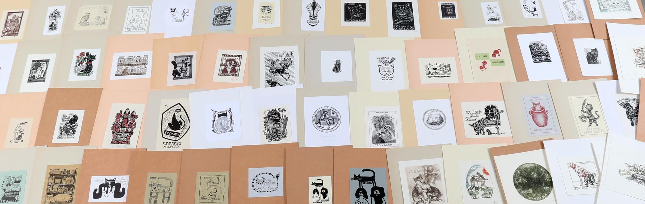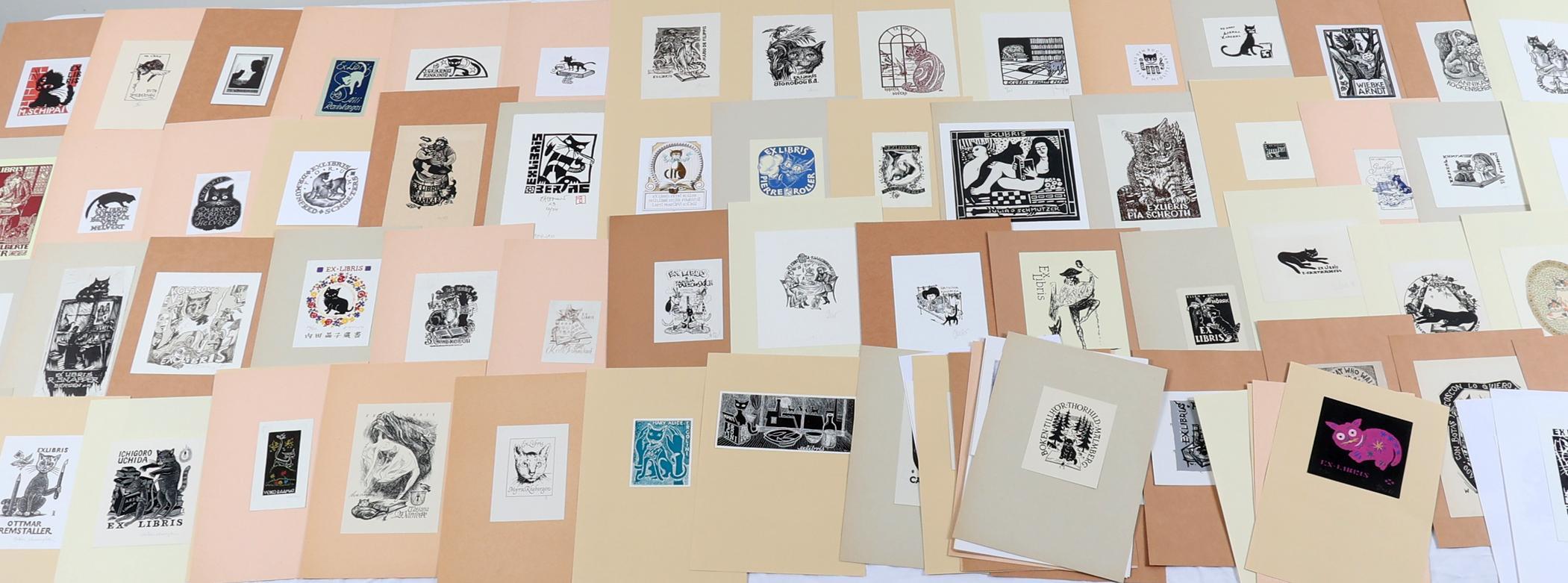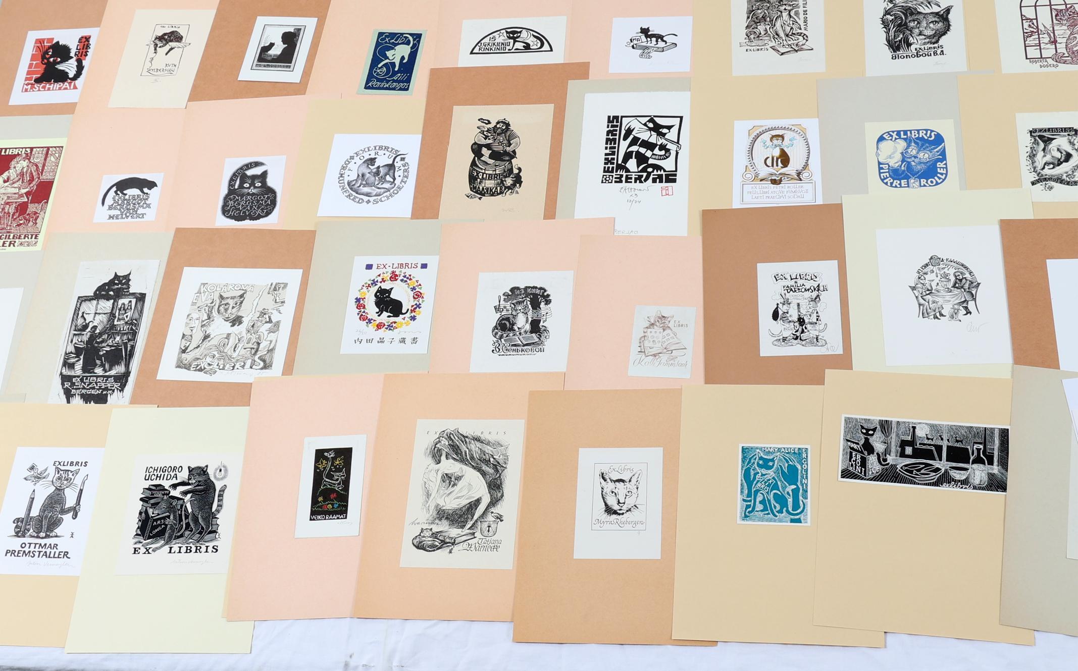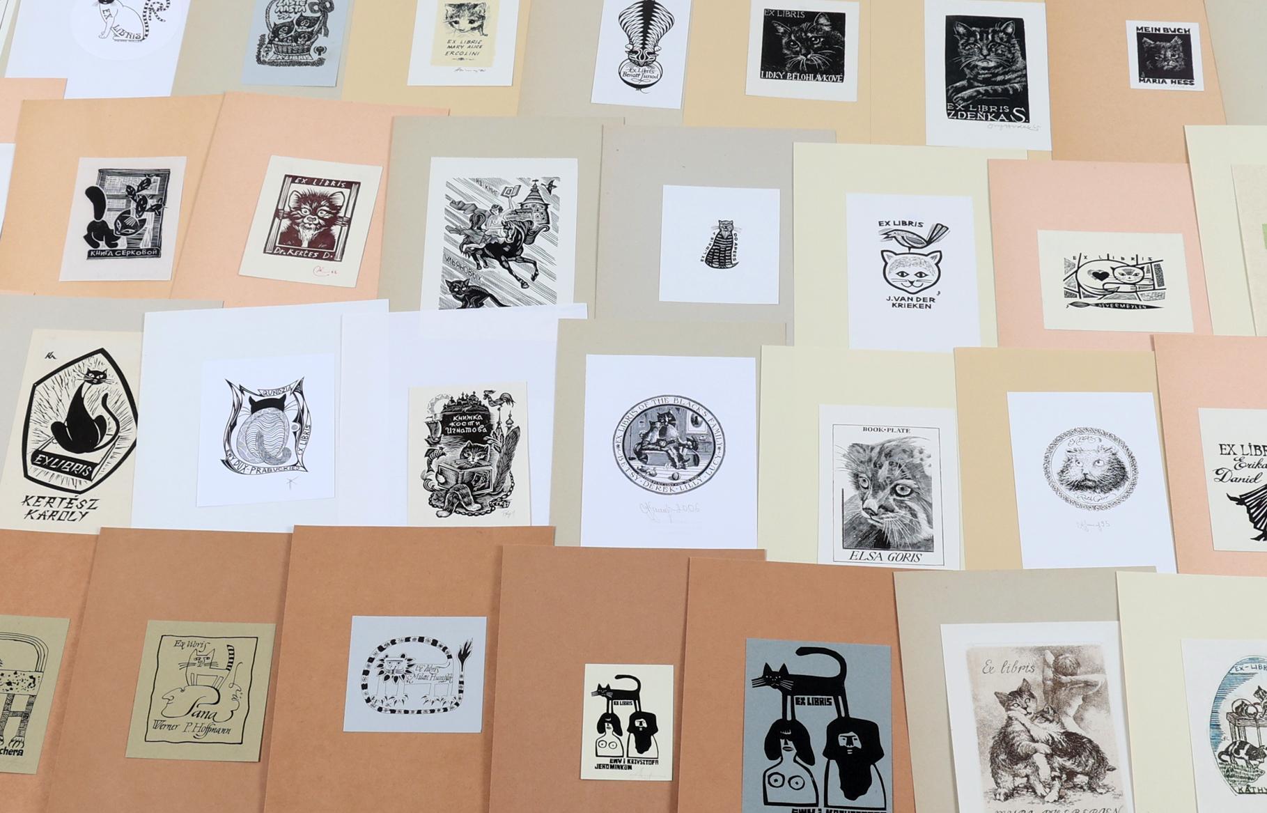 collectie van plm. 130 exlibris, thema: katten. Plm. 120 hoogdruk / vlakdruk, rest diepdruk. Plm. 70 x gesigneerd. Opgeplakt. Werk van o.a. Rueter, Schmuell, Vycholidova, Zwiers, De Koster, Wolf.